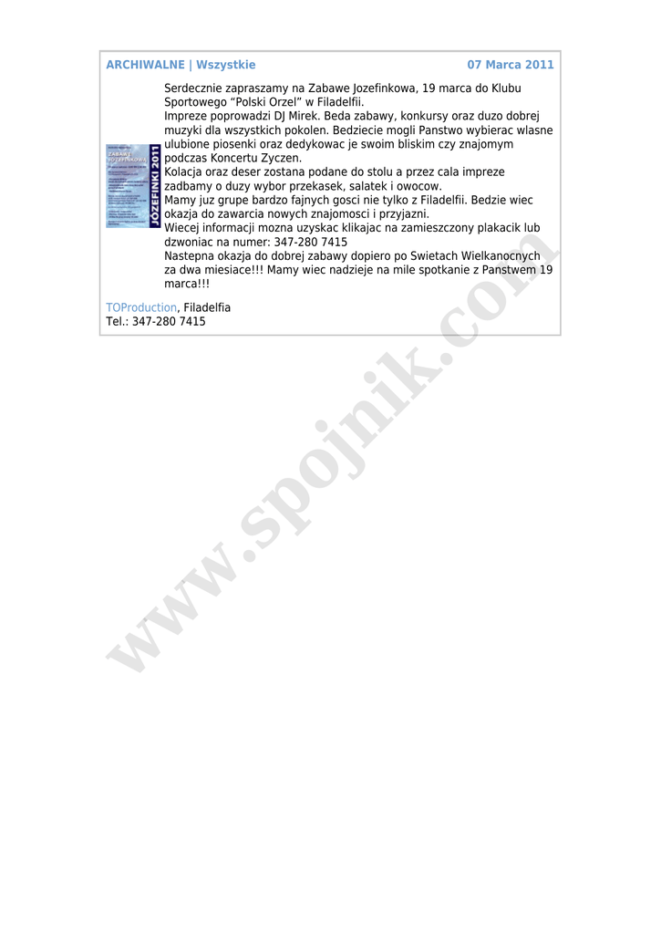 ARCHIWALNE | Wszystkie 07 Marca 2011 .c o m Serdecznie zapraszamy na Zabawe Jozefinkowa, 19 marca do Klubu Sportowego “Polski Orzel” w Filadelfii. Impreze poprowadzi DJ Mirek. Beda zabawy, konkursy oraz duzo dobrej muzyki dla wszystkich pokolen. Bedziecie mogli Panstwo wybierac wlasne ulubione piosenki oraz dedykowac je swoim bliskim czy znajomym podczas Koncertu Zyczen. Kolacja oraz deser zostana podane do stolu a przez cala impreze zadbamy o duzy wybor przekasek, salatek i owocow. Mamy juz grupe bardzo fajnych gosci nie tylko z Filadelfii. Bedzie wiec okazja do zawarcia nowych znajomosci i przyjazni. Wiecej informacji mozna uzyskac klikajac na zamieszczony plakacik lub dzwoniac na numer: 347-280 7415 Nastepna okazja do dobrej zabawy dopiero po Swietach Wielkanocnych za dwa miesiace!!! Mamy wiec nadzieje na mile spotkanie z Panstwem 19 marca!!! w w w .s po jn ik TOProduction, Filadelfia Tel.: 347-280 7415