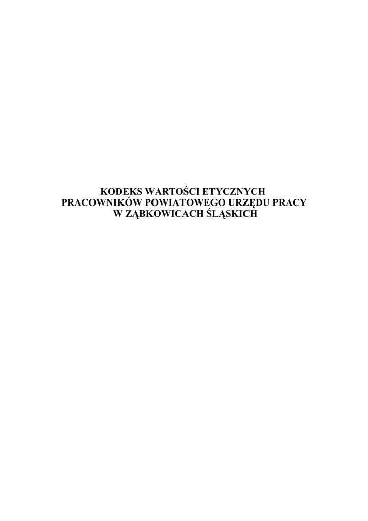 KODEKS WARTOŚCI ETYCZNYCH PRACOWNIKÓW POWIATOWEGO URZĘDU PRACY W ZĄBKOWICACH ŚLĄSKICH PREAMBUŁA Celem niniejszego kodeksu jest sprecyzowanie wartości i zasad zachowania pracowników Powiatowego Urzędu Pracy w Ząbkowicach Śląskich, związanych z pełnieniem przez nich obowiązków oraz poinformowanie klientów o standardach zachowań, jakich mają prawo oczekiwać od pracowników Powiatowego Urzędu Pracy w Ząbkowicach Śl. Kodeks wartości etycznych pracownika samorządowego ma na celu poprawę jakości pracy urzędnika, relacji między pracownikami urzędu oraz pracownikami a interesantami, zmianę funkcjonujących w świadomości społecznej stereotypów, a także kształtowanie postaw urzędnika opartych na wartościach moralnych. Kodeks wartości etycznych pracowników Powiatowego Urzędu Pracy w Ząbkowicach Śl. oparty został na fundamentalnych wartościach: uczciwości, sprawiedliwości, szacunku, prawdzie, godności, jawności i lojalności. I. POSTANOWIENIA WSTĘPNE Ilekroć w niniejszym kodeksie jest mowa o: 1. Kodeksie – należy przez to rozumieć Kodeks Wartości Etycznych pracowników Powiatowego Urzędu Pracy w Ząbkowicach Śl. 2. Pracowniku samorządowym – należy przez to rozumieć pracownika Powiatowego Urzędu Pracy w Ząbkowicach Śl. posiadającego status pracownika samorządowego, o którym mowa w art. 1 ustawy z dnia 22 marca 1990 r. o pracownikach samorządowych ( Dz. U. z 2001 r. Nr 142, poz. 1593 z późn. zm.). 3. Urzędzie – należy przez to rozumieć Powiatowy Urząd Pracy w Ząbkowicach Śl. oraz Filię PUP w Ziębicach. 4. Ustawie - należy przez to rozumieć Ustawę o promocji zatrudnienia i instytucjach rynku pracy z dnia 20 kwietnia 2004 r.(Dz.U. Nr 99, poz. 1001). 5. Konstytucji – należy przez to rozumieć Konstytucję Rzeczypospolitej Polskiej (tekst uchwalony w dniu 2 kwietnia 1997r. Przez Zgromadzenie Narodowe – Dz. U. z 1997 r. Nr 78 poz.483) II. ZASADY OGÓLNE 1. Kodeks wyznacza zasady postępowania pracowników samorządowych zatrudnionych w związku z wykonywaniem przez nich zadań publicznych tj. pełnieniem służby publicznej. 2. Zasady określone w niniejszym kodeksie mają być stosowane przez wszystkich pracowników posiadających status pracownika samorządowego, o którym mowa w art. 1 ustawy z dnia 22 marca 1990r. o pracownikach samorządowych. 3. Pracownicy samorządowi traktują pracę jako służbę publiczną, na zajmowanym stanowisku służą państwu i społecznościom lokalnym, przestrzegają porządku prawnego i wykonują powierzone zadania. 4. Pracownik samorządowy nie może brać udziału ani w jakikolwiek sposób – choćby pośrednio – uczestniczyć w czynnościach albo przedsięwzięciach, które podważałyby do niego zaufanie. 5. Pracownik samorządowy obowiązany jest przestrzegać norm prawnych, etycznych i moralnych, w tym zawartych w niniejszym kodeksie. 6. Pracownicy samorządowi, którzy wskutek postępowania, zarówno w miejscu pracy jak i poza nim ryzykują utratę zaufania niezbędnego przy wykonywaniu zadań publicznych naruszają normy niniejszego kodeksu. III. ZASADY POSTĘPOWANIA 1. Każdy pracownik samorządowy jest osobiście odpowiedzialny za swoje działania. 2. Pracownicy samorządowi pełniący służbę publiczną zobowiązani są dbać o wykonywanie zadań publicznych oraz o środki publiczne z uwzględnieniem interesu państwa, interesu wspólnoty samorządowej oraz indywidualnego interesu obywateli. 3. Pracownicy samorządowi powinni przy wykonywaniu w szczególności przestrzegać i stosować następujące zasady: - praworządności, - bezstronności i bezinteresowności, - uczciwości i rzetelności, - odpowiedzialności, - obiektywności, - jawności postępowania, - dbałości o dobre imię urzędu i pracowników samorządowych, swoich obowiązków - godnego zachowania w miejscu pracy i poza nim, - uprzejmości i życzliwości w kontaktach z interesantami, zwierzchnikami i współpracownikami. 4. Pracownik samorządowy pamiętając o służebnym charakterze własnej pracy, wykonuje ją z poszanowaniem godności innych i poczuciem godności własnej, przedkłada dobro publiczne nad interesy własne i swojego środowiska. IV. WYKONYWANIE ZADAŃ 1. Służba publiczna opiera się na zaufaniu publicznym i wymaga od pracowników samorządowych poszanowania Konstytucji i prawa oraz stawiania interesu publicznego ponad interes osobisty. Obywatele oczekują od pracowników samorządowych wysokich standardów etycznych zachowań. 2. Pracownicy samorządowi pełnią urząd w ramach prawa i działają zgodnie z prawem. Podejmowane przez nich rozstrzygnięcia i decyzje posiadają podstawę prawną, ich treść jest zgodna z obowiązującymi przepisami prawa zawierają uzasadnienie oraz informację o możliwości odwołania. 3. Pracownicy samorządowi działają bezstronnie i bezinteresownie. 4. Pracownicy samorządowi nie uczestniczą w podejmowaniu decyzji , naradach, opiniowaniu i głosowaniu w sprawach, w których mają bezpośredni lub pośredni interes osobisty. 5. Pracownicy samorządowi nie wykorzystują i nie pozwalają na wykorzystanie powierzonych im zasobów, kadr i mienia publicznego w celach prywatnych. 6. Pracownicy samorządowi nie podejmują prac ani zajęć kolidujących z pełnionymi obowiązkami służbowymi. 7. Pracownicy samorządowi nie podejmują arbitralnych decyzji, które mogą mieć negatywny wpływ na sytuację obywateli oraz powstrzymują się od wszelkich form faworyzowania. 8. Pracownicy samorządowi nie ulegają wpływom i naciskom politycznym, które mogą prowadzić do działań stronniczych lub sprzecznych z interesem publicznym. 9. Pracownicy samorządowi pełniąc obowiązki kierują się interesem wspólnoty samorządowej i nie czerpią korzyści materialnych ani osobistych z tego tytułu, nie działają też w prywatnym interesie osób lub grup osób 10. Pracownicy samorządowi nie dopuszczają do powstania konfliktu interesów między intere