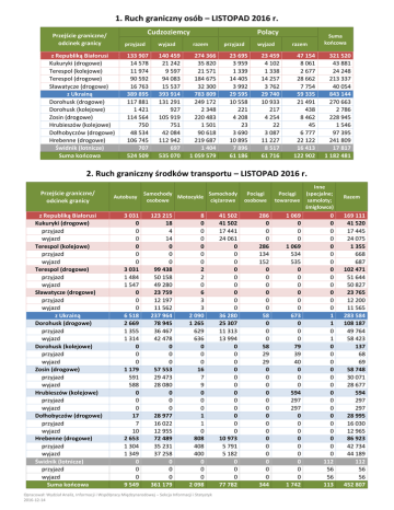 1. Ruch graniczny osób – LISTOPAD 2016 r. Cudzoziemcy Przejście graniczne/ odcinek granicy przyjazd z Republiką Białorusi Kukuryki (drogowe) Terespol (kolejowe) Terespol (drogowe) Sławatycze (drogowe) z Ukrainą Dorohusk (drogowe) Dorohusk (kolejowe) Zosin (drogowe) Hrubieszów (kolejowe) Dołhobyczów (drogowe) Hrebenne (drogowe) Świdnik (lotnicze) Suma końcowa 133 907 14 578 11 974 90 592 16 763 389 895 117 881 1 421 114 564 750 48 534 106 745 707 524 509 wyjazd 140 459 21 242 9 597 94 083 15 537 393 914 131 291 927 105 919 751 42 084 112 942 697 535 070 Polacy razem 274 366 35 820 21 571 184 675 32 300 783 809 249 172 2 348 220 483 1 501 90 618 219 687 1 404 1 059 579 przyjazd 23 695 3 959 1 339 14 405 3 992 29 595 10 558 221 4 208 23 3 690 10 895 7 896 61 186 wyjazd 23 459 4 102 1 338 14 257 3 762 29 740 10 933 217 4 254 22 3 087 11 227 8 517 61 716 razem Suma końcowa 47 154 8 061 2 677 28 662 7 754 59 335 21 491 438 8 462 45 6 777 22 122 16 413 122 902 321 520 43 881 24 248 213 337 40 054 843 144 270 663 2 786 228 945 1 546 97 395 241 809 17 817 1 182 481 2. Ruch graniczny środków transportu – LISTOPAD 2016 r. Przejście graniczne/ odcinek granicy z Republiką Białorusi Kukuryki (drogowe) przyjazd wyjazd Terespol (kolejowe) przyjazd wyjazd Terespol (drogowe) przyjazd wyjazd Sławatycze (drogowe) przyjazd wyjazd z Ukrainą Dorohusk (drogowe) przyjazd wyjazd Dorohusk (kolejowe) przyjazd wyjazd Zosin (drogowe) przyjazd wyjazd Hrubieszów (kolejowe) przyjazd wyjazd Dołhobyczów (drogowe) przyjazd wyjazd Hrebenne (drogowe) przyjazd wyjazd Świdnik (lotnicze) przyjazd wyjazd Suma końcowa Autobusy 3 031 0 0 0 0 0 0 3 031 1 484 1 547 0 0 0 6 518 2 669 1 355 1 314 0 0 0 1 179 591 588 0 0 0 17 7 10 2 653 1 304 1 349 0 0 0 9 549 Samochody Samochody Motocykle osobowe ciężarowe 123 215 18 4 14 0 0 0 99 438 50 158 49 280 23 759 12 197 11 562 237 964 78 945 36 467 42 478 0 0 0 57 553 29 473 28 080 0 0 0 28 977 16 022 12 955 72 489 35 231 37 258 0 0 0 361 179 8 0 0 0 0 0 0 2 2 0 6 3 3 2 090 1 265 629 636 0 0 0 16 7 9 0 0 0 1 1 0 808 408 400 0 0 0 2 098 Opracował: Wydział Analiz, Informacji i Współpracy Międzynarodowej – Sekcja Informacji i Statystyk 2016-12-14 41 502 41 502 17 441 24 061 0 0 0 0 0 0 0 0 0 36 280 25 307 11 313 13 994 0 0 0 0 0 0 0 0 0 0 0 0 10 973 5 791 5 182 0 0 0 77 782 Pociągi osobowe 286 0 0 0 286 134 152 0 0 0 0 0 0 58 0 0 0 58 29 29 0 0 0 0 0 0 0 0 0 0 0 0 0 0 0 344 Pociągi towarowe Inne (specjalne; samoloty; śmigłowce) 1 069 0 0 0 1 069 534 535 0 0 0 0 0 0 673 0 0 0 79 39 40 0 0 0 594 297 297 0 0 0 0 0 0 0 0 0 1 742 0 0 0 0 0 0 0 0 0 0 0 0 0 1 1 0 1 0 0 0 0 0 0 0 0 0 0 0 0 0 0 0 112 56 56 113 Razem 169 111 41 520 17 445 24 075 1 355 668 687 102 471 51 644 50 827 23 765 12 200 11 565 283 584 108 187 49 764 58 423 137 68 69 58 748 30 071 28 677 594 297 297 28 995 16 030 12 965 86 923 42 734 44 189 112 56 56 452 807