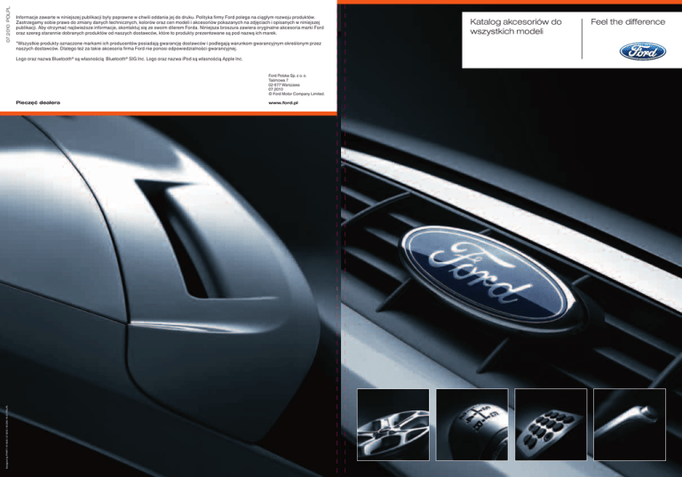 07.2010 POLPL Informacje zawarte w niniejszej publikacji były poprawne w chwili oddania jej do druku. Polityka firmy Ford polega na ciągłym rozwoju produktów. Zastrzegamy sobie prawo do zmiany danych technicznych, kolorów oraz cen modeli i akcesoriów pokazanych na zdjęciach i opisanych w niniejszej publikacji. Aby otrzymać najświeższe informacje, skontaktuj się ze swoim dilerem Forda. Niniejsza broszura zawiera oryginalne akcesoria marki Ford oraz szereg starannie dobranych produktów od naszych dostawców, które to produkty prezentowane są pod nazwą ich marek. *Wszystkie produkty oznaczone markami ich producentów posiadają gwarancję dostawców i podlegają warunkom gwarancyjnym określonym przez naszych dostawców. Dlatego też za takie akcesoria firma Ford nie ponosi odpowiedzialności gwarancyjnej. Logo oraz nazwa Bluetooth® są własnością Bluetooth® SIG Inc. Logo oraz nazwa iPod są własnością Apple Inc. Ford Polska Sp. z o. o. Taśmowa 7 02-677 Warszawa 07.2010 © Ford Motor Company Limited. Designed by PHWT | K11840 | 07.2010 | 35.000 | N+S | POLPL Pieczęć dealera www.ford.pl Katalog akcesoriów do wszystkich modeli All-model accessory catalogue Feel the difference Spis treści Wystrój Ka od 11/2008 Ka 1996 – 08/2008/ Sportka/Streetka Fiesta od 09/2008 Fiesta 2001 – 08/2008 Fusion Focus od 2004 Focus Coupé-Cabriolet Focus 1998 – 2004 C-MAX Kuga Mondeo od 03/2007 Mondeo 2000 – 03/2007 Galaxy 2000-2005/od 2006 S-MAX Ranger od 2006 Transit/Tourneo Connect Koła z lekkich stopów/ akcesoria do kół 6 10 12 14 16 18 21 22 24 26 28 30 32 34 36 38 42 Akcesoria ogólne Transport Ochrona samochodu Akcesoria drogowe Bezpieczeństwo Systemy informacyjnorozrywkowe Komfort 60 74 83 84 86 90 Wystrój 5 *wybrany dostawca Forda Poczuj różnicę. Twój Ford został elegancko zaprojektowany i pięknie wykonany, aby Twoją podróż przez życie uczynić pełną zarówno inspiracji, jak i poczucia spokoju. To wybór stylu życia, który doskonale wpisze się w Twój świat. Teraz, dzięki naszej bogatej ofercie akcesoriów, dajemy Ci znacznie większy wybór, co sprawi, że twój Ford będzie od stóp do głów wyjątkowy i jedyny w swoim rodzaju. Będzie Twoim Fordem. Począwszy od pięknie wystylizowanego wnętrza, a na zestawach ozdobnych kończąc, nasze akcesoria zostały tak zaprojektowane i przetestowane, by idealnie pasować do Twojego Forda i Twojego życia. Wszystkie ceny zawierają podatek VAT, prosimy zapytać lokalnego dealera Forda o dodatkowe opłaty za montaż i kolory (jeśli jest to uzasadnione). Ceny obowiązują w momencie druku i mogą ulec zmianom lub poprawkom. 4 Wystrój FordKa Wystrój 7 od 11/2008 *wybrany dostawca Forda Nowy Ford Ka wprost uwielbia przebieranki. Jeśli więc pragniesz mieć jeszcze większą frajdę z jazdy najbardziej odjechanym samochodem na drodze, może warto już teraz wybrać swój własny styl spośród szykownych i fantazyjnych części ozdobnych i akcesoriów? Zmień wnętrze swojego samochodu, począwszy od pedałów i gałki zmiany biegów, lub wpraw wszystkich w zdumienie niesamowicie atrakcyjnymi pasami sportowymi i dodatkami karoserii. Wszystkie te dodatki sprawią, że Twój Ka będzie wyglądał jeszcze lepiej i atrakcyjniej, a Ty na sam jego widok będziesz uśmiechać się z zadowoleniem i satysfakcją. Sportowe aluminiowe nakładki na pedały Ozdobna kratownica atrapy wlotu powietrza do chłodnicy Zagruntowana, do pomalowania na kolor karoserii lub kontrastujący, z czarną wkładką siatkową 1 554 162 542,00 zł 1 570 397 Tylny spojler Paski ozdobne Kalkomania Zagruntowany, do polakierowania na kolor karoserii, nadaje Twojemu samochodowi drapieżny, sportowy wygląd Biały, zestaw folii samoprzylepnych Na dach, stylowy samoprzylepny “tatuaż” w kolorze antracytowym i srebrnym, do pojazdów bez szyberdachu 1 544 148 682,00 zł Na dach, maskę i tył, do pojazdów bez spojlera 1 570 430 764,00 zł Na dach, maskę i tył, do pojazdów ze spojlerem Nasadka na końcówkę rury wydechowej Do silników Diesla 1 633 884 222,00 zł 322,00 zł Zdjęcie tylko w celu przykładowej prezentacji 813,00 zł 492,00 zł Pokazane paski ozdobne są także dostępne w kolorze Jump (zielony) oraz czerwonym Sunrise-Red 619,00 zł Na błotnik, zestaw 2 sztuk stylowy samoprzylepny “tatuaż” w kolorze antracytowym i srebrnym 1 570 397 Na bok 1 570 425 Do silników benzynowych 1 633 883 1 570 431 1 570 445 204,00 zł Rajdowy numer startowy, zestaw składający się jednego białego koła i czarnych cyfr od 0 do 9, do umieszczenia na masce lub drzwiach 1 570 696 207,00 zł 1 573 470 Skórzana kierownica Dla poczucia wyjątkowej klasy, ze zdalnym sterowaniem systemem audio Czarny, z wkładką biało-perłową 1 573 470 594,00 zł Czarny/Czerwony, z wkładką biało-perłową 1 573 500 594,00 zł Dark Florida, z wkładką biało-perłową 1 573 438 594,00 zł Jump (zielony)/Czarny 1 573 519 594,00 zł Zestaw z 3 nakładkami na pedały i bez podnóżka, wszystkie elementy z wkładką z antypoślizgowej gumy, do modeli z ręczną skrzynią biegów 1 576 661 279,00 zł Eibach* Zestaw do sportowego trybu obniżania zawieszenia Zrównoważony komfort w normalnych warunkach, dynamiczny i sportowy aż do granic możliwości eksploatacyjnych, obniża pojazd o 30 mm Do wszystkich silników benzynowych, od 12/2008 1 569 240 578,00 zł Do wszystkich silników Diesla 1 595 241 Pokazane skórzane kierownice są także dostępne bez pilota sterowania audio Ozdobne nakładki ochronne na progi Wzór 3D, zestaw 2 szt., z logo Ka 1 557 359 178,00 zł Felgi aluminiowe Ford Ka znajdują się na str. 45; akcesoria stylizacyjne patrz str. 58. 617,00 zł Wszystkie ceny zawierają podatek VAT, prosimy zapytać lokalnego dealera Forda o dodatkowe opłaty za montaż i kolory (jeśli jest to uzasadnione). Ceny obowiązują w momencie druku i mogą ulec zmianom lub poprawkom. 6 Wystrój FordKa Wystrój 9 *wybrany dostawca Forda od 11/2008 (c.d.) MS