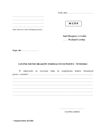 Łódź, dnia ……………………………… …………………………………….. …………………………………….. …………………………………….. WZÓR …………………………………….. (dane adresowe osoby składającej pismo) Sąd Okręgowy w Łodzi …… Wydział Cywilny Sygn. akt …………………… UZUPEŁNIENIE BRAKÓW FORMALNYCH POZWU / WNIOSKU W odpowiedzi na wezwanie Sądu do uzupełnienia braków formalnych pozwu / wniosku*…………………………………………………............................................. ………………………………………………………………………………………………….. …..……………………………………………………………………………………………… ………………………………………………………………………………………………….. ………………………………………………………………………………………………….. ………………………………………………………………………………………………….. ………………………………………………………………………………………………….. ……………………………. (czytelny podpis) * niepotrzebne skreślić
