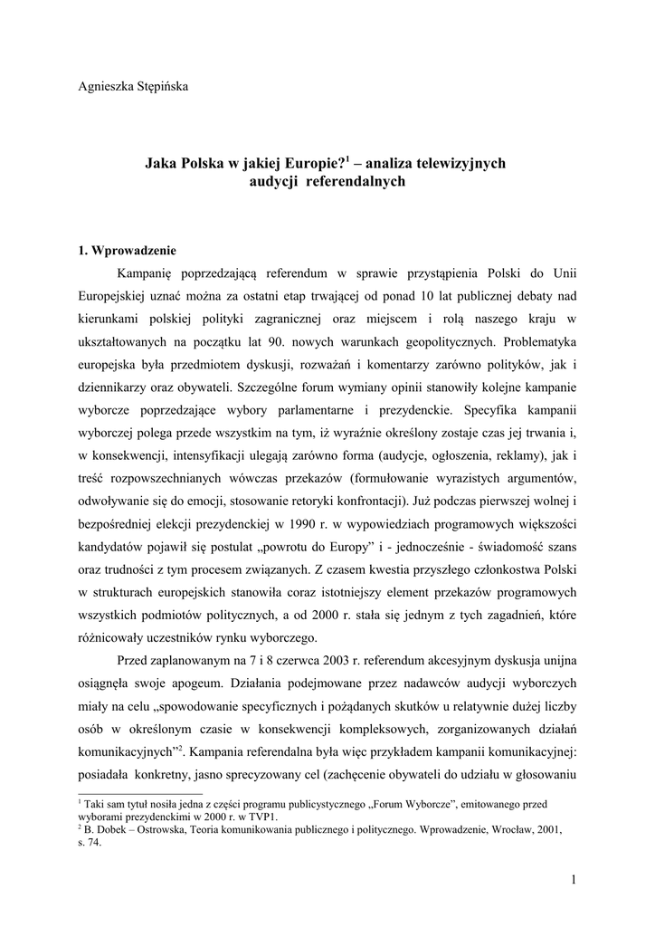 Agnieszka Stępińska Jaka Polska w jakiej Europie?1 – analiza telewizyjnych audycji referendalnych 1. Wprowadzenie Kampanię poprzedzającą referendum w sprawie przystąpienia Polski do Unii Europejskiej uznać można za ostatni etap trwającej od ponad 10 lat publicznej debaty nad kierunkami polskiej polityki zagranicznej oraz miejscem i rolą naszego kraju w ukształtowanych na początku lat 90. nowych warunkach geopolitycznych. Problematyka europejska była przedmiotem dyskusji, rozważań i komentarzy zarówno polityków, jak i dziennikarzy oraz obywateli. Szczególne forum wymiany opinii stanowiły kolejne kampanie wyborcze poprzedzające wybory parlamentarne i prezydenckie. Specyfika kampanii wyborczej polega przede wszystkim na tym, iż wyraźnie określony zostaje czas jej trwania i, w konsekwencji, intensyfikacji ulegają zarówno forma (audycje, ogłoszenia, reklamy), jak i treść rozpowszechnianych wówczas przekazów (formułowanie wyrazistych argumentów, odwoływanie się do emocji, stosowanie retoryki konfrontacji). Już podczas pierwszej wolnej i bezpośredniej elekcji prezydenckiej w 1990 r. w wypowiedziach programowych większości kandydatów pojawił się postulat „powrotu do Europy” i - jednocześnie - świadomość szans oraz trudności z tym procesem związanych. Z czasem kwestia przyszłego członkostwa Polski w strukturach europejskich stanowiła coraz istotniejszy element przekazów programowych wszystkich podmiotów politycznych, a od 2000 r. stała się jednym z tych zagadnień, które różnicowały uczestników rynku wyborczego. Przed zaplanowanym na 7 i 8 czerwca 2003 r. referendum akcesyjnym dyskusja unijna osiągnęła swoje apogeum. Działania podejmowane przez nadawców audycji wyborczych miały na celu „spowodowanie specyficznych i pożądanych skutków u relatywnie dużej liczby osób w określonym czasie w konsekwencji kompleksowych, zorganizowanych działań komunikacyjnych”2. Kampania referendalna była więc przykładem kampanii komunikacyjnej: posiadała konkretny, jasno sprecyzowany cel (zachęcenie obywateli do udziału w głosowaniu 1 Taki sam tytuł nosiła jedna z części programu publicystycznego „Forum Wyborcze”, emitowanego przed wyborami prezydenckimi w 2000 r. w TVP1. 2 B. Dobek – Ostrowska, Teoria komunikowania publicznego i politycznego. Wprowadzenie, Wrocław, 2001, s. 74. 1 i do poparcia określonej opcji w referendum), była skierowana do szerokiej publiczności (obywatele posiadający czynne prawo wyborcze), miała (prawnie) określone ramy czasowe oraz stanowiła zespół powiązanych ze sobą i zaplanowanych wcześniej czynności komunikacyjnych (obok emisji audycji w mediach elektronicznych na czynności te składały się m.in.: marsze, wiece, spotkania, konferencje, kursy i szkolenia oraz plakaty)3. Biorąc pod uwagę cel kampanii referendalnej oraz podejmowane w jej ramach działania była ona przykładem komunikowania prowokującego do określonych zachowań, czyli kampanii odnoszącej się do informacji i perswazji jako środków psychologicznego oddziaływania. W znacznie mniejszym stopniu było to natomiast komunikowanie informacyjne (mające zwiększyć świadomość i wiedzę) i perswazyjne (wykształcającym nowe postawy lub zmieniającym dotychczas istniejące) – na tego typu działania w okresie bezpośrednio poprzedzającym dni głosowania było już zdecydowanie za późno (oba typy to komunikowanie długotrwałe, które powinny poprzedzać, a następnie uzupełniać działania reklamowo - promocyjne). Celem niniejszej pracy jest prezentacja wyników analizy jakościowej audycji wyborczych przygotowanych i rozpowszechnianych przed referendum. Do badań wybranych zostało 60 audycji, które emitowane były w TVP1 i TVP3 (Poznań) – czyli 1 stacji ogólnopolskiej i 1 stacji regionalnej telewizji publicznej. W sumie w wybranych blokach audycji zaprezentowanych miało być 77 audycji, jednak 17 podmiotów nie dostarczyło swoich przekazów (alfabetyczna lista tych, które dostarczyły znajduje się w aneksie). Zdecydowana większość badanych audycji (42) przygotowana została przez zwolenników przystąpienia Polski do UE, apele o głosowanie na NIE zawierało 12 audycji, zaś 6 pozostałych nie zachęcało bezpośrednio do żadnej z opcji. Do tej ostatniej grupy należały audycje, których głównym celem było nakłanianie obywateli do udziału w referendum lub też promocja określonej instytucji, fundacji, organizacji czy też stowarzyszenia (np. Krajowy Związek Kierowców i Przewoźników Drogowych, Fundacja Rozwoju Przedsiębiorczości, czy też Fundacja Akademia Promocji). Wśród wspomnianych wyżej trzech głównych typów grup wyróżnić można kilka bardziej szczegółowych postaw wobec polskiej integracji z UE. I tak, zwolenników członkostwa Polski w strukturach unijnych podzielić można na entuzjastów (tak!) i umiarkowanych reprezentantów opcji (tak, ale...). Natomiast wśród przeciwników wyodrębnić można było tych, którzy w swoich przekazach koncentrowali się na krytyce UE i 3 Na podstawie: jak wyżej. 2 idei integracji z tą strukturą oraz tych, którzy w istocie opowiadali się przeciwko rządowi L. Millera, utożsamianego z dążeniem do włączenia Polski do UE. Tym samym materiał badawczy stanowiły liczne i potencjalnie bardzo zróżnicowane pod względem zawartości przekazy. Jak pisali autorzy opracowań na temat parlamentarnych kampanii wyborczych, „gospodarowanie tego rodzaju dokumentacją jest zadaniem niewdzięcznym”4. Wynika to przede wszystkim z faktu, iż zawartość przekazów wyborczych jest często ogólnikowa, nierzadko banalna, a szereg z analizowanych tekstów charakteryzuje się brakiem logiki i tymi samymi, ciągle powtarzanymi argumentami. Ponadto, zebranie i „oglądanie na raz całej serii nagrań z kampanii bardzo subiektywizuje samą sytuację odbioru, charakterystyczną przez „gęstość” informacji serwowanych co dzień w 