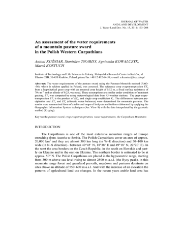 JOURNAL OF WATER AND LAND DEVELOPMENT J. Water Land Dev. No. 15, 2011: 193–208 An assessment of the water requirements of a mountain pasture sward in the Polish Western Carpathians Antoni KUŹNIAR, Stanisław TWARDY, Agnieszka KOWALCZYK, Marek KOSTUCH Institute of Technology and Life Sciences in Falenty, Małopolska Research Centre in Kraków, ul. Ułanów 21B, 31-450 Kraków, Poland, phone/fax +48 12 412-84-59, e-mail: [email protected] Abstract: The water requirements of the pasture sward using the Penman-Monteith method (FAO-56), which is seldom applied in Poland, was assessed. The reference crop evapotranspiration ETo from a hypothetical grass crop with an assumed crop height of 0.12 m, a fixed surface resistance of 70 s·m–1 and an albedo of 0.23, was used. These assumptions are similar under conditions of ruminant grazing. ETo was computed by using meteorological data from 43 weather stations. The crop evapotranspiration ETc is the product of ETo, and single crop coefficient Kc. The differences between precipitation and ETo and ETc (climatic water balances) were determined for mountain pastures. The results were summarised form of a table and maps of isohyets and isolines elaborated by applying the Geographic Information System techniques (Arc View 9) with the data interpolated by the geostatic method (Kriging). Key words: pasture sward, crop evapotranspiration, water requirements, the Carpathian Mountains INTRODUCTION The Carpathians is one of the most extensive mountain ranges of Europe stretching from Austria to Serbia. The Polish Carpathians cover an area of approx. 20,000 km2 and they are almost 300 km long (in W–E direction) and 50–100 km wide (in N–S direction)– between 49°45’ N, 18°38’ E and 49°18’ N, 22°20’ E). In the west the area borders on the Czech Republic, in the south on Slovakia and partly on Ukraine and in the east on Ukraine. The northern border is estimated to be at approx. 50° N. The Polish Carpathians are placed in the hypsometric range, starting from 300 m above sea level rising to almost 2500 m a.s.l. (the Rysy peak), in this mountain range forest and grassland prevails, meadows and pastures dominate on sites above an altitude of 550–600 m a.s.l. And with the increase of an elevation the patterns of agricultural land use changes. In the recent years arable land area has 194 A. KUŹNIAR et al. decreased of almost 40% and grasslands has increased of about 73% (TWARDY, 2008). Generally this is a favourable phenomenon, because in this way soil erosion is limited and soil-water environment is protected. The rearing of ruminants here is based on the utilization of large areas of permanent grassland as the main source of fodder. However, in the mountain regions more consideration will be given to nonproductive roles, particularly in reference to high nature value (NNV) farming, erosion control, and aesthetic as well as landscape function. For pasture utilization we can distinguish the grass association of Lolio-Cynosuretum, which occurs in the whole area of the Carpathians. The remaining meadow-pasture groups (for example Heracio-Nardetum or Nardetum Carpaticum) have marginal economic importance because of very low yields and poor chemical and botanical composition of the swards. Since the 25 percent of the Upper Vistula River basin (50,732 km2) is located in the Polish Carpathians, this river is a natural source of water for municipalities, industry and agriculture (DYNOWSKA and MACIEJEWSKI, 1991) Therefore, in considering the water supply of a river basin water consumed by natural vegetation becomes of increasing importance. Studies conducted by ITP (IMUZ) at the research station Jaworki, at an altitude of 600 m a.s.l. (Małe Pieniny Mts.) showed that during farming of the mountain pastures, water deficits rarely occurred (KUŹNIAR and TWARDY, 2001). However, in a view of a great natural, hydrological and economical significance of those areas, and affirmed climatic changes, further studies are needed, by applying more precise methods. Various methods have been used in the Polish Carpathians to determine the amount of water requirements of by agricultural crops and natural vegetation. The main methods are: lysimeter experiments, field experimental plots and soil moisture studies. However, the accuracy of recordings from small lysimeters is known to be not very high. Evapotranspitation or consumptive use of water is the sum of two terms; (1) transpiration, which is water entering plant roots and used to build plant tissue or being passed through leaves of the plant into the atmosphere (2) evaporation, which is water evaporating from adjacent soil, water surfaces, or from the surfaces of leaves of the plant. And how temperature, humidity, wind velocity, vapour pressure and solar radiation influence crop water requirements use has been studied by several researches (BAC and ROJEK, 1982; JAWORSKI, 2004.). While the measurement of precipitation is relatively straightforward and there is a fairly dense network of observing stations in Poland. However, the measurement of evapotranspiration is difficult undertaking because the rate of evapotranspiration varies greatly with the ease with which water is available to crops. This leads to the concept of potential evapotranspiration, introduced by PENMAN (1948) and THORNTWAITE (1948) and defined as “the amount of An assessment of the water requirements of a mountain pasture sward… 195 water transpired in unit time by a short green crop, completely shading the ground, of uniform height and never short of water”. As a results, estimation of reference evapotranspiration in Poland was based on Penman’s formula (PENMAN, 1948), computed from climatic factors of net radiation, temperature, wind and humidity (KĘDZIORA, 1995; ŁABĘDZKI, 1995; MISZTAL, 2000; ROGUSKI et al., 1988). The Penman theory and his equation contributed greatly towards the better understanding of the process of evaporation. B