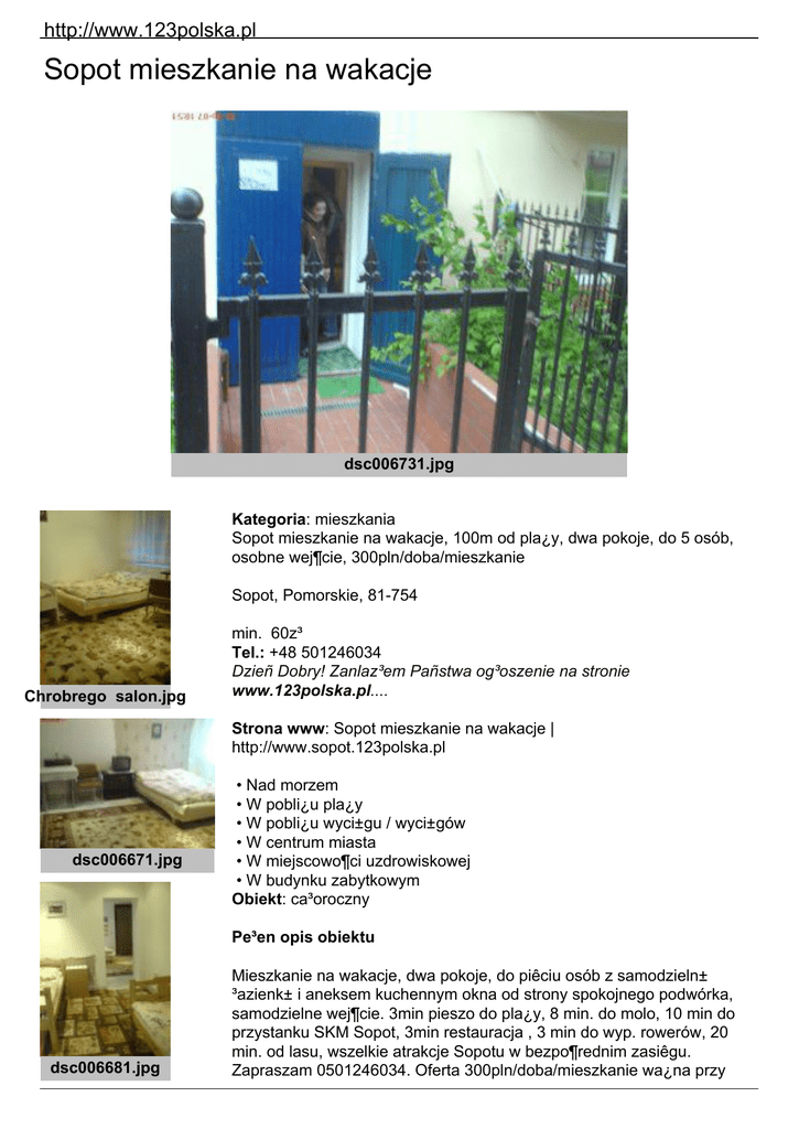 http://www.123polska.pl Sopot mieszkanie na wakacje dsc006731.jpg Kategoria: mieszkania Sopot mieszkanie na wakacje, 100m od pla¿y, dwa pokoje, do 5 osób, osobne wej¶cie, 300pln/doba/mieszkanie Sopot, Pomorskie, 81-754 Chrobrego salon.jpg min. 60z³ Tel.: +48 501246034 Dzieñ Dobry! Zanlaz³em Pañstwa og³oszenie na stronie www.123polska.pl.... Strona www: Sopot mieszkanie na wakacje | http://www.sopot.123polska.pl dsc006671.jpg • Nad morzem • W pobli¿u pla¿y • W pobli¿u wyci±gu / wyci±gów • W centrum miasta • W miejscowo¶ci uzdrowiskowej • W budynku zabytkowym Obiekt: ca³oroczny Pe³en opis obiektu dsc006681.jpg Mieszkanie na wakacje, dwa pokoje, do piêciu osób z samodzieln± ³azienk± i aneksem kuchennym okna od strony spokojnego podwórka, samodzielne wej¶cie. 3min pieszo do pla¿y, 8 min. do molo, 10 min do przystanku SKM Sopot, 3min restauracja , 3 min do wyp. rowerów, 20 min. od lasu, wszelkie atrakcje Sopotu w bezpo¶rednim zasiêgu. Zapraszam 0501246034. Oferta 300pln/doba/mieszkanie wa¿na przy http://www.123polska.pl rezerwacji na minimum trzy dni.powierzchnia u¿ytkowa obiektu 50 m2 ³±czna liczba miejsc 5 miejsc noclegowych aneks kuchenny, samodzielna ³azienka, kuchenka czteropalnikowa, piekarnik, lodówka, czajnik elektryczny, TV atrakcje w okolicy plaza, molo, park wodny, wind-surfig, wycieczki statkiem, ¿eglowanie, wspinaczka, wêdrówki piesze, jazda rowerem, jazda konna, tenis, golf, mini golf, park krajobrazowy. dsc006701.jpg Oferowane pokoje: Cena za ca³o¶æ: Cena za dobê (za ca³o¶æ): 300 z³ Cena za miesi±c (za ca³o¶æ): 3200 z³ Ca³kowieta ilo¶c miejsc noclegowych: ok. 5 Cena za osobê (w SEZONIE): w pokoju 5 (i wiêcej) osob: 60 z³ W pobli¿u: do sklepu: 0.1 km do morza: 0,1 km do pla¿y strze¿onej: 0,1 km do wypozyczalni sprzêtu wodnego: 0,5 km do wyci±gu narciarskiego: 5 km do tras zjazdowych: 5 km restauracje / kawiarnie / bary: 0,3 km dyskoteka / dancing / klub nocny: 0,1 km s³u¿by medyczne: 0,5 km poczta: 0,4 km bank / bankomat: 0,4 km budka telefoniczna: 0,1 km Internet Cafe: 0,2 km dworzec PKP: 1 km parking strze¿ony (je¿eli brak w obiekcie): 0,3 km parking bezp³atny (je¿eli brak w obiekcie): 0,2 km