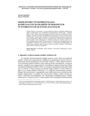ZESZYTY NAUKOWE POLITECHNIKI RZESZOWSKIEJ 291, Mechanika 87 RUTMech, t. XXXII, z. 87 (4/15), październik-grudzień 2015, s. 339-347 Witold NIEMIEC1 Marta WÓJCIK2 MOŻLIWOŚCI WYKORZYSTANIA KOMUNALNYCH OSADÓW ŚCIEKOWYCH W WYBRANYCH OCZYSZCZALNIACH Osady ściekowe wytwarzane w oczyszczalniach ścieków są bogatym źródłem substancji organicznych oraz mineralnych poprawiających właściwości i strukturę gleby. Coraz większa ilość powstających osadów ściekowych skutkuje wprowadzaniem nowych rozwiązań technologicznych mających na celu ich dalsze zagospodarowanie. Opracowanie przedstawia przegląd urządzeń mających zastosowanie w dawkowaniu osadów do gleby w postaci stałej i ciekłej oraz urządzenie do poboru próbek wody infiltrującej w warunkach polowych. Artykuł zawiera również charakterystykę osadów ściekowych oraz sposoby ich zagospodarowania na przykładzie wybranych oczyszczalni ścieków w województwie podkarpackim. W opracowaniu zwrócono także uwagę na wady oraz zalety związane z wprowadzaniem osadów ściekowych do gruntu. Słowa kluczowe: komunalne osady ściekowe, nawożenie, higienizacja, oczyszczalnia ścieków 1. Sposoby wykorzystania osadów ściekowych W ostatnich dziesięcioleciach nastąpił znaczny wzrost ilości powstających osadów ściekowych, spowodowany oddaniem do eksploatacji nowych oraz modernizacją obecnie działających oczyszczalni ścieków, a także objęciem zbiorowym systemem odbioru ścieków coraz większej liczby mieszkańców, zwłaszcza terenów wiejskich oraz rozproszonych. Na podstawie zapisów Krajowego Planu Gospodarki Odpadami (KPGO) 2014 oraz prognoz demograficznych przewiduje się, że w 2018 r. w kraju zostaną wytworzone osady ściekowe w ilości 706,6 tys. Mg s.m [1]. Osady ściekowe stanowią 1-2 % objętości oczyszczanych ścieków, dlatego ich przetwarzanie i zagospodarowanie traktowane jeszcze niedawno jako zadanie drugorzędne w stosunku do oczyszczania ścieków, szybko zaczęło nabierać znaczenia równorzędnego [2]. Stosowanie ustabilizowanych osadów ściekowych w rolnictwie jest w wielu krajach Unii Europejskiej preferowanym 1 2 Autor do korespondencji/corresponding author: Witold Niemiec, Politechnika Rzeszowska, Al. Powstańców Warszawy 12, 35-959 Rzeszów, tel.: (17) 865 1504, e-mail: [email protected] Marta Wójcik, Politechnika Rzeszowska 340 W. Niemiec, M. Wójcik oraz najbardziej rozpowszechnionym sposobem ich zagospodarowania. Podstawowym warunkiem umożliwiającym wykorzystanie osadów ściekowych jest zapewnienie bezpieczeństwa sanitarnego podczas ich stosowania [3]. Prawidłowe wykorzystanie wartości nawozowej i glebotwórczej osadów ściekowych przynosi korzyści z uwagi na obecność w osadach związków organicznych zawierających: azot, fosfor, wapń, magnez, niezbędnych do prawidłowego wzrostu roślin. Literatura [4] wyróżnia pięć głównych grup właściwości osadów ściekowych, mających wpływ na ich dalsze zagospodarowanie: fizyczne, chemiczne, sanitarne, technologiczne oraz reologiczne, przy czym najważniejsze z punktu widzenia ich późniejszego wykorzystania są cechy sanitarne. W osadach ściekowych zawarte są znaczne ilości wirusów, bakterii, pierwotniaków, a także jaja helmintów oraz inne organizmy chorobotwórcze. Ważnym kryterium ograniczającym możliwość późniejszego wykorzystania osadów ściekowych jest obecność metali ciężkich, ograniczającym ich zastosowanie do celów rolniczych. Metale ciężkie powinny być kontrolowane w przypadku składowania osadów na kwaśnych podłożach z uwagi na wymywanie toksycznych składników oraz ich przedostawanie się do gleby [6]. Kolejną cechą wpływającą na wykorzystywanie osadów ściekowych w rolnictwie jest zawartość związków biogennych. Obecność związków humusowych oraz substancji niezbędnych do wzrostu roślin powoduje, że osady ściekowe traktowane są jako wartościowy nawóz, z powodzeniem zastępujący dotychczas stosowane nawozy mineralne. W Polsce stosuje się trzy główne metody zagospodarowania osadów ściekowych: składowanie, wykorzystywanie do celów rolniczych i przyrodniczych oraz metody termiczne. Zgodnie z Rozporządzeniem Ministra Gospodarki z dnia 8 stycznia 2013 r. w sprawie kryteriów oraz procedur dopuszczania odpadów do składowania na składowisku odpadów danego typu [5], od 1 stycznia 2016 roku będzie obowiązywać w kraju zakaz składowania osadów ściekowych na składowiskach odpadów. Z tego względu szczególne popularne staje się rolnicze wykorzystanie osadów ściekowych z użyciem wapna. Wapnowanie jest jedną z najpopularniejszych metod higienizacji osadów ściekowych. Kontakt osadów z wapnem eliminuje prawie całkowicie większość bakterii, wirusów oraz jaja Ascaris. Literatura [8] podaje, że orientacyjna dawka wapna przypadająca na jeden kilogram osadów o uwodnieniu 98% wynosi odpowiednio 7 kg CaO/kg sm. Proces odkażania osadów ściekowych za pomocą wapna jest procesem egzotermicznym, przebiegającym w zhomogenizowanej mieszaninie przy odczynie pH = 12 oraz przy temperaturze co najmniej 5 C dla zainicjowania reakcji chemicznej, w czasie 75 minut. Podstawę procesu stanowi reakcja hydratacji tlenku wapna: CaO + H O → Ca(OH) + ciepło (1) W jednorodnej mieszaninie reakcyjnej, wapno palone reaguje z wodą zawartą w osadzie ściekowym. Wapno palone pochłania nawet do 32 % wody w stosunku do swojej masy, co jest przyczyną znacznego odwodnienia osadu przy Możliwości wykorzystania komunalnych osadów ściekowych... 341 jednoczesnym wzroście temperatury. Efektem higienizacji osadów ściekowych wapnem jest gotowy bioprodukt mający zastosowanie w rolnictwie jako środek poprawiający strukturę gleby [8]. Proces higienizacji osadów ściekowych wymaga zastosowania nowych technologii i urządzeń umożliwiających produkcję wcześniej wspomnianego nawozu. Działania w zakresie wykorzystania osadów ściekowych w rolnictwie pr