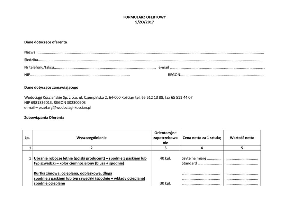 FORMULARZ OFERTOWY 9/ZO/2017 Dane dotyczące oferenta Nazwa............................................................................................................................................................................................................................ Siedziba......................................................................................................................................................................................................................... Nr telefonu/faksu.................................................................................................. e-mail ………………………………………………………………………………………. NIP................................................................................................ REGON................................................................................. Dane dotyczące zamawiającego Wodociągi Kościańskie Sp. z o.o. ul. Czempińska 2, 64-000 Kościan tel. 65 512 13 88, fax 65 511 44 07 NIP 6981836013, REGON 302300903 e-mail – [email protected] Zobowiązania Oferenta Lp. 1 Wyszczególnienie 2 1 Ubranie robocze letnie (polski producent) – spodnie z paskiem lub typ szwedzki – kolor ciemnozielony (bluza + spodnie) Kurtka zimowa, ocieplana, odblaskowa, długa spodnie z paskiem lub typ szwedzki (spodnie + wkłady ocieplane) spodnie ocieplane Orientacyjne zapotrzebowa nie 3 40 kpl. 30 kpl. Cena netto za 1 sztukę Wartość netto 4 5 Szyte na miarę …………… ……………………………. Standard ……………………. ……………………………. …………………………………. …………………………………. …………………………………. ……………………………. ……………………………. ……………………………. Materiał: 65% poliester, 35% bawełna, gramatura min.260 g/m², wytrzymałość na tarcie i uszkodzenia mechaniczne, niska kurczliwość w praniu wodnym o temp. 60°C; podwójne szwy i dodatkowe wzmocnienia w miejsca narażonych na rozerwania, naszyte taśmy odblaskowe na rękawach i nogawkach spodni. Zgodność z PN-EN 340:2006 Odzież ochronna. Wymagane oznakowanie – CE Czapka letnia - kolor ciemnozielony 2 Czapka z daszkiem, usztywniany daszek, regulowana na rzep, po bokach otwory wentylacyjne zwiększające komfort użytkowania, Czapka zimowa – kolor czarny 3 Materiał: bawełna; czapka wywijana, dzięki czemu można regulować jej długość 4 Czapka zimowa – polar, uszy podpinane do góry, usztywniany daszek, ocieplana kożuszkiem Trzewiki zimowe – skóra naturalna(nie ze skóry Buffalo) 5 Wykonane z naturalnej skóry, kompozytowy podnosek; podeszwa antypoślizgowa, olejoodporna ,wodoodporna Trzewiki letnie - skóra naturalna(nie ze skóry Buffalo) 6 Wykonane z naturalnej skóry, kompozytowy podnosek; podeszwa antypoślizgowa, olejoodporna ,wodoodporna Koszula flanelowa zwykła 7 Materiał: 100% bawełna, zapinana na guziki, gramatura min. 120g/m2 Koszula flanelowa ocieplana – zimowa 8 Gramatura min.200 g/m2, zapinana na guziki 9 Ubranie przeciwdeszczowe – komplet spodnie + kurtka 10 Rękawice robocze – wykonane z dzianiny, powlekane gumą o porowatej strukturze, odporne na rozdarcie, trudnościeralne 40 szt. 30 szt. 30 szt. 20 szt. 40 szt. 40 szt. 40 szt. 15szt. 500 szt. 11 Rękawice drelichowo-skórzane – kat.I , wzmacniane skórą 150 szt. 12 Rękawice gumowe – 100 % kauczuk naturalny, wewnętrzna powierzchnia pokryta flokiem 75 szt. 13 Rękawice gumowe długie – wykonane z PCV (długość ok. 40 cm) 75 szt. 14 Fartuch kwasoodporny – wykonany z dzianiny poliestrowej powleczonej obustronnie polichlorkiem winylu; produkt ma chronić przed stężonymi kwasami, zasadami, roztworami soli Kask ochronny czteropunktowy - z paskiem podbródkowym 40 szt. Szelki bezpieczeństwa Climax– wykonane z taśmy poliestrowej , dwie klamry regulacyjne, taśma poliestrowa 45 mm. 5 szt. 15 16 17 Kamizelki odblaskowe zwykłe letnie 18 Buty filcowo – gumowe – wykonane z wysokiej jakości PCV z dodatkowym wkładem filcowym i wkładką, cholewa zapewniająca ciepłochłonność 5 szt. 200 szt. 200 szt. …………………………………… ……………………………. ………………………………….. ……………………………. 30 szt. Razem netto Podatek VAT Brutto Ilości przedstawione w kolumnie nr 3 są orientacyjne, rzeczywiste wynikać będą z bieżących potrzeb Zamawiającego. Oświadczamy, że: - zapoznaliśmy się z zapytaniem ofertowym, nie wnosimy zastrzeżeń oraz zdobyliśmy wszystkie konieczne informacje potrzebne do przygotowania oferty i do właściwego wykonania zamówienia, - posiadamy uprawnienia do realizacji przedmiotowego zamówienia zgodnie z obowiązującymi przepisami, - uważamy się za związanych niniejszą ofertą przez okres 30 dni liczonych od dnia składania ofert, - składamy niniejszą ofertę w imieniu własnym/jako wykonawcy wspólnie ubiegający się o wykonanie zamówienia,* - oświadczam, że zamierzam/nie zamierzam powierzyć wykonanie części zamówienia podwykonawcom ( należy wskazać część, która zostanie powierzona podwykonawcom )* ....................................................................................................................................................................................................................................... ....................................................................................................................................................................................................................................... Zobowiązuję się wykonać całość przedmiotu zamówienia w terminie od 01 stycznia do 31 grudnia 2017 roku. Płatność przelewem w terminie 21 dni licząc termin od dnia wystawienia faktury. Załącznikiem do formularza są: 1. ………………………………………