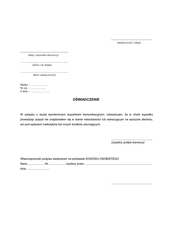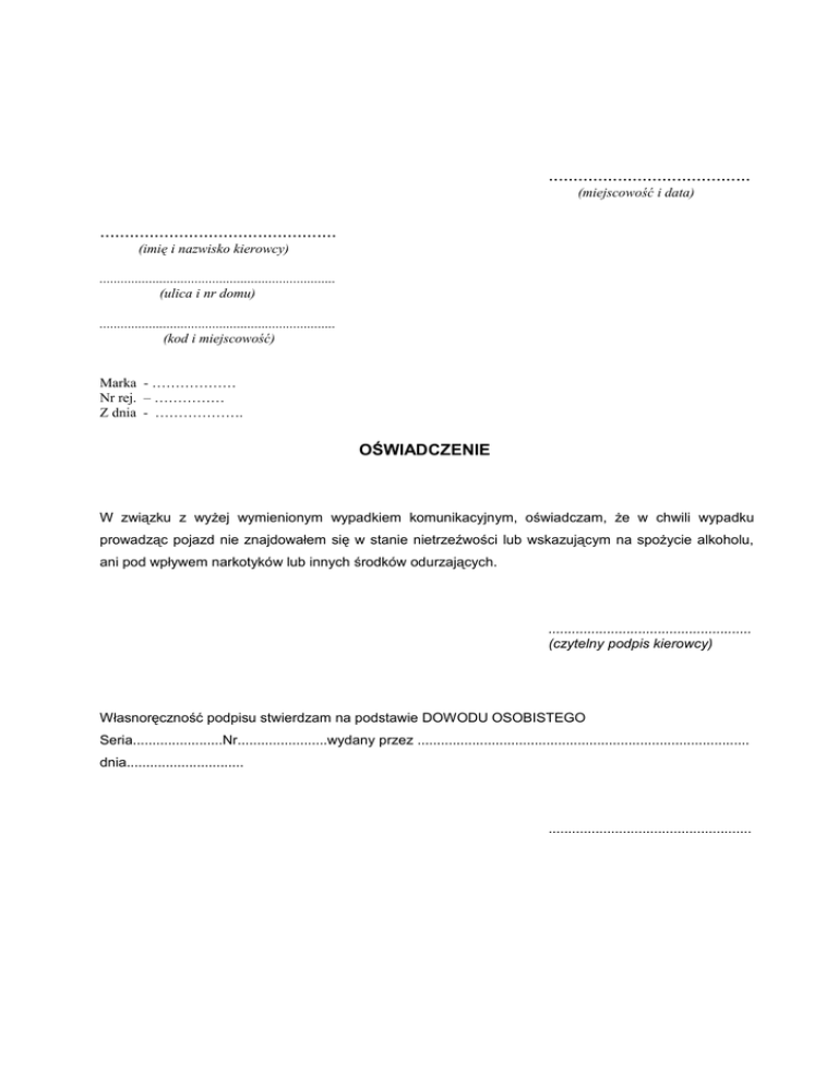 ......................................... (miejscowość i data) ................................................ (imię i nazwisko kierowcy) ................................................................... (ulica i nr domu) ................................................................... (kod i miejscowość) Marka - ……………… Nr rej. – …………… Z dnia - ………………. OŚWIADCZENIE W związku z wyżej wymienionym wypadkiem komunikacyjnym, oświadczam, że w chwili wypadku prowadząc pojazd nie znajdowałem się w stanie nietrzeźwości lub wskazującym na spożycie alkoholu, ani pod wpływem narkotyków lub innych środków odurzających. .................................................... (czytelny podpis kierowcy) Własnoręczność podpisu stwierdzam na podstawie DOWODU OSOBISTEGO Seria.......................Nr.......................wydany przez ..................................................................................... dnia.............................. ....................................................