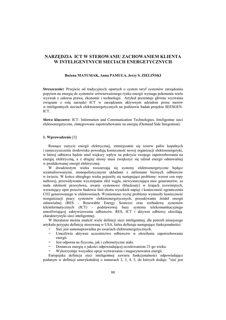 NARZĘDZIA ICT W STEROWANIU ZACHOWANIEM KLIENTA W INTELIGENTNYCH SIECIACH ENERGETYCZNYCH BoŜena MATUSIAK, Anna PAMUŁA, Jerzy S. ZIELIŃSKI Streszczenie: Przejście od tradycyjnych opartych o system taryf systemów zarządzania popytem na energię do systemów zrównowaŜonego rynku energii wymaga pokonania wielu wyzwań z zakresu prawa, ekonomii i technologii. Artykuł prezentuje główne wyzwania związane z rolą narzędzi ICT w zarządzaniu aktywnym udziałem prosu merów w inteligentnych sieciach elektroenergetycznych na podstawie badań projektu SEESGENICT. Słowa kluczowe: ICT- Information and Communication Technologies, Inteligentne sieci elektoenergetyczne, zintegrowane zapotrzebowanie na energię (Demand Side Integration). 1. Wprowadzenie [3] Rosnące zuŜycie energii elektrycznej, zmniejszanie się rezerw paliw kopalnych i zanieczyszczenie środowiska powodują konieczność nowej organizacji elektroenergetyki, w której odbiorca będzie miał większy wpływ na pokrycie swojego zapotrzebowania na energię elektryczną, a z drugiej strony musi zwiększyć się udział energii odnawialnej w produkowanej energii elektrycznej. W dwudziestym wieku rozszerzają się systemy elektroenergetyczne będące scentralizowanymi, monopolistycznymi układami z milionami biernych odbiorców w świecie. W końcu ubiegłego wieku pojawiły się następujące problemy: wzrost cen ropy naftowej, przewidywanie wyczerpania złóŜ węgla, niewystarczająca moc generatorów, za mała zdolność przesyłowa, awarie systemowe (blackouty) w krajach rozwiniętych, wzrastający opór przeciw budowie linii ekstra wysokich napięć i konieczność ograniczenia CO2 generowanego w elektrowniach. Wymienione wyŜej problemy wymusiły konieczność reorganizacji pracy systemów elektorenergetycznych, poszukiwanie źródeł energii odnawialnej (RES - Renewable Energy Sources) oraz rozbudowę systemów teleinformatycznych (ICT) - podstawowej bazy systemu telekomunikacyjnego umoŜliwiającej zaktywizowanie odbiorców. RES, ICT i aktywni odbiorcy określają charakterystyki sieci inteligentnej. W literaturze moŜna znaleźć wiele definicji sieci inteligentnej, dla potrzeb niniejszego artykułu przyjęto definicję stosowaną w USA, która definiuje następujące funkcjonalności: − Sieć jest samonaprawialna po awariach elektroenergetycznych. − UmoŜliwia aktywne uczestnictwo odbiorców w określeniu zapotrzebowania energii. − Jest odporna na fizyczne, jak i cybernetyczne ataki. − Dostarcza energię o jakości odpowiadającej oczekiwaniom 21-go wieku. − Wykorzystuje wszystkie opcje wytwarzania i magazynowania energii. Europejska definicja sieci inteligentnej zawiera funkcjonalności odpowiadające podanym w definicji amerykańskiej o numerach 2, 3, 4, 5, do których dodaje: "sieć jest 88 ekonomiczna zapewniając najlepsze wskaźniki dzięki innowacjom, jest efektywnie zarządzana i stwarza równe szanse dla rozwoju konkurencji oraz zapewnia zdalne sterowanie. PowyŜsze definicje eksponują rolę źródeł energii odnawialnej w tworzeniu sieci inteligentnej, zatem w dalszych rozwaŜaniach poświęcimy im więcej uwagi." Wzrastający udział źródeł odnawialnych w systemie elektroenergetycznym w Polsce świadczy o dynamicznym rozwoju tego rynku; według raportu Polskiej Agencji Informacji i Inwestycji Zagranicznych moc obecnie zainstalowanych elektrowni wiatrowych w Polsce wynosi 1096 MW bez uwzględniania budowanej w Margoninie farmy o mocy 240 MW. Przyrost mocy farm wiatrowych w Polsce w trzech pierwszych kwartach 2010 roku w porównaniu z 2009 r. wyniósł 51 proc. Raport przewiduje 75 proc. wzrost w całym roku [9]. Kształtowanie rynku energii z generacją rozproszoną (w tym energii odnawialnej) jest procesem złoŜonym i napotyka szereg róŜnego rodzaju barier: formalno prawnych i finansowych, organizacyjnych, technologicznych i strukturalnych[1]. Tematyka zarządzania inteligentnymi sieciami elektroenergetycznymi jest przedmiotem wielu badań i projektów zarówno krajowych jak europejskich. Jednym z takich projektów jest europejski projekt SEESGEN–ICT (Supporting Energy Efficiency in Smart GENeration grids through ICT) 2009-2010 [4]. W obecnym systemie rola odbiorcy energii jest niewielka. Ogranicza się ona do zawarcia umowy na pobór energii o określonej mocy w określonych taryfach, wykorzystania energii oraz opłacenia rachunków. ZałoŜeniem systemu inteligentnych sieci jest aktywny udział odbiorców końcowych systemu elektroenergetycznego w grze rynkowej oraz moŜliwość kontrolowanej indywidualnej generacji i magazynowania energii. Rola takiego klienta zmienia się na czynne uczestnictwo polegające zarówno na zuŜywaniu jak i wywarzaniu energii. Przyjęty w systemie sieci inteligentnych aktywny udział odbiorców końcowych – prosumerów - wymaga od nich zmiany dotychczasowych zachowań poprzez: − Aktywne zarządzanie zuŜyciem energii: redukowanie konsumpcji, wpływanie na profil zuŜycia energii poprzez sterowanie urządzeniami o znacznym poborze mocy jak np. urządzenia grzewcze, klimatyzatory, pralki itp. − Dostarczanie do systemu energii ze źródeł odnawialnych (fotowoltaicznych, farm wiatrowych, małych elektrowni wodnych, kogeneracji) lub magazynowanie tej energii (dzięki samochodom elektrycznym, bateriom). Inteligentne zachowania prosumerów mają znaczny wpływ na zarządzanie całą siecią elektroenergetyczną i mogą być wykorzystane jako element zwiększający jej efektywność, podnoszący jakość, obniŜający koszty oraz integrujący rozproszone źródeł energii. Wszystkie działania związane z aktywnym zachowaniem prosumerów określone są nazwą Zintegrowanego Zapotrzebowanie na Energię (Demand Side Integration - DSI). Świadczenie usług energetycznych w sieciach inteligentnych jest ściśle związane z wykorzystaniem środków ICT. Jedynie za pomocą narzędzi ICT moŜliwe jest zarządzanie złoŜonym systemem elektroenergetycznym o wielorak