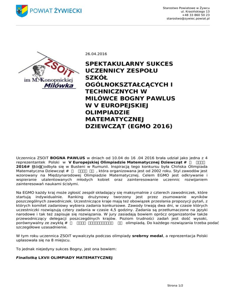 Starostwo Powiatowe w Żywcu ul. Krasińskiego 13 +48 33 860 50 23 [email protected] 26.04.2016 SPEKTAKULARNY SUKCES UCZENNICY ZESPOŁU SZKÓŁ OGÓLNOKSZTAŁCĄCYCH I TECHNICZNYCH W MILÓWCE BOGNY PAWLUS W V EUROPEJSKIEJ OLIMPIADZIE MATEMATYCZNEJ DZIEWCZĄT (EGMO 2016) Uczennica ZSOiT BOGNA PAWLUS w dniach od 10.04 do 16 .04 2016 brała udział jako jedna z 4 reprezentantek Polski w V Europejskiej Olimpiadzie Matematycznej Dziewcząt #℣佐⌡⌀䔀䜀䴀O 2016#℣䍐⌡⌀Ⰰ która odbyła się w Busteni w Rumunii. Inspiracją tego konkursu była Chińska Olimpiada Matematyczna Dziewcząt #℣佐⌡⌀䌀䜀䴀伀⌡⍃倣℣, która organizowana jest od 2002 roku. Styl zawodów jest wzorowany na Międzynarodowej Olimpiadzie Matematycznej. Celem EGMO jest odkrywanie i wspieranie utalentowanych młodych kobiet oraz zainteresowanie uczennic rozwijaniem zainteresowań naukami ścisłymi. Na EGMO każdy kraj może zgłosić zespół składający się maksymalnie z czterech zawodniczek, które startują indywidualnie. Ranking drużynowy tworzony jest przez zsumowanie wyników poszczególnych zawodniczek. Uczestniczące kraje mają też obowiązek przesłania propozycji pytań, z których komitet zadaniowy wybiera zadania konkursowe. Zawody trwają dwa dni, w czasie których uczestniczki rozwiązują cztery zadania w czasie 4,5 godziny. Zadania są przetłumaczone na języki narodowe i tak też zapisuje się rozwiązania. W jury zasiadają bowiem oprócz organizatorów także przewodniczący delegacji poszczególnych krajów. Poziom trudności zadań jest dość wysoki, porównywalny ze zwykłą #℣佐⌡⌀琀稀渀⸀ 欀漀攀搀甀欀愀挀礀樀渁Ԁ⌡⍃倣℣ olimpiadą. Do każdego rozwiązania trzeba podać szczegółowe uzasadnienie. W tym roku uczennica ZSOiT wywalczyła podczas olimpiady srebrny medal, a reprezentacja Polski uplasowała się na 8 miejscu. To jednak niejedyny sukces Bogny, jest ona bowiem: Finalistką LXVII OLIMPIADY MATEMATYCZNEJ Strona 1/2 Starostwo Powiatowe w Żywcu ul. Krasińskiego 13 +48 33 860 50 23 [email protected] Srebrną medalistką V EUROPEJSKIEJ OLIMPIADY MATEMATYCZNEJ DZIEWCZĄT w Rumunii Reprezentantką Polskiw XXVI ZAWODACH MATEMATYCZNYCH PAŃSTW BAŁTYCKICH BALTIC WAY 2015 w Sztokholmie (II miejsce) Laureatką XIII ŚLĄSKIEGO KONKURSU MATEMATYCZNEGO Gratulujemy tak licznych sukcesów Bognie i życzymy powodzenia w innych zawodach matematycznych! Informacja ZSOiT w Milówce Strona 2/2 Powered by TCPDF (www.tcpdf.org)