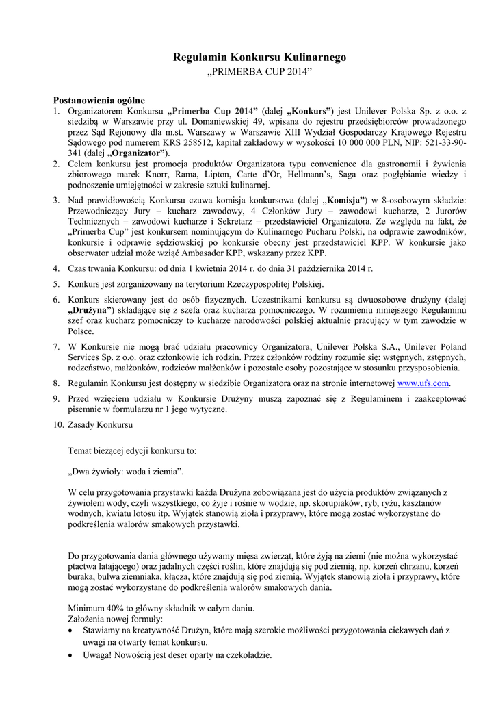Regulamin Konkursu Kulinarnego „PRIMERBA CUP 2014” Postanowienia ogólne 1. Organizatorem Konkursu „Primerba Cup 2014” (dalej „Konkurs”) jest Unilever Polska Sp. z o.o. z siedzibą w Warszawie przy ul. Domaniewskiej 49, wpisana do rejestru przedsiębiorców prowadzonego przez Sąd Rejonowy dla m.st. Warszawy w Warszawie XIII Wydział Gospodarczy Krajowego Rejestru Sądowego pod numerem KRS 258512, kapitał zakładowy w wysokości 10 000 000 PLN, NIP: 521-33-90341 (dalej „Organizator”). 2. Celem konkursu jest promocja produktów Organizatora typu convenience dla gastronomii i żywienia zbiorowego marek Knorr, Rama, Lipton, Carte d’Or, Hellmann’s, Saga oraz pogłębianie wiedzy i podnoszenie umiejętności w zakresie sztuki kulinarnej. 3. Nad prawidłowością Konkursu czuwa komisja konkursowa (dalej „Komisja”) w 8-osobowym składzie: Przewodniczący Jury – kucharz zawodowy, 4 Członków Jury – zawodowi kucharze, 2 Jurorów Technicznych – zawodowi kucharze i Sekretarz – przedstawiciel Organizatora. Ze względu na fakt, że „Primerba Cup” jest konkursem nominującym do Kulinarnego Pucharu Polski, na odprawie zawodników, konkursie i odprawie sędziowskiej po konkursie obecny jest przedstawiciel KPP. W konkursie jako obserwator udział może wziąć Ambasador KPP, wskazany przez KPP. 4. Czas trwania Konkursu: od dnia 1 kwietnia 2014 r. do dnia 31 października 2014 r. 5. Konkurs jest zorganizowany na terytorium Rzeczypospolitej Polskiej. 6. Konkurs skierowany jest do osób fizycznych. Uczestnikami konkursu są dwuosobowe drużyny (dalej „Drużyna”) składające się z szefa oraz kucharza pomocniczego. W rozumieniu niniejszego Regulaminu szef oraz kucharz pomocniczy to kucharze narodowości polskiej aktualnie pracujący w tym zawodzie w Polsce. 7. W Konkursie nie mogą brać udziału pracownicy Organizatora, Unilever Polska S.A., Unilever Poland Services Sp. z o.o. oraz członkowie ich rodzin. Przez członków rodziny rozumie się: wstępnych, zstępnych, rodzeństwo, małżonków, rodziców małżonków i pozostałe osoby pozostające w stosunku przysposobienia. 8. Regulamin Konkursu jest dostępny w siedzibie Organizatora oraz na stronie internetowej www.ufs.com. 9. Przed wzięciem udziału w Konkursie Drużyny muszą zapoznać się z Regulaminem i zaakceptować pisemnie w formularzu nr 1 jego wytyczne. 10. Zasady Konkursu Temat bieżącej edycji konkursu to: „Dwa żywioły: woda i ziemia”. W celu przygotowania przystawki każda Drużyna zobowiązana jest do użycia produktów związanych z żywiołem wody, czyli wszystkiego, co żyje i rośnie w wodzie, np. skorupiaków, ryb, ryżu, kasztanów wodnych, kwiatu lotosu itp. Wyjątek stanowią zioła i przyprawy, które mogą zostać wykorzystane do podkreślenia walorów smakowych przystawki. Do przygotowania dania głównego używamy mięsa zwierząt, które żyją na ziemi (nie można wykorzystać ptactwa latającego) oraz jadalnych części roślin, które znajdują się pod ziemią, np. korzeń chrzanu, korzeń buraka, bulwa ziemniaka, kłącza, które znajdują się pod ziemią. Wyjątek stanowią zioła i przyprawy, które mogą zostać wykorzystane do podkreślenia walorów smakowych dania. Minimum 40% to główny składnik w całym daniu. Założenia nowej formuły: Stawiamy na kreatywność Drużyn, które mają szerokie możliwości przygotowania ciekawych dań z uwagi na otwarty temat konkursu. Uwaga! Nowością jest deser oparty na czekoladzie. W finale konkursu zamiast przystawki uczestnicy przygotują deser na bazie czekolady i Ramy Cremefine Profi 31% Wielofunkcyjnej. Zarówno przystawka, jak i danie główne muszą być przygotowane z udziałem minimum jednego rodzaju Primerby Knorr. 11. Konkurs składa się z III etapów: a. I etap – kwalifikacje (przygotowanie i nadsyłanie receptur), b. II etap – półfinał, c. III etap – finał. I etap – kwalifikacje (przygotowanie i nadsyłanie receptur) 12. I etap polega na przesłaniu w terminie od dnia 1 kwietnia 2014 r. do 26 maja 2014 r. na adres mailowy: [email protected] lub [email protected] zgłoszenia (dalej „Zgłoszenie”) zawierającego: a. propozycję receptur (na danie główne i przystawkę) zgodnych z tematem Konkursu wraz ze zdjęciami potraw. Każda drużyna musi być autorem receptur. Każda receptura musi zawierać: I. nazwę potrawy, II. wyszczególnione składniki w proporcji na 6 porcji, III. opis wykonania. Dania powinny zostać zaprezentowane według własnej inwencji Drużyny. b. wypełniony i przesłany na adres: Unilever Polska Sp. z o.o. Primerba Cup 2014, ul. Bałtycka 43, 61-017 Poznań, formularz nr 1 zawierający następujące dane osobowe (szefa oraz pomocnika): imię i nazwisko oraz dokładny adres zamieszkania, tj. ulica, numer domu, numer mieszkania, kod pocztowy, miejscowość oraz numer telefonu kontaktowego, adres poczty elektronicznej, nazwę oraz dokładny adres zakładu pracy, tj. ulica, numer, kod pocztowy, miejscowość wraz z klauzulą o następującej treści Wyrażam zgodę na przetwarzanie przesłanych danych osobowych zgodnie z ustawą z dnia 29 sierpnia 1997 r. o ochronie danych osobowych (Dz.U. z 2002 nr 101, poz.926 ze zm.) przez Unilever Polska Sp. z o.o. z siedzibą przy ul. Domaniewskiej 49, 02-672 Warszawa w celach i w zakresie związanym z organizacją i przeprowadzeniem konkursu „Primerba Cup 2014” oraz w celu zamieszczenia tych danych na liście zwycięzców konkursu, która zostanie opublikowana na stronie internetowej www.ufs.com oraz w pismach i na portalach branżowych. Oświadczam, że zostałem poinformowany/-a o tym, że podanie danych osobowych jest dobrowolne, jak również o przysługującym prawie do wglądu do danych oraz możliwości ich poprawiania. Jednocześnie wyrażam zgodę na wykorzystanie mojego wizerunku przez Unilever Polska Sp. z o.o. na portalach internetowych i w czasopismach branżowych w ramach przedstawienia relacji z poszczególnych etapów 