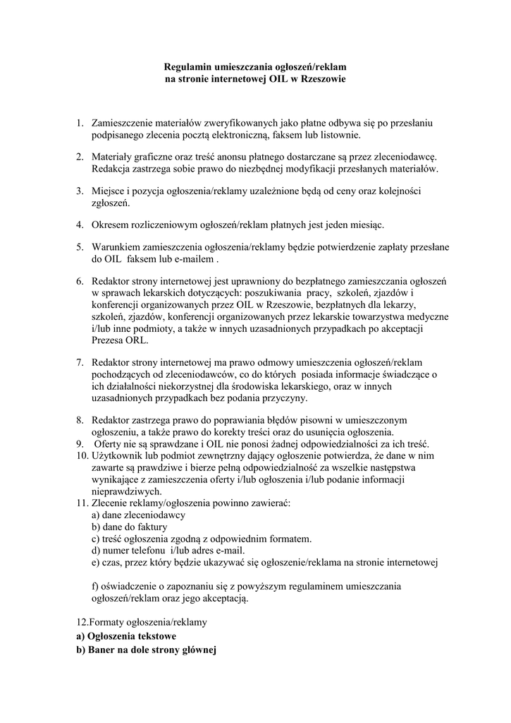 Regulamin umieszczania ogłoszeń/reklam na stronie internetowej OIL w Rzeszowie 1. Zamieszczenie materiałów zweryfikowanych jako płatne odbywa się po przesłaniu podpisanego zlecenia pocztą elektroniczną, faksem lub listownie. 2. Materiały graficzne oraz treść anonsu płatnego dostarczane są przez zleceniodawcę. Redakcja zastrzega sobie prawo do niezbędnej modyfikacji przesłanych materiałów. 3. Miejsce i pozycja ogłoszenia/reklamy uzależnione będą od ceny oraz kolejności zgłoszeń. 4. Okresem rozliczeniowym ogłoszeń/reklam płatnych jest jeden miesiąc. 5. Warunkiem zamieszczenia ogłoszenia/reklamy będzie potwierdzenie zapłaty przesłane do OIL faksem lub e-mailem . 6. Redaktor strony internetowej jest uprawniony do bezpłatnego zamieszczania ogłoszeń w sprawach lekarskich dotyczących: poszukiwania pracy, szkoleń, zjazdów i konferencji organizowanych przez OIL w Rzeszowie, bezpłatnych dla lekarzy, szkoleń, zjazdów, konferencji organizowanych przez lekarskie towarzystwa medyczne i/lub inne podmioty, a także w innych uzasadnionych przypadkach po akceptacji Prezesa ORL. 7. Redaktor strony internetowej ma prawo odmowy umieszczenia ogłoszeń/reklam pochodzących od zleceniodawców, co do których posiada informacje świadczące o ich działalności niekorzystnej dla środowiska lekarskiego, oraz w innych uzasadnionych przypadkach bez podania przyczyny. 8. Redaktor zastrzega prawo do poprawiania błędów pisowni w umieszczonym ogłoszeniu, a także prawo do korekty treści oraz do usunięcia ogłoszenia. 9. Oferty nie są sprawdzane i OIL nie ponosi żadnej odpowiedzialności za ich treść. 10. Użytkownik lub podmiot zewnętrzny dający ogłoszenie potwierdza, że dane w nim zawarte są prawdziwe i bierze pełną odpowiedzialność za wszelkie następstwa wynikające z zamieszczenia oferty i/lub ogłoszenia i/lub podanie informacji nieprawdziwych. 11. Zlecenie reklamy/ogłoszenia powinno zawierać: a) dane zleceniodawcy b) dane do faktury c) treść ogłoszenia zgodną z odpowiednim formatem. d) numer telefonu i/lub adres e-mail. e) czas, przez który będzie ukazywać się ogłoszenie/reklama na stronie internetowej f) oświadczenie o zapoznaniu się z powyższym regulaminem umieszczania ogłoszeń/reklam oraz jego akceptacją. 12.Formaty ogłoszenia/reklamy a) Ogłoszenia tekstowe b) Baner na dole strony głównej Grafika JPG, JPEG, PNG, GIF, wymiarach 450x156 pix. z możliwością przekierowania na stronę zleceniodawcy 13. Cennik zamieszczania materiałów na stronie internetowej OIL w Rzeszowie: a) Ogłoszenia tekstowe o pracy: 50 zł c) ogłoszenia tekstowe inne w aktualnościach: 10 zł/słowo b) Banery graficzne wyświetlanie na stronie głównej: 500 zł