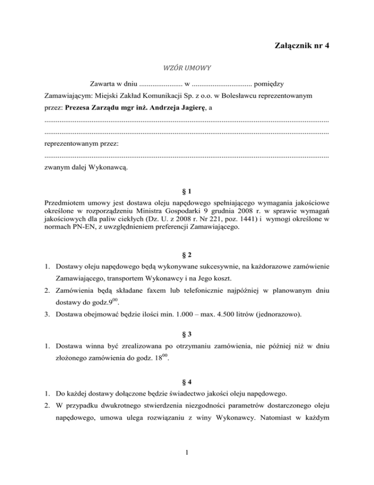 Załącznik nr 4 WZÓR UMOWY Zawarta w dniu ....................... w ................................ pomiędzy Zamawiającym: Miejski Zakład Komunikacji Sp. z o.o. w Bolesławcu reprezentowanym przez: Prezesa Zarządu mgr inż. Andrzeja Jagierę, a ....................................................................................................................................................... ....................................................................................................................................................... reprezentowanym przez: ....................................................................................................................................................... zwanym dalej Wykonawcą. §1 Przedmiotem umowy jest dostawa oleju napędowego spełniającego wymagania jakościowe określone w rozporządzeniu Ministra Gospodarki 9 grudnia 2008 r. w sprawie wymagań jakościowych dla paliw ciekłych (Dz. U. z 2008 r. Nr 221, poz. 1441) i wymogi określone w normach PN-EN, z uwzględnieniem preferencji Zamawiającego. §2 1. Dostawy oleju napędowego będą wykonywane sukcesywnie, na każdorazowe zamówienie Zamawiającego, transportem Wykonawcy i na Jego koszt. 2. Zamówienia będą składane faxem lub telefonicznie najpóźniej w planowanym dniu dostawy do godz.900. 3. Dostawa obejmować będzie ilości min. 1.000 – max. 4.500 litrów (jednorazowo). §3 1. Dostawa winna być zrealizowana po otrzymaniu zamówienia, nie później niż w dniu złożonego zamówienia do godz. 1800. §4 1. Do każdej dostawy dołączone będzie świadectwo jakości oleju napędowego. 2. W przypadku dwukrotnego stwierdzenia niezgodności parametrów dostarczonego oleju napędowego, umowa ulega rozwiązaniu z winy Wykonawcy. Natomiast w każdym 1 przypadku uszkodzenia silników w związku ze złą dostawą koszty napraw i przestoju ponosi Wykonawca. 3. Zamawiający zastrzega sobie możliwość dokonywania kontroli jakości dostarczonego oleju napędowego poprzez wykonanie badań laboratoryjnych. W wyniku stwierdzenia niezgodności parametrów dostarczonego oleju napędowego z wymaganiami producenta, koszt badań ponosi Wykonawca. §5 1. Cena oferty brutto …………………………………………………………………………… 2. Cena oleju napędowego może ulec zmianie wyłącznie wskutek zmiany ceny przez producenta oleju napędowego tj. PKN Orlen. 3. Ustala się stały upust/marża w wysokości ..................... [ zł ] ( netto ) doliczony do ceny (netto) producenta tj. PKN Orlen /po uwzględnieniu objętości paliwa przy danej temperaturze otoczenia/. 4. Cena /netto/ oleju napędowego realizowanych dostaw liczona będzie wg wzoru: Cena internet. x ( objętość przy 15°C / objętość przy rzeczywistej temp.) + upust/marża §6 1. Każdy transport paliwa musi być zaplombowany w miejscu wydawania paliwa, uszkodzone plomby będą podstawą do nie odebrania partii paliwa. 2. Wielkość dostawy ( w litrach ) potwierdzona będzie na podstawie pomiarów ilości oleju napędowego wykonanych w trakcie przyjmowania dostawy przez Zamawiającego. §7 Planowa ilość dostaw oleju napędowego to 270.000 litrów. Planowana ilość może ulec zmianie w zależności od potrzeb Zamawiającego /tj. może się zwiększyć o 20% lub zmniejszyć/. §8 Zamawiający zobowiązuje się uregulować należność przelewem po otrzymaniu faktury w terminie do 21 dni. §9 Umowa zostaje zawarta na czas określony tj. 01.01.2015. – 31.12.2015 r. 2 § 10 1. W razie niewykonania lub nienależytego wykonania umowy Wykonawca zobowiązuje się zapłacić Zamawiającemu kary umowne: • W wysokości 10% wartości umowy, gdy Zamawiający odstąpi od umowy z powodu okoliczności, za które odpowiada Wykonawca, • W wysokości 0,1% wartości dostawy za nie dostarczone w terminie za każdą godzinę zwłoki. 2. W przypadku nie uregulowania należności w terminie określonym w § 8 Wykonawca naliczy Zamawiającemu należyte odsetki. § 11 Wszelkie spory nieuregulowane niniejszą umową będą rozpatrywane w oparciu o przepisy Kodeksu Cywilnego przez Sąd właściwy dla siedziby Zamawiającego. § 12 Umowę sporządzono w 2 jednobrzmiących egzemplarzach po jednym dla każdej ze stron. Zamawiający: Wykonawca: ............................ ....................... 3