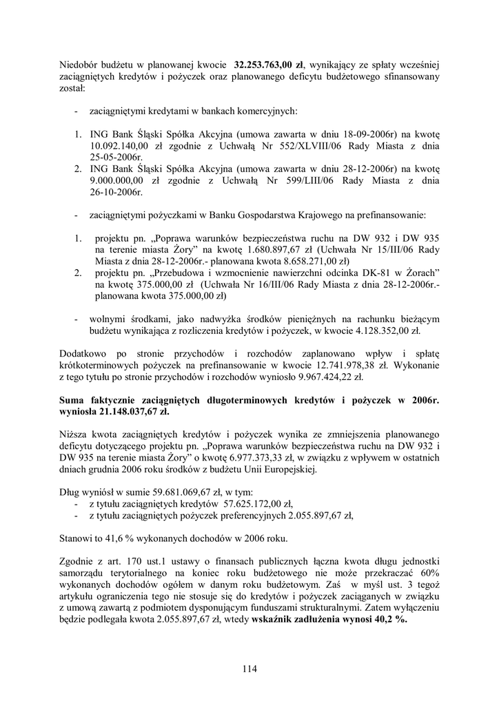 Niedobór budżetu w planowanej kwocie 32.253.763,00 zł, wynikający ze spłaty wcześniej zaciągniętych kredytów i pożyczek oraz planowanego deficytu budżetowego sfinansowany został: - zaciągniętymi kredytami w bankach komercyjnych: 1. ING Bank Śląski 10.092.140,00 zł 25-05-2006r. 2. ING Bank Śląski 9.000.000,00 zł 26-10-2006r. 1. 2. - Spółka Akcyjna (umowa zawarta w dniu 18-09-2006r) na kwotę zgodnie z Uchwałą Nr 552/XLVIII/06 Rady Miasta z dnia Spółka Akcyjna (umowa zawarta w dniu 28-12-2006r) na kwotę zgodnie z Uchwałą Nr 599/LIII/06 Rady Miasta z dnia zaciągniętymi pożyczkami w Banku Gospodarstwa Krajowego na prefinansowanie: projektu pn. „Poprawa warunków bezpieczeństwa ruchu na DW 932 i DW 935 na terenie miasta Żory” na kwotę 1.680.897,67 zł (Uchwała Nr 15/III/06 Rady Miasta z dnia 28-12-2006r.- planowana kwota 8.658.271,00 zł) projektu pn. „Przebudowa i wzmocnienie nawierzchni odcinka DK-81 w Żorach” na kwotę 375.000,00 zł (Uchwała Nr 16/III/06 Rady Miasta z dnia 28-12-2006r.planowana kwota 375.000,00 zł) wolnymi środkami, jako nadwyżka środków pieniężnych na rachunku bieżącym budżetu wynikająca z rozliczenia kredytów i pożyczek, w kwocie 4.128.352,00 zł. Dodatkowo po stronie przychodów i rozchodów zaplanowano wpływ i spłatę krótkoterminowych pożyczek na prefinansowanie w kwocie 12.741.978,38 zł. Wykonanie z tego tytułu po stronie przychodów i rozchodów wyniosło 9.967.424,22 zł. Suma faktycznie zaciągniętych długoterminowych kredytów i pożyczek w 2006r. wyniosła 21.148.037,67 zł. Niższa kwota zaciągniętych kredytów i pożyczek wynika ze zmniejszenia planowanego deficytu dotyczącego projektu pn. „Poprawa warunków bezpieczeństwa ruchu na DW 932 i DW 935 na terenie miasta Żory” o kwotę 6.977.373,33 zł, w związku z wpływem w ostatnich dniach grudnia 2006 roku środków z budżetu Unii Europejskiej. Dług wyniósł w sumie 59.681.069,67 zł, w tym: - z tytułu zaciągniętych kredytów 57.625.172,00 zł, - z tytułu zaciągniętych pożyczek preferencyjnych 2.055.897,67 zł, Stanowi to 41,6 % wykonanych dochodów w 2006 roku. Zgodnie z art. 170 ust.1 ustawy o finansach publicznych łączna kwota długu jednostki samorządu terytorialnego na koniec roku budżetowego nie może przekraczać 60% wykonanych dochodów ogółem w danym roku budżetowym. Zaś w myśl ust. 3 tegoż artykułu ograniczenia tego nie stosuje się do kredytów i pożyczek zaciąganych w związku z umową zawartą z podmiotem dysponującym funduszami strukturalnymi. Zatem wyłączeniu będzie podlegała kwota 2.055.897,67 zł, wtedy wskaźnik zadłużenia wynosi 40,2 %. 114 Spłaty kredytów zaciągniętych w bankach komercyjnych wyniosły 10.092.140,00 zł i składały się na nie: - Nordea Bank Polska (niedobór 2003) ING Bank Śląski (niedobór 2004) Kommunalkredit (niedobór 2004) ING Bank Śląski (niedobór 2005) 4.200.000,00 zł 2.688.992,00 zł 2.400.000,00 zł 803.148,00 zł Spłacony został również kredyt preferencyjny zaciągnięty w Banku Gospodarstwa Krajowego na koniec 2005 roku w kwocie 343.788,90 zł. Koszty odsetek od zaciągniętych kredytów i pożyczek wyniosły 2.077.588,50 zł, w tym: a) banki komercyjne 2.028.495,56 zł, b) kredyt w rachunku bieżącym 10.180,01 zł, c) pożyczki na prefinansowanie (ujęte w kosztach realizowanych inwestycji) 38.912,93 zł w tym : - „Poprawa warunków bezpieczeństwa ruchu na DW-932 i DW-935 na terenie miasta Żory” 32.962,99 zł, - „Przebudowa i wzmocnienie nawierzchni odcinka DK-81 w Żorach” 5.949,94 zł. Prowizje i inne koszty bankowe poniesione zostały w wysokości 50.530,88 zł. w tym: a) projekt „Poprawa warunków bezpieczeństwa ruchu na DW-932 i DW-935 na terenie miasta Żory” 891,00 zł, b) projekt „Przebudowa i wzmocnienie nawierzchni odcinka DK-81 w Żorach” 568,00 zł, c) pozostałe 49.071,88 zł (prowizja od kredytu zaciągniętego w banku komercyjnym, opłaty za wydane opinie bankowe). Zgodnie z art. 169 ust. 1 ustawy o finansach publicznych łączna kwota przypadających do spłaty w danym roku budżetowym rat kredytów i pożyczek wraz z należnymi w danym roku odsetkami nie może przekroczyć 15% planowanych na dany rok budżetowy dochodów jednostki samorządu terytorialnego. Za 2006 rok wskaźnik ten wyniósł 9,1%. Ograniczenia tego nie stosuje się do kredytów i pożyczek zaciąganych w związku z umową zawartą z podmiotem dysponującym funduszami strukturalnymi. Po uwzględnieniu wyłączeń w przypadku Miasta Żory wskaźnik ten ukształtował się na poziomie 8,8%. 115