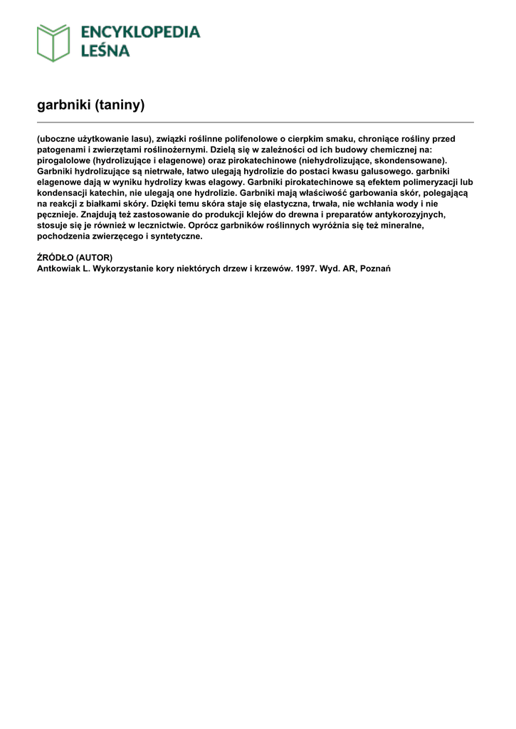 garbniki (taniny) (uboczne użytkowanie lasu), związki roślinne polifenolowe o cierpkim smaku, chroniące rośliny przed patogenami i zwierzętami roślinożernymi. Dzielą się w zależności od ich budowy chemicznej na: pirogalolowe (hydrolizujące i elagenowe) oraz pirokatechinowe (niehydrolizujące, skondensowane). Garbniki hydrolizujące są nietrwałe, łatwo ulegają hydrolizie do postaci kwasu galusowego. garbniki elagenowe dają w wyniku hydrolizy kwas elagowy. Garbniki pirokatechinowe są efektem polimeryzacji lub kondensacji katechin, nie ulegają one hydrolizie. Garbniki mają właściwość garbowania skór, polegającą na reakcji z białkami skóry. Dzięki temu skóra staje się elastyczna, trwała, nie wchłania wody i nie pęcznieje. Znajdują też zastosowanie do produkcji klejów do drewna i preparatów antykorozyjnych, stosuje się je również w lecznictwie. Oprócz garbników roślinnych wyróżnia się też mineralne, pochodzenia zwierzęcego i syntetyczne. ŹRÓDŁO (AUTOR) Antkowiak L. Wykorzystanie kory niektórych drzew i krzewów. 1997. Wyd. AR, Poznań
