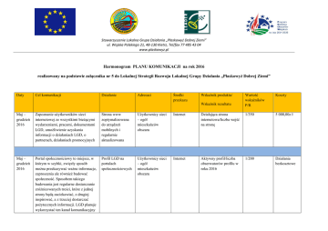 Stowarzyszenie Lokalna Grupa Działania „Płaskowyż Dobrej Ziemi” ul. Wojska Polskiego 21, 48-130 Kietrz, Tel/fax 77 485 43 04 www.plaskowyz.pl Harmonogram PLANU KOMUNIKACJI na rok 2016 realizowany na podstawie załącznika nr 5 do Lokalnej Strategii Rozwoju Lokalnej Grupy Działania „Płaskowyż Dobrej Ziemi” Daty Cel komunikacji Działanie Adresaci Środki przekazu Wskaźnik produktu/ Wskaźnik rezultatu Wartość wskaźników P/R Koszty Maj – grudzień 2016 Zapoznanie użytkowników sieci internetowej ze wszystkimi bieżącymi wydarzeniami, pracami, dokumentami LGD, umożliwienie uzyskania informacji o działaniach LGD, o partnerach, działaniach promocyjnych Strona www zoptymalizowana do urządzeń mobilnych i regularnie aktualizowana Użytkownicy sieci – ogół mieszkańców obszaru Internet Działająca strona internetowa/liczba wejść na stronę 1/350 5 000,00z ł Maj – grudzień 2016 Portal społecznościowy to miejsce, w którym w szybki, zwięzły sposób można przekazywać ważne informacje, zaproszenia ale również budować społeczność. Sposobem takiego budowania jest regularne dostarczanie zróżnicowanych treści, które z jednej strony będą zaciekawiać, z drugiej inspirować, a z trzeciej dostarczać pożytecznych informacji. LGD planuje wykorzystać ten kanał komunikacyjny Profil LGD na portalach społecznościowych Użytkownicy sieci – ogół mieszkańców obszaru Internet Aktywny profil/liczba obserwatorów profilu w roku 2016 1/200 Działania bezkosztowe Stowarzyszenie Lokalna Grupa Działania „Płaskowyż Dobrej Ziemi” ul. Wojska Polskiego 21, 48-130 Kietrz, Tel/fax 77 485 43 04 www.plaskowyz.pl także z tego powodu, że daje on możliwość pozyskiwania informacji zwrotnej od mieszkańców obszaru w prostej formie „lubię to”, jak również pozwala na dłuższe komentarze. Dzięki wbudowanemu modułowi prowadzenia statystyk LGD otrzymuje obraz zainteresowania treściami, które publikuje. Listopad Interakcja – otrzymanie informacji zwrotnej 2016 Część robocza tych spotkań umożliwi społeczności lokalnej wpływanie na kształt przyjmowanych rozwiązań oraz wypracowanie skutecznych praktyk w realizacji LSR. Dzięki części roboczej, moderowanej przez specjalistę będzie możliwe wprowadzenie korekt i ulepszeń oraz elastyczne reagowanie na nieprzewidywalne sytuacje obszaru LGD. Spotkania robocze mogą być krótkie stanowiące część spotkań tematycznych, mogą również w przypadku potrzeby podjęcia poważniejszych decyzji, mogą stanowić osobny rodzaj spotkań, wtedy powinny być poprzedzone krótką częścią integracyjną oraz szkoleniem Otwarte spotkania z mieszkańcami i partnerami LGD Mieszkańcy obszaru, zwłaszcza przedstawiciele grup defaworyzowanych Liczba spotkań/liczba osób biorących udział w spotkaniach ogółem 1/50 4 000,00 Stowarzyszenie Lokalna Grupa Działania „Płaskowyż Dobrej Ziemi” ul. Wojska Polskiego 21, 48-130 Kietrz, Tel/fax 77 485 43 04 www.plaskowyz.pl umiejętności współpracy, rozwijania twórczych postaw, szkoleniem przedmiotowym, dzięki czemu praca w grupie będzie bardziej efektywna i szybka. Grudzień Konferencja na temat realizacji „projektów grantowych” w 2017 r. Konferencje tematyczne Przedstawiciele organizacji i instytucji, będących reprezentacją różnych grup społecznych obszaru Liczba zorganizowanych konferencji/liczbę uczestników konferencji 1/100 8 000,00 Informowanie o planowanych działaniach LGD, w tym informacja o przeprowadzanych naborach Streetworking i animacja społeczna Mieszkańcy obszaru, zwłaszcza przedstawiciele grup defaworyzowanych Liczba materiałów promocyjnych/liczba osób, które otrzymały materiały promocyjne 1000/1000 12 000,00 2016 Sierpień – paździer nik 2016