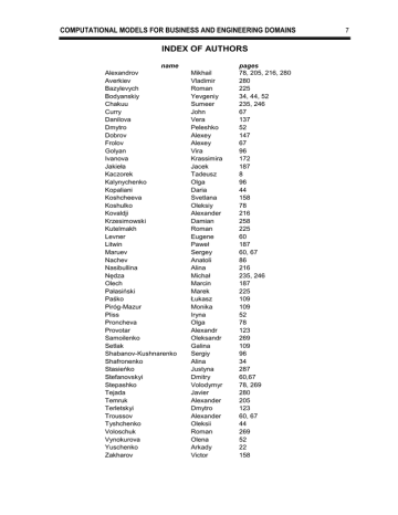 COMPUTATIONAL MODELS FOR BUSINESS AND ENGINEERING DOMAINS INDEX OF AUTHORS name Alexandrov Averkiev Bazylevych Bodyanskiy Chakuu Curry Danilova Dmytro Dobrov Frolov Golyan Ivanova Jakieła Kaczorek Kalynychenko Kopaliani Koshcheeva Koshulko Kovaldji Krzesimowski Kutelmakh Levner Litwin Maruev Nachev Nasibullina Nędza Olech Pałasiński Paśko Piróg-Mazur Pliss Proncheva Provotar Samoilenko Setlak Shabanov-Kushnarenko Shafronenko Stasieńko Stefanovskyi Stepashko Tejada Temruk Terletskyi Troussov Tyshchenko Voloschuk Vynokurova Yuschenko Zakharov Mikhail Vladimir Roman Yevgeniy Sumeer John Vera Peleshko Alexey Alexey Vira Krassimira Jacek Tadeusz Olga Daria Svetlana Oleksiy Alexander Damian Roman Eugene Paweł Sergey Anatoli Alina Michał Marcin Marek Łukasz Monika Iryna Olga Alexandr Oleksandr Galina Sergiy Alina Justyna Dmitry Volodymyr Javier Alexander Dmytro Alexander Oleksii Roman Olena Arkady Victor pages 78, 205, 216, 280 280 225 34, 44, 52 235, 246 67 137 52 147 67 96 172 187 8 96 44 158 78 216 258 225 60 187 60, 67 86 216 235, 246 187 225 109 109 52 78 123 269 109 96 34 287 60,67 78, 269 280 205 123 60, 67 44 269 52 22 158 7