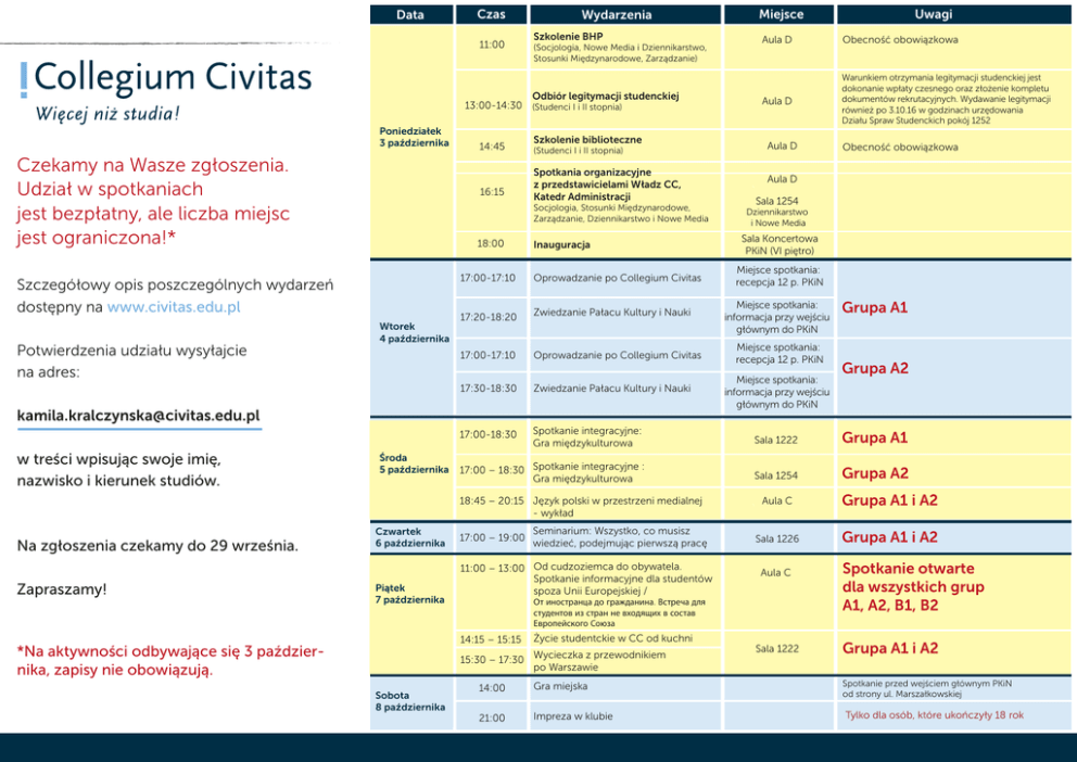 Data Czas 11:00 Wydarzenia Szkolenie BHP (Socjologia, Nowe Media i Dziennikarstwo, Stosunki Międzynarodowe, Zarządzanie) Odbiór legitymacji studenckiej 13:00-14:30 (Studenci I i II stopnia) Poniedziałek 3 października Czekamy na Wasze zgłoszenia. Udział w spotkaniach jest bezpłatny, ale liczba miejsc jest ograniczona!* 16:15 Szkolenie biblioteczne (Studenci I i II stopnia) Spotkania organizacyjne z przedstawicielami Władz CC, Katedr Administracji Socjologia, Stosunki Międzynarodowe, Zarządzanie, Dziennikarstwo i Nowe Media 18:00 Szczegółowy opis poszczególnych wydarzeń dostępny na www.civitas.edu.pl Potwierdzenia udziału wysyłajcie na adres: 14:45 Wtorek 4 października Inauguracja Środa 5 października Zapraszamy! Czwartek 6 października Piątek 7 października Aula D Warunkiem otrzymania legitymacji studenckiej jest dokonanie wpłaty czesnego oraz złożenie kompletu dokumentów rekrutacyjnych. Wydawanie legitymacji również po 3.10.16 w godzinach urzędowania Działu Spraw Studenckich pokój 1252 Aula D Obecność obowiązkowa Aula D Sala 1254 Dziennikarstwo i Nowe Media Sala Koncertowa PKiN (VI piętro) Miejsce spotkania: recepcja 12 p. PKiN Zwiedzanie Pałacu Kultury i Nauki 17:00-17:10 Oprowadzanie po Collegium Civitas 17:30-18:30 Zwiedzanie Pałacu Kultury i Nauki 17:00-18:30 Spotkanie integracyjne: Gra międzykulturowa Sala 1222 Grupa A1 17:00 – 18:30 Spotkanie integracyjne : Gra międzykulturowa Sala 1254 Grupa A2 17:00 – 19:00 Seminarium: Wszystko, co musisz wiedzieć, podejmując pierwszą pracę 11:00 – 13:00 Od cudzoziemca do obywatela. Spotkanie informacyjne dla studentów spoza Unii Europejskiej / Miejsce spotkania: informacja przy wejściu głównym do PKiN Miejsce spotkania: recepcja 12 p. PKiN Miejsce spotkania: informacja przy wejściu głównym do PKiN Życie studentckie w CC od kuchni 14:00 Gra miejska 21:00 Impreza w klubie Grupa A1 Grupa A2 Aula C Grupa A1 i A2 Sala 1226 Grupa A1 i A2 Aula C От иностранца до гражданина. Встреча для студентов из стран не входящих в состав Европейского Союза 15:30 – 17:30 Wycieczka z przewodnikiem po Warszawie Sobota 8 października Obecność obowiązkowa 17:20-18:20 14:15 – 15:15 *Na aktywności odbywające się 3 października, zapisy nie obowiązują. Aula D Oprowadzanie po Collegium Civitas 18:45 – 20:15 Język polski w przestrzeni medialnej - wykład Na zgłoszenia czekamy do 29 września. Uwagi 17:00-17:10 [email protected] w treści wpisując swoje imię, nazwisko i kierunek studiów. Miejsce Sala 1222 Spotkanie otwarte dla wszystkich grup A1, A2, B1, B2 Grupa A1 i A2 Spotkanie przed wejściem głównym PKiN od strony ul. Marszałkowskiej Tylko dla osób, które ukończyły 18 rok Sala wykładowa 1222 Sala wykładowa REKTORAT 1223 Sala wykładowa 1225 Sala wykładowa 1226 IT, Kierownik Administracji 1236 1212 Dział spr. Dyplomowych 1237 Biuro Rekrutacji 1238 1211 1210 RECEPCJA 1209 1253 1254 1252 1251 STUDENCI STUDIÓW LICENCJACKICH ORAZ MAGISTERSKICH stacjonarni Biuro Sala Współpracy komp. z zagranicą Sala wykładowa Harmonogram Adapter 2016/2017 r. 1250 1249 1253 1252 1251 Prorektor ds. Studentckich Dział Spraw Studenckich Dział Dydaktyki i Spraw Studentckich Sala komputerowa 1249 1248