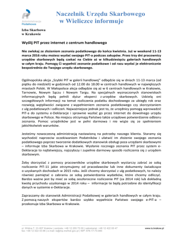 Naczelnik Urzędu Skarbowego w Wieliczce informuje Izba Skarbowa w Krakowie Wyślij PIT przez internet z centrum handlowego Nie zwlekaj ze złożeniem zeznania podatkowego do końca kwietnia. Już w weekend 11-13 marca 2016 roku możesz wysłać swojego PIT-a podczas zakupów. Przez trzy dni pracownicy urzędów skarbowych będą czekać na Ciebie aż w kilkudziesięciu galeriach handlowych w całym kraju. Pomogą Ci wypełnić zeznanie podatkowe i od razu wysłać je elektronicznie bezpośrednio do Twojego urzędu skarbowego. Ogólnopolska akcja „Szybki PIT w galerii handlowej” odbędzie się w dniach 11-13 marca (od piątku do niedzieli) w godzinach od 12.00 do 18.00 w centrach handlowych w największych miastach Polski. W Małopolsce akcja odbędzie się aż w 6 centrach handlowych w Krakowie, Tarnowie, Nowym Sączu i Nowym Targu. Na specjalnych wyznaczonych stanowiskach informacyjnych będą pełnili dyżur eksperci z urzędów skarbowych. Udzielą oni szczegółowych informacji na temat rozliczenia podatku dochodowego za ubiegły rok oraz rozwieją wątpliwości związane z wypełnieniem zeznania podatkowego czy skorzystaniem z ulg podatkowych i odliczeń. Najważniejsze jednak jest to, że urzędnicy pomogą wprowadzić PIT-a do systemu e-Deklaracje i sprawnie wysłać go przez internet do dowolnego urzędu skarbowego w Polsce. Na miejscu otrzymają Państwo także urzędowe potwierdzenie odbioru zeznania. Pomoc urzędników jest w pełni darmowa i nie wiąże się ze spełnieniem jakichkolwiek warunków. Jesteśmy nowoczesną administracją nastawioną na potrzeby naszego klienta. Staramy się wychodzić naprzeciw oczekiwaniom Podatników i ułatwić im złożenie swojego zeznania podatkowego poprzez tworzenie dodatkowych stanowisk obsługi poza urzędami skarbowymi – informuje Izba Skarbowa w Krakowie. Wysłanie rocznego zeznania PIT przez system eDeklaracje to najłatwiejszy, najszybszy i zupełnie darmowy sposób rozliczenia się z urzędem skarbowym. Żeby skorzystać z pomocy pracowników urzędów skarbowych wystarczy zabrać ze sobą rozliczenie PIT-11 jakie otrzymujemy od pracodawców lub inne dokumenty świadczące o uzyskanych dochodach w 2015 roku. Jeśli chcemy skorzystać z ulg podatkowych, to należy również pamiętać o zabraniu ze sobą potwierdzenia wydatków, które chcemy odliczyć. Bardzo ważne jest by mieć ze sobą zeszłoroczne rozliczenie PIT (za 2014 rok) lub dokładną kwotę przychodu uzyskanego w 2014 roku – informacje te będą potrzebne do identyfikacji danych w systemie e-Deklaracje. Zapraszamy do stanowisk Administracji Podatkowej w galeriach handlowych w całym kraju. Z pomocą naszych ekspertów bardzo szybko wypełnicie Państwo swojego e-PIT-a – przekonuje Izba Skarbowa w Krakowie. ul. Wiślna 7, 31-007 Kraków | centrala: +48 12 255 73 00 | sekretariat: +48 12 422 00 47 fax: +48 12 422 43 86 | e-mail: [email protected] | NIP: 676-17-73-084 www.is.krakow.pl Akcja „Szybki PIT w galeriach handlowych” zostanie zorganizowana w następujących obiektach w woj. małopolskim: Lp Nazwa CH Miasto Adres CH 1 2 3 4 5 Galeria Krakowska M1 Kraków CH Czyżyny Galeria Tarnovia Galeria Sandecja Kraków Kraków Kraków Tarnów Nowy Sącz ul. Pawia 5 al. Pokoju 67 ul. Medweckiego 2 ul. Krakowska 149/154 ul. Węgierska 170 6 Galeria Nowotarska Buy & Fly Nowy Targ ul. Królowej Jadwigi 17 Lista lokalizacji dostępna jest na stronie www.SzybkiPIT.pl Uwaga! Na stanowiskach w galeriach handlowych urzędnicy nie będą przyjmować zeznań podatkowych PIT w formie papierowej. Przydatne linki: Rzecznik Prasowy Izby Skarbowej w Krakowie Konrad Zawada www.SzybkiPit.pl www.portalpodatkowy.mf.gov.pl www.is.krakow.pl 12 25 57 413 607 507 800 [email protected]