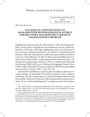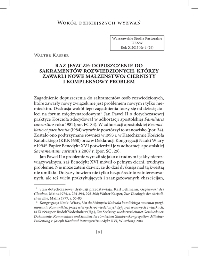 Wokół dzisiejszych wyzwań Warszawskie Studia Pastoralne UKSW Rok X 2015 Nr 4 (29) Walter Kasper RAZ JESZCZE: DOPUSZCZENIE DO SAKRAMENTÓW ROZWIEDZIONYCH, KTÓRZY ZAWARLI NOWE MAŁŻEŃSTWO? CIERNISTY I KOMPLEKSOWY PROBLEM Zagadnienie dopuszczenia do sakramentów osób rozwiedzionych, które zawarły nowy związek nie jest problemem nowym i tylko niemieckim. Dyskusja wokół tego zagadnienia toczy się od dziesięcioleci na forum międzynarodowym1. Jan Paweł II o dotychczasowej praktyce Kościoła zdecydował w adhortacji apostolskiej Familiaris consortio z roku 1981 (por. FC 84). W adhortacji apostolskiej Reconciliatio et paenitentia (1984) wyraźnie powtórzył to stanowisko (por. 34). Zostało ono podtrzymane również w 1993 r. w Katechizmie Kościoła Katolickiego (KKK 1650) oraz w Deklaracji Kongregacji Nauki Wiary z 19942. Papież Benedykt XVI potwierdził je w adhortacji apostolskiej Sacramentum caritatis z 2007 r. (por. SC, 29). Jan Paweł II o problemie wyraził się jako o trudnym i jakby nierozwiązywalnym, zaś Benedykt XVI mówił o pełnym cierni, trudnym problemie. Nie może zatem dziwić, że do dziś dyskusja nad tą kwestią nie umilkła. Dotyczy bowiem nie tylko bezpośrednio zainteresowanych, ale też wielu praktykujących i zaangażowanych chrześcijan, 1 Stan dotychczasowej dyskusji przedstawiają: Karl Lehmann, Gegenwart des Glauben, Mainz 1974, s. 274-294, 295-308; Walter Kasper, Zur Theologie der christlichen Ehe, Mainz 1977, s. 55-83. 2 Kongregacja Nauki Wiary, List do Biskupów Kościoła katolickiego na temat przyjmowania Komunii św. przez wiernych rozwiedzionych żyjących w nowych związkach, 14 IX 1994; por. Rudolf Voderholzer (Hg.), Zur Seelsorge wiederverheiratet Geschiedener. Dokumente, Kommentare und Studien der römischen Glaubenskongregation. Mit einer Einleitung v. Joseph Kardinal Ratzinger/Benedykt XVI, Würzburg 2014. |9| Walter Kasper którzy żyją w małżeństwie od pięćdziesięciu i więcej laty i sami nigdy nie myśleli o rozwodzie, ale boleśnie doświadczyli tego problemu u swoich dzieci czy wnucząt. Z kolei ich dzieci mają utrudnioną drogę do sakramentów, skoro ich rodzice nie mogą po niej kroczyć – tak więc cała rodzina dotknięta jest tym problemem. Nic więc dziwnego, że ciąży on na sumieniu wielu wiernych, duszpasterzy i spowiedników, teologów oraz biskupów. Toteż oczekiwano, że w przededniu Nadzwyczajnego Synodu Biskupów 2014 i podczas jego trwania kwestia ta zapłonie nowym blaskiem i jako kontrowersyjna stanie się przedmiotem ożywionej dyskusji3. Zwyczajny Synod Biskupów 2015 winien przynieść propozycje rozwiązań, pozostawiając je ostatecznemu rozstrzygnięciu Papieża. Nie mogę i nie chcę antycypować decyzji przyszłego Zgromadzenia Biskupów. Chcę podjąć jedynie próbę, aby niniejszymi uwagami wyjaśnić i pogłębić – na ile jestem w stanie – istotę problemu. Słowo Jezusa – obowiązuje i zawsze stanowi nowe wyzwanie Podstawą jest słowo Jezusa, które mówi, że nie wolno człowiekowi rozłączyć tego, co Bóg złączył. Prawda ta znajduje się we wszystkich Ewangeliach synoptycznych (Mt 5,32; 19,9; Mk 10,9; Łk 16,18). Poświadczona jest także przez Apostoła Pawła (1 Kor 7,10n)4. Nie może 3 Walter Kasper, Das Evangelium von der Familie. Die Rede vor dem Konsistorium, Freiburg 2014. Mój odczyt traktuje o problemie rozwiedzionych żyjących w nowych związkach w ostatnim rozdziale (54-67) i tylko w niewielkim stopniu. Miał on jedynie wywołać dyskusję – samego rozwiązania nie przedstawiłem. Poszczególne kwestie spotkały się z uznaniem, ale też i z krytyką. W niniejszych uwagach nie odnoszę się bezpośrednio do tej krytyki, lecz tylko pośrednio, wyjaśniając swoje stanowisko wobec licznych nieporozumień oraz kontynuując i pogłębiając własne przemyślenia. 4 Owoce dyskusji między egzegetami nad słowem Jezusa są nieprzebrane. Odnośnie starszych stanowisk por. przyp. 1. Przegląd najnowszej dyskusji u Ulrich Luz, Das Evangelium nach Matthaus, Mt 1-7 (EKK Bd. I/1), Würzburg 1997, s. 88-103. Ponieważ dotychczas ukazało się mnóstwo przyczynków, wystarczyć musi wskazanie tylko niektórych: Markus Graulich, Martin Seidnader (Hg.), Zwischen Jesu Wort und Norm. Kirchliches Handel angesichts von Scheidung und Wiederheirat (QD 264), Freiburg 2014 z artykułami: Dominik Markl SJ i Thomas Söding; por. Konrad | 10 | Raz jeszcze: dopuszczenie do sakramentów rozwiedzionych… istnieć żadna rozumna wątpliwość, że w swej substancji sięga ona do samego Jezusa. W swym niesłychanym radykalizmie takie słowa Jezusa wydają się gorszące nie tylko dzisiaj. Już pierwsi uczniowie byli nimi zszokowani, a dla ówczesnego hellenistyczno-rzymskiego świata stanowiły totalną prowokację. Jak wówczas, tak i dziś w znikomym stopniu możemy złagodzić słowo Jezusa przystosowując je do sytuacji. Jezus odrzucił tym samym odwołującą się do Pwt 24,1 żydowską kazuistykę, nie uznając równocześnie wszelkiej innej kazuistycznej interpretacji oraz wyjątkowej regulacji odnośnie pierwotnej woli Bożej. Zatem słowo Jezusa nie jest wypowiedzią o charakterze prawnym, ale zasadą, dzięki której Kościół wraz z udzieloną mu przez Chrystusa władzą związywania i rozwiązywania (Mt 16,19; 18,18; J 20,23) musi zapewnić skuteczność w zmiennych sytuacjach kulturowych. Dlatego słowa Jezusa nie wolno interpretować na sposób fundamentalistyczny. Ważne jest badanie granic tego słowa oraz jego zasięg, by w całości móc pojąć to Jezusowe przesłanie i zachować mu wierność, nie popełniając przy tym nadużyć5. Taką właściwą interpretację znajdujemy już w czasach nowotestamentowych: w znanych klauzulach cudzołóstwa przeznaczonych dla żydowskiej gminy Mateusza (5,32; 19,), u Pawła, który w nowym pogańsko-chrześcijańskim środowisku władzą apostolską zdecydował na rzecz wolności chrześcijańskiej, że małżeństwo, w którym p
