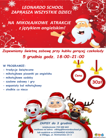LEONARDO SCHOOL ZAPRASZA WSZYSTKIE DZIECI NA MIKOŁAJKOWE ATRAKCJE z językiem angielskim! Zapewniamy świetną zabawę przy kubku gorącej czekolady 5 grudnia godz. 18:00-21:00 W PROGRAMIE: - tradycje świąteczne - mikołajkowe piosenki po angielsku - mikołajkowe ozdoby Cena - szalone zabawy i gry - wspaniały bal mikołajkowy - słodkie co nieco ZAPISY do 3 grudnia telefonicznie 733 500 443 mailowo na adres: [email protected] lub osobiście w LEONARDO SCHOOL w Elblągu, ul. Hetmańska 15 I-J 30zł