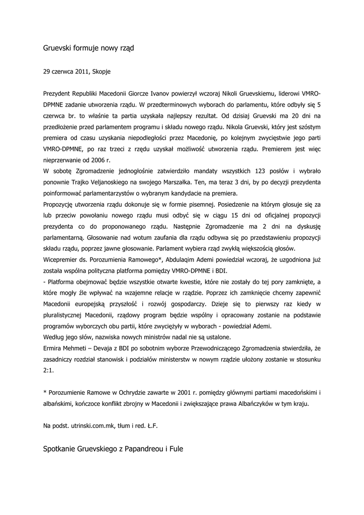Gruevski formuje nowy rząd 29 czerwca 2011, Skopje Prezydent Republiki Macedonii Giorcze Ivanov powierzył wczoraj Nikoli Gruevskiemu, liderowi VMRODPMNE zadanie utworzenia rządu. W przedterminowych wyborach do parlamentu, które odbyły się 5 czerwca br. to właśnie ta partia uzyskała najlepszy rezultat. Od dzisiaj Gruevski ma 20 dni na przedłożenie przed parlamentem programu i składu nowego rządu. Nikola Gruevski, który jest szóstym premiera od czasu uzyskania niepodległości przez Macedonię, po kolejnym zwycięstwie jego parti VMRO-DPMNE, po raz trzeci z rzędu uzyskał możliwość utworzenia rządu. Premierem jest więc nieprzerwanie od 2006 r. W sobotę Zgromadzenie jednogłośnie zatwierdziło mandaty wszystkich 123 posłów i wybrało ponownie Trajko Veljanoskiego na swojego Marszałka. Ten, ma teraz 3 dni, by po decyzji prezydenta poinformować parlamentarzystów o wybranym kandydacie na premiera. Propozycję utworzenia rządu dokonuje się w formie pisemnej. Posiedzenie na którym głosuje się za lub przeciw powołaniu nowego rządu musi odbyć się w ciągu 15 dni od oficjalnej propozycji prezydenta co do proponowanego rządu. Następnie Zgromadzenie ma 2 dni na dyskusję parlamentarną. Głosowanie nad wotum zaufania dla rządu odbywa się po przedstawieniu propozycji składu rządu, poprzez jawne głosowanie. Parlament wybiera rząd zwykłą większością głosów. Wicepremier ds. Porozumienia Ramowego*, Abdulaqim Ademi powiedział wczoraj, że uzgodniona już została wspólna polityczna platforma pomiędzy VMRO-DPMNE i BDI. - Platforma obejmować będzie wszystkie otwarte kwestie, które nie zostały do tej pory zamknięte, a które mogły źle wpływać na wzajemne relacje w rządzie. Poprzez ich zamknięcie chcemy zapewnić Macedonii europejską przyszłość i rozwój gospodarczy. Dzieje się to pierwszy raz kiedy w pluralistycznej Macedonii, rządowy program będzie wspólny i opracowany zostanie na podstawie programów wyborczych obu partii, które zwyciężyły w wyborach - powiedział Ademi. Według jego słów, nazwiska nowych ministrów nadal nie są ustalone. Ermira Mehmeti – Devaja z BDI po sobotnim wyborze Przewodniczącego Zgromadzenia stwierdziła, że zasadniczy rozdział stanowisk i podziałów ministerstw w nowym rządzie ułożony zostanie w stosunku 2:1. * Porozumienie Ramowe w Ochrydzie zawarte w 2001 r. pomiędzy głównymi partiami macedońskimi i albańskimi, kończoce konflikt zbrojny w Macedonii i zwiększające prawa Albańczyków w tym kraju. Na podst. utrinski.com.mk, tłum i red. Ł.F. Spotkanie Gruevskiego z Papandreou i Fule 23 czerwca 2011 r., Bruksela Premier Nikola Gruevski przy okazji szczytu Europejskiej Partii Ludowej, który rozpoczął się dziś o 17:30 w siedzibie Rady Unii Europejskiej w Brukseli, spotka się ze swym greckim odpowiednikiem Jorgosem Papandreou. Premier Macedonii spotkał się już w Brukseli z komisarzem ds rozszerzenia, Stefanem Fule. Jak informuje agencja MIA, Gruevski podczas spotkania, poinformował o stanie realizacji programu reform podjętych w celu spełnienia kryteriów kopenhaskich będących warunkiem akcesji. Zwrócił też uwagę na szczegóły dotyczące rozwiązania sporu z Grecją w sprawie nazwy państwa. Następnie podkreślił wolę i zaangażowanie Macedonii w celu rozwiązania problemu i odblokowania europejskiej i euroatlantyckiej integracji Macedonii. Komisarz Fule z zadowoleniem ocenił kampanię i przebieg wyborów w Macedonii, a także zwrócił uwagę na reformy w kraju, zwłaszcza w dziedzinie sądownictwa i administracji oraz walkę z korupcją. Podkreślił, że koniec 2011 roku będzie dobrym momentem dla procesów związanych z rozszerzeniem na Bałkany Zachodnie. Fule zgodził się na współpracę z premierem nad dalszymi reformami. Premier Gruevski wraz z ministrem spraw zagranicznych Antonio Miloszoskim i szefem kancelarii premiera Martinem Protogierem wezmą udział w szczycie Europejskiej Partii Ludowej, grupy partii politycznych, która zrzesza partie prawicowe i centroprawicowe w Europie. EPL jest najpotężniejszą siłą polityczną w Europie. Do niej należą między innymi członkowie partii niemieckiej kanclerz Angeli Merkel, prezydenta Francji Nicolasa Sarkoziego, premiera Włoch Silvio Berlusconiego, premiera Węgier Viktora Orbana oraz partia obecnego przewodniczącego Komisji Europejskiej, Jose Manuela Barroso. Na podst. vreme.com.mk, tłum. i red. Ł.F., zdjęcie Vreme Gdzie na mapie niemieckich inwestorów jest Macedonia? 16 czerwca 2011, Berlin Na dwudniowej konferencji gospodarczej o na Bałkanach, która odbywa się właśnie w Berlinie i która gromadzi wielu potencjalnych niemieckich inwestorów, na rzecz inwestycji w swoim kraju lobbuje wielu wicepremierów i ministrów państw bałkańskich. Nie ma jednak przedstawicieli Macedonii. Czy w takiej sytuacji powinien dziwić brak zainteresowania Macedonią ze strony największych inwestorów na Bałkanach? Według berlińskich ekspertów potencjał Macedonii tkwi w rozwoju elektrowni, tekstyliów typu lowproducts, eksploatacji miedzi i złota oraz w budowie autostrad. Od inwestycji powstrzymuje ryzyko ciągłych nieporozumień z Grecją, słaba siła nabywcza i wysokie bezrobocie. - W nadchodzących latach spodziewać się należy większego zaangażowania biznesu w Macedonii. Obecnie jako przestrzenie inwestycyjne mogę wskazać produkcję rolną, jak również wiele usług, które nie są jeszcze obecne na tamtejszym rynku – powiedział Hans Heinrich Driftman, prezes Niemieckiej Izby Przemysłowo-Handlowej. Przewodniczący Komisji ds. gospodarki Niemiec na Wschodzie, prof. Rainer Lindner,twierdzi, że zbyt długo mówi się tylko o potencjale regionu. - Nadszedł czas, by mówić o rzeczywistych projektach - mówi prof Linder, który dwudniowe spotkanie niemieckich inwestorów oraz czołowych polityków z krajów bałkańskich uważa za realną szansę rozwoju dla obu stron. - Dla przedsiębio