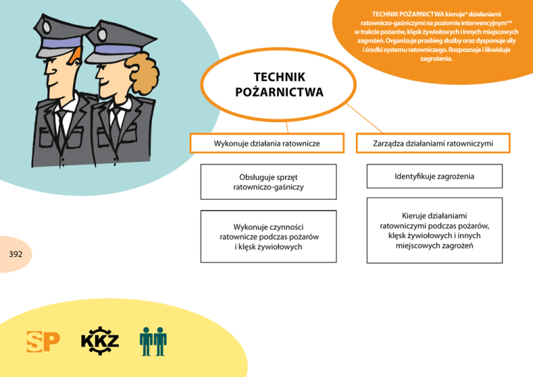 Technik pożarnictwa kieruje* działaniami ratowniczo-gaśniczymi na poziomie interwencyjnym** w trakcie pożarów, klęsk żywiołowych i innych miejscowych zagrożeń. Organizuje przebieg służby oraz dysponuje siły i środki systemu ratowniczego. Rozpoznaje i likwiduje zagrożenia. Technik pożarnictwa 392 Wykonuje działania ratownicze Zarządza działaniami ratowniczymi Obsługuje sprzęt ratowniczo-gaśniczy Identyfikuje zagrożenia Wykonuje czynności ratownicze podczas pożarów i klęsk żywiołowych Kieruje działaniami ratowniczymi podczas pożarów, klęsk żywiołowych i innych miejscowych zagrożeń ja, ty, my, oni... Będziesz pracować w zespole, gdzie ważna jest współpraca i zrozumienie. Praca w tym zawodzie jest związana z kontaktem z ludźmi. W pracy potrzebne są: podzielność uwagi, zręczność ruchów, refleks, wytrzymałość na długotrwały wysiłek. kariera edukacyjna W pracy tej wskazane jest posiadanie prawa jazdy. Twoja praca będzie wymagać sprawności fizycznej i znajomości języków obcych. Dominuje ustny sposób porozumiewania się, konieczne jest jednak także pisanie raportów. Używane są również urządzenia telekomunikacyjne. W czasie trwania akcji może być konieczne porozumiewanie się za pomocą gestów lub dźwięków. Będziesz odpowiedzialny za bezpieczeństwo i zdrowie ludzi ratowanych, a także podległych ratowników. Praca nie będzie mieć charakteru rutynowego. warunki pracy Będziesz pracować na zmiany, 24 godziny pracy i 48 godzin wypoczynku, dzień pracy może przypadać na niedzielę, święta oraz dni ustawowo wolne od pracy. kariera zawodowa Pracę znajdziesz w jednostkach straży pożarnej, ośrodkach szkolenia pożarniczego i przeciwpożarowego, w instytucjach posiadających działy ochrony przeciwpożarowej. Pracować będziesz w różnych miejscach w zależności od okoliczności zdarzenia – na wolnym powietrzu (pożary lasów, katastrofy komunikacyjne), w budynkach (pożary, ewakuacja ludzi) w skrajnie niebezpiecznych warunkach. W pracy możesz spotkać się z zagrożeniem związanym z ryzykiem wypadków podczas interwencji. 393