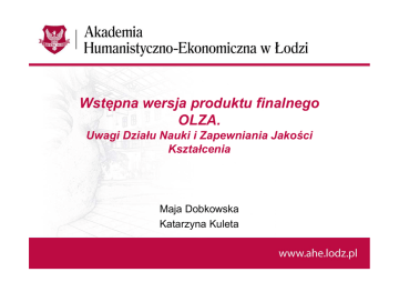 Wstępna wersja produktu finalnego OLZA. Uwagi Działu Nauki i Zapewniania Jakości Kształcenia Maja Dobkowska Katarzyna Kuleta Jak zachęcić studentów i absolwentów do korzystania z platformy? Jak zachęcić osoby aktywne zawodowo do korzystania z platformy? Uwagi ogóle • Szata graficzna – oŜywienie strony poprzez dobór odpowiednich kolorów, zdjęcia młodych ludzi, etc. • Zamieszczane treści – atrakcyjne dla studentów i absolwentów (szczególnie w kontekście poszukiwania pracy, podnoszenia kwalifikacji zawodowych). • Udostępniane narzędzia – przydatne z punktu wiedzenia rozwoju kariery zawodowej. Narzędzia absolwenta - CV • Generowanie CV w formacie PDF celem wykorzystania w rekrutacji poza OLZĄ: – – – – – moŜliwość wybierania oraz dodawania własnych modułów, które uŜytkownik chce zawrzeć w generowanym przez siebie CV, dodawanie zdjęcia do CV, moŜliwość zmiany szaty graficznej - koloru CV, moŜliwość wpisania znajomości dodatkowych języków obcych i oceny poziomów ich znajomości wg standardów europejskich (słuchanie/pisanie/czytanie, poziom A1, A2, …), moŜliwość dodania własnych modułów/obszarów (np. umiejętności zdobyte w pracy). Narzędzia absolwenta - biogram • Wyraźne odróŜnienie biogramu od listu motywacyjnego. • Generowanie biogramu z uwzględnieniem nazwy dokumentu oraz tytułów poszczególnych modułów, których dotyczą opisy (uzyskane kwalifikacje, opis wykonywanej pracy, etc.): – zarówno uŜytkownik, jak i pracodawca muszą widzieć róŜnicę między biogramem a listem motywacyjnym. Narzędzia absolwenta list motywacyjny • UmoŜliwienie tworzenia listu motywacyjnego - jako integralnego elementu aplikacji kandydata na stanowisko pracy. Narzędzia absolwenta – oferty pracy • MoŜliwość wyszukiwania ofert pracy wg kierunków studiów/branŜ (oferty kierowane do studentów/absolwentów konkretnych kierunków). • MoŜliwość filtrowania ofert kierowanych wyłącznie do studentów, absolwentów oraz ofert wspólnych. • Informacje o dacie dodania i/lub terminie waŜności oferty. • Współpraca z Urzędami Pracy oraz organizacjami pozarządowymi (oferty pracy, praktyk, wolontariatu). Moduł „Student – Absolwent” • Uatrakcyjnienie treści poprzez podawanie przykładów, linków do innych stron. • Informacje dotyczące: – – – sytuacji na rynku pracy (artykuły, wywiady, badania, linki), szkoleń, konferencji, cenionych na rynku pracy umiejętności i kompetencji. • Rozmowa kwalifikacyjna: – – – przygotowanie do spotkania z pracodawcą (strój, często zadawanie pytania, niezbędne dokumenty), zachowanie podczas rozmowy (stres, mowa ciała, ogólne zasady zachowania w sytuacjach formalnych), przykładowe filmy. • Dodatkowa zakładka z testami, narzędziami coachingowymi (np. testy z kreatywności, role grupowe, koło Ŝycia, narzędzia wypracowane w ramach projektów realizowanych przez poszczególne uczelnie). Dodatkowe pomysły • Punkty za aktywność na koncie (wypełnienie ankiety, zaproszenie pracodawcy do współpracy w ramach OLZY, etc.) zamieniane np. na zniŜki na kursy, studia realizowane przez uczelnie. • Dostęp dla studentów i absolwentów do profili pracodawców (prezentacja profili pracodawców). • Połączenie działań realizowanych przez uczelnie z platformą OLZA (np. „Metoda projektów” realizowana w AHE). • Udostępnienie wyników z badań prowadzonych wśród studentów realizowanych przez uczelnie. • Projekt „Młodzi w Łodzi” jako przykład dobrej praktyki w zakresie wsparcia studentów i absolwentów na rynku pracy. Ankieta • Dostosowanie formuły ankiety do osoby wypełniającej (kobiety/męŜczyzny). • Dopracowanie formy pytań: – – – skala (od najniŜszego punktu do najwyŜszego, od punktu 1 do 7), tabelaryczne ujęcie pytań zblokowanych, korekta błędów. • Doprecyzowanie pytań mogących budzić wątpliwości. • • Rok urodzenia – przedział czasowy. Ukończenie studiów – miesiąc i rok. Dziękujemy za uwagę