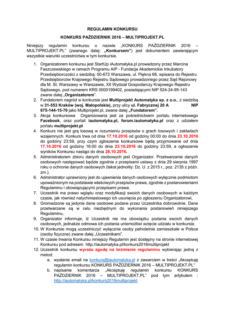 REGULAMIN KONKURSU KONKURS PAŹDZIERNIK 2016 – MULTIPROJEKT.PL Niniejszy regulamin konkursu o nazwie „KONKURS PAŹDZIERNIK 2016 – MULTIPROJEKT.PL” (zwanego dalej: „Konkursem”) jest dokumentem zawierającym wszystkie warunki uczestnictwa w tym konkursie. 1. Organizatorem konkursu jest StartUp iAutomatyka.pl prowadzony przez Marcina Faszczewskiego w ramach Programu AIP - Fundacja Akademickie Inkubatory Przedsiębiorczości z siedzibą: 00-672 Warszawa, ul. Piękna 68, wpisana do Rejestru Przedsiębiorców Krajowego Rejestru Sądowego prowadzonego przez Sąd Rejonowy dla M. St. Warszawy w Warszawie, XII Wydział Gospodarczy Krajowego Rejestru Sądowego, pod numerem KRS 0000199402, posiadającymi NIP 524-24-95-143 zwane dalej „Organizatorem”. 2. Fundatorem nagród w konkursie jest Multiprojekt Automatyka sp. z o.o., z siedzibą w 31-553 Kraków (woj. Małopolskie), przy ulicy ul. Fabrycznej 20 A NIP 675-144-15-70 jako Multiprojekt.pl, zwane dalej „Fundatorem”. 3. Akcja konkursowa Organizowana jest za pośrednictwem portalu internetowego Facebook, oraz portali iautomatyka.pl, forum.iautomatyka.pl oraz z udziałem portalu multiprojekt.pl 4. Konkurs nie jest grą losową w rozumieniu przepisów o grach losowych i zakładach wzajemnych. Konkurs trwa od dnia 17.10.2016 od godziny 00:00 do dnia 23.10.2016 do godziny 23:59, przy czym zgłoszenia konkursowe będą przyjmowane od dnia 17.10.2016 od godziny 16:00 do dnia 23.10.2016 do godziny 23:59, a ogłoszenie wyników Konkursu nastąpi do dnia 26.10.2016. 5. Administratorem zbioru danych osobowych jest Organizator. Przetwarzanie danych osobowych następować będzie zgodnie z przepisami ustawy z dnia 29 sierpnia 1997 roku o ochronie danych osobowych (tekst jednolity: Dz. U. z 2015 r., poz. 2135 z późn. zm.). 6. Administrator uprawniony jest do ujawnienia danych osobowych wyłącznie podmiotom upoważnionym na podstawie właściwych przepisów prawa, zgodnie z postanowieniami Regulaminu i obowiązującymi przepisami prawa. 7. Uczestnik ma prawo wglądu oraz modyfikacji swoich danych osobowych w każdym czasie, jak również natychmiastowego ich usunięcia po zgłoszeniu Organizatorowi, 8. Gromadzone są jedynie dane osobowe podane przez Uczestnika dobrowolnie. Dane przetwarzane są w celu niezbędnym do wykonania postanowień niniejszego Regulaminu, 9. Organizator informuje, iż Uczestnik nie ma obowiązku podania swoich danych osobowych, jednakże odmowa ich podania uniemożliwi wzięcie udziału w konkursie. 10. W Konkursie mogą uczestniczyć wyłącznie osoby pełnoletnie zamieszkałe w Polsce (osoby fizyczne) zwane dalej „Uczestnikami”. 11. W czasie trwania Konkursu niniejszy Regulamin jest dostępny na stronie internetowej Konkursu pod adresem http://iautomatyka.pl/konkurs2016multiprojekt 12. Uczestnik konkursu wyraża zgodę na brzmienie regulaminu wybierając jedną z metod: a. wysłanie email na [email protected] z zawarciem w treści „Akceptuję regulamin konkursu KONKURS PAŹDZIERNIK 2016 – MULTIPROJEKT.PL” b. napisanie komentarza „Akceptuję regulamin konkursu KONKURS PAŹDZIERNIK 2016 – MULTIPROJEKT.PL” pod tym artykułem : http://iautomatyka.pl/konkurs2016multiprojekt c. pod samodzielnie wykonanym i opublikowanym zdjęciem konkursowym na fanpage pod adresem https://www.facebook.com/iautomatyka/. Z udziału w Konkursie wyłączeni są pracownicy oraz członkowie organów Organizatora i Fundatora, jak również ich małżonkowie, powinowaci w linii prostej pierwszego stopnia. 13. Zadaniem Uczestnika jest samodzielne wykonanie i opublikowanie fotografii pt. „Multiprojekt i automatyka” w komentarzu pod postem konkursowym na fanpage pod adresem https://www.facebook.com/iautomatyka/. 14. Zwycięzcami konkursu zostaną 3 osoby, których rozwiązania zadania konkursowego Komisja Konkursowa uzna za najbardziej ciekawe i kreatywne. 15. W skład Komisji Konkursowej wejdą 3 (trzy) osoby - przedstawiciele Organizatora i Fundatora. 16. Z pośród Uczestników zostaną wybrane 3 osoby, które otrzymają następujące nagrody: a. MIEJSCE 1: Sterownik PLC „FATEK FBS-10MARU-AC” oraz zestaw gadżetów multiprojekt.pl o łącznej wartości 600,00 zł b. MIEJSCE 2: Książka „Automatyka przemysłowa w praktyce- projektowanie, modernizacja i naprawa”- Marek Wiktor Szelerski, wyd. KaBe, Krosno 2016 oraz zestaw gadżetów multiprojekt.pl o łącznej wartości 95,00 zł c. MIEJSCE 3: Zestaw gadżetów multiprojekt.pl o łącznej wartości 50,00 zł 17. Uczestnicy mogą uzyskać informacje o laureatach poprzez ogłoszenie wyników konkursu na stronie internetowej pod adresem https://www.facebook.com/iautomatyka/, co nastąpi do dnia 26.10.2016 roku. 18. Przystępując do konkursu poprzez akceptację regulaminu (patrz pkt. 12 regulaminu) uczestnicy wyrażają Organizatorowi zgodę na publikację w serwisie społecznościowym Facebook oraz na portalach internetowych iautomatyka.pl, forum.iautomatyka.pl oraz multiprojekt.pl, ich imienia, nazwiska, miejscowości zamieszkania, pseudonimu (nick) lub nazwy ich profilu, którym posługują się serwisie Facebook, a także treści rozwiązania zadania konkursowego przez Uczestnika, zarówno podczas trwania konkursu jak i w informacjach związanych z jego rozstrzygnięciem. 19. Laureat winien w terminie 7 dni od ogłoszenia wyników konkursu przesłać do Organizatora na adres e-mail [email protected], informacje o swoich danych adresowych: swoje imię, nazwisko oraz adres zamieszkania, w celu przesłania im nagrody przesyłką kurierską za pokwitowaniem, która zostanie wysłana w terminie kolejnych 14 dni roboczych, liczonych od dnia otrzymania od laureata wiadomości zwrotnej o swoich danych adresowych. 20. W przypadku braku przesłania do Organizatora w ww. terminie danych adresowych laureata potrzebnych do wysłania nagrody lub dwukrotnego nieodebrania przez laureata przesyłki z nagrodą, prawo do nagrody ulega przepadkowi. 21. Laureat nie jest uprawniony do prze
