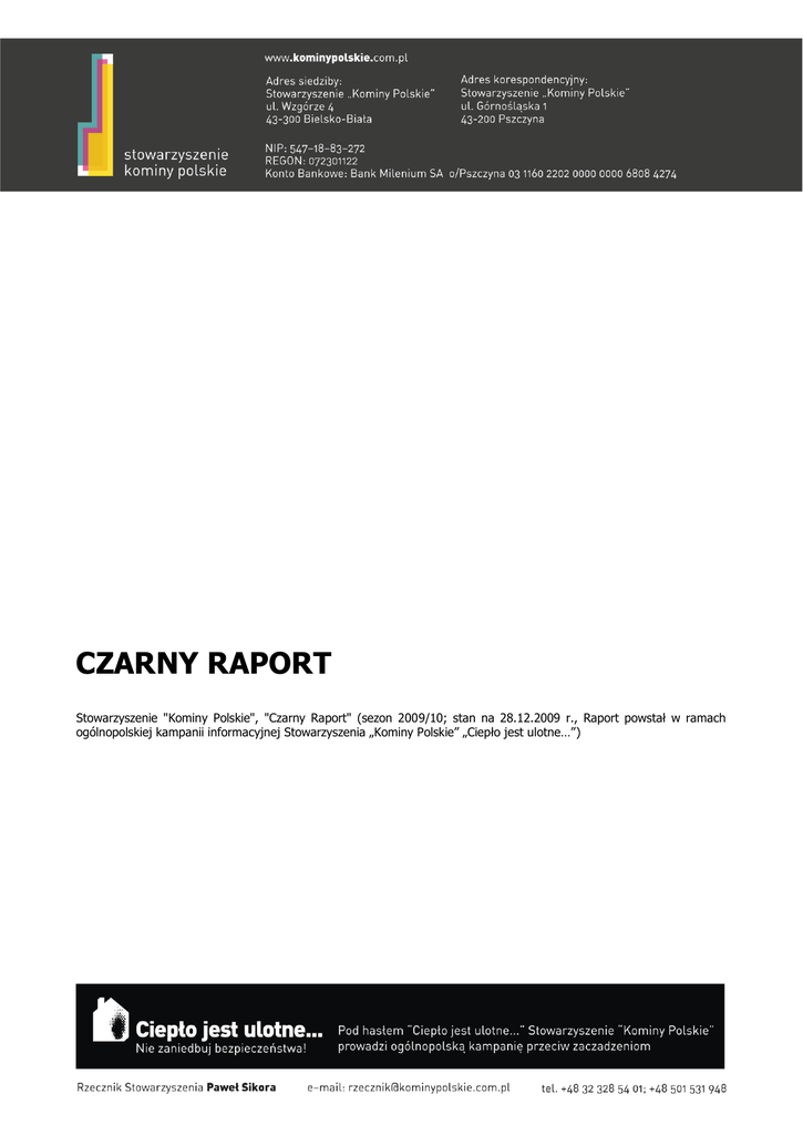 CZARNY RAPORT Stowarzyszenie "Kominy Polskie", "Czarny Raport" (sezon 2009/10; stan na 28.12.2009 r., Raport powstał w ramach ogólnopolskiej kampanii informacyjnej Stowarzyszenia „Kominy Polskie” „Ciepło jest ulotne…”) Stowarzyszenie "Kominy Polskie", "Czarny Raport" (sezon 2009/10; stan na 28.12.2009 r., Raport powstał w ramach ogólnopolskiej kampanii informacyjnej Stowarzyszenia „Kominy Polskie” „Ciepło jest ulotne…”) CZARNY RAPORT Trwa czarna seria zatruć czadem. 8 osób zabitych, 62 hospitalizowanych – to tylko bilans grudniowych wypadków zatrucia tlenkiem węgla (zaczadzenia). Pomimo łagodnego przebiegu zimy od początku sezonu grzewczego do podobnych tragedii dochodzi niemal codziennie. Ich przyczyny są z roku na rok te same: zaniedbanie, niewiedza, ignorancja przepisów, wadliwe instalacje odprowadzania spalin... Zaczadzenia i pożary są skutkiem i efektem występujących nieprawidłowości. Przyczyny powstawania zaczadzeń i pożarów związanych z eksploatacją można podzielić na te związane z: - niesprawną wentylacją (zbytnie uszczelnienie mieszkania, zatkane otwory wentylacyjne, brak wentylacji), - niesprawnymi urządzeniami grzewczymi, - wadliwym podłączeniem lub brakiem podłączeń urządzeń grzewczych do komina, - wadą konstrukcyjną komina lub niepoprawną instalacją (cofnięcia spalin, nadpalenia przewodu), - uszkodzonymi lub niedrożnymi kominami (brak ciągu, niedrożne i popękane kominy) - brak odbioru nowych i modernizowanych kominów oraz wykorzystywanie do ich wykonania niewłaściwych materiałów. *** Wykaz doniesień medialnych dotyczących śmiertelnych i hospitalizowanych przypadków zaczadzeń będących skutkiem nieprawidłowości związanych z użytkowaniem instalacji grzewczych, wentylacyjnych i kominowych (stan na 28.12.2009 r.): Czarna seria zatruć czadem, 28 grudnia 2009 r., "Życie Warszawy" Sześć osób zatruło się czadem, 27 grudnia 2009 r., gazeta.pl 16-latka zmarła z powodu zatrucia tlenkiem węgla, 26 grudnia 2009 r., wiadomosci24.pl 17-latek zatruł się czadem, 26 grudnia 2009 r., nto.pl Sześć osób zatruło się czadem w Warszawie, 26 grudnia 2009 r., "Życie Warszawy" Oddychali czadem zamiast powietrzem, 26 grudnia 2009 r., echodnia.eu Seria zatruć czadem na Lubelszczyźnie, 23 grudnia 2009 r., rmf.fm Trzynastolatka zatruła się czadem, 23 grudnia2009 r., mojradom.pl Zatruła sie czadem we własnej łazience, 22 grudnia 2009 r., "Gazeta Wyborcza" Pięć osób zatruło się czadem, 22 grudnia 2009 r., "Dziennik Wschodni" Z piecem nie ma żartów, 22 grudnia 2009 r., gk24.pl Podtrucie tlenkiem węgla w Kędzierzynie-Koźlu, 21 grudnia 2009 r., nto.pl 20-latka zaczadziła się pod prysznicem, 18 grudnia 2009 r., gk24.pl 18-latka zatruła się tlenkiem węgla, 16 grudnia 2009 r., gazeta.pl Lublin:Siedmiu studentów zatruło się czadem, 16 grudnia 2009 r., "Dziennik Wschodni" Dwie osoby zatruły się czadem, 16 grudnia 2009 r., echodnia.eu Kolejne podtrucia tlenkiem węgla, 15 grudnia 2009 r., Radio Opole Zatrucie tlenkiem węgla na Pradze, 9 grudnia 2009 r., "Życie Warszawy" Trójka dzieci i ich opiekunka zatrute czadem, 7 grudnia 2009 r., nowiny24.pl Zatrucie tlenkiem węgla. Dwie ofiary śmiertelne, 5 grudnia 2009 r., Komenda Wojewódzka Państwowej Straży Pożarnej w Katowicach Podtrucie tlenkiem węgla w Kędzierzynie-Koźlu, 5 grudnia 2009 r., nto.pl Zatruła się czadem, 4 grudnia 2009 r., "Nowiny" Cztery osoby zatruły się tlenkiem węgla, 4 grudnia 2009 r., mmpoznan.pl Dziewczynka zatruła się czadem (video), 2 grudnia 2009 r., agency.tvn.pl Zatrucie czadem na Lwowskiej, 1 grudnia 2009 r., "Życie Warszawy" 11-latka z Rybnika zatruła się czadem, 30 listopada 2009 r., nowiny.pl Trójka dzieci zatruła się czadem, 29 listopada 2009 r., "Super Nowości" Brzeg: dwie osoby podtrute tlenkiem węgla, 28 listopada 2009 r., nto.pl Bełżyce: zatrucie czadem, 21 listopada 2009 r., wiadomosci24.pl Skoczów: zatruli się czadem, 20 listopada 2009 r., czynne24.net Śmiertelne zaczadzenie, 20 listopada 2009 r., "Tygodnik Ostrołęcki" Podtrucie czadem, 20 listopada 2009 r., ox.pl Pięciolatek i jego matka zatruli się czadem, 19 listopada 2009 r., gk24.pl Aż trzy osoby zatruły się tlenkiem węgla, 12 listopada 2009 r., "Gazeta Pomorska" Sześć osób zatrutych czadem, 10 listopada 2009 r., rmf.fm Mieszkanka Częstochowy zatruła się tlenkiem węgla, 10 listopada 2009 r., "Dziennik Zachodni" Cztery osoby zatruły się czadem, 8 listopada 2009 r., "Gazeta Wyborcza" Rodzina zatruta groźnym czadem, 4 listopada2009 r., se.pl Czad znów omal nie zabił..., 3 listopada 2009 r., "Dziennik Zachodni" Śmiertelne zatrucie czadem na Podkarpaciu, 31 października 2009 r., "Radio Rzeszów" Tragiczna kamienica, 29 października 2009 r., rc.fm Dwie osoby zatrute czadem, 29 października 2009 r., radio90.fm Śmiertelne zatrucie tlenkiem węgla, 28 października 2009 r., echokalisza.pl Zaczadzenie w Kwidzynie: o krok od tragedii, 28 października 2009 r., polskalokalna.pl Zatruł się tlenkiem węgla, 22 października 2009 r., Komenda Główna Państwowej Straży Pożarnej Cztery osoby zatrute tlenkiem węgla, 21 października 2009 r., "Dziennik Zachodni" Rzeszów: Z ostatniej chwili: Dwie osoby podtrute czadem w Rzeszowie, 21 października 2009 r., nowiny24.pl Zatrucie tlenkiem węgla w Strzyżowie, 20 października 2009 r., nowiny24.pl Dwie Ukrainki nie żyją, 18 października 2009 r., gazeta.pl Zatruł się czadem przy Belwederskiej, 18 października 2009 r., "Życie Warszawy" Matka i dziecko zatruli się czadem, 17 października 2009 r., olsztyn.wm.pl Biskupice: Zatrucie czadem, 16 października 2009 r., "Polska Dziennik Zachodni" Cztery osoby zatruły się tlenkiem węgla w Olsztynie, 15 października 2009 r., gazeta.pl Cała rodzina zatruła się tlenkiem węgla, 8 października 2009 r., echodnia.pl Tragedia na Osiedlu Wyzwolenia, 7 października 2009 r., Komenda Miejska Policji w Piotrkowie Trybuna