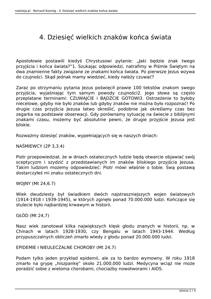 nadzieja.pl - Bernard Koziróg - 4. Dziesięć wielkich znaków końca świata 4. Dziesięć wielkich znaków końca świata Apostołowie postawili kiedyś Chrystusowi pytanie: „Jaki będzie znak twego przyjścia i końca świata?”1. Szukając odpowiedzi, natrafimy w Piśmie Świętym na dwa znamienne fakty związane ze znakami końca świata. Po pierwsze Jezus wzywa do czujności. Skąd jednak mamy wiedzieć, kiedy należy czuwać? Zaraz po otrzymaniu pytania Jezus poświęcił prawie 100 tekstów znakom swego przyjścia, wyjaśniając tym samym powody czujności2. Jego słowa są często przeplatane terminami: CZUWAJCIE i BĄDŹCIE GOTOWI3. Ostrzeżenie to byłoby niecelowe, gdyby nie było znaków lub gdyby znaków nie można było rozpoznać! Po drugie czas przyjścia Jezusa łatwo określić, podobnie jak określamy czas bez zegarka na podstawie obserwacji. Gdy porównamy sytuację na świecie z biblijnymi znakami czasu, możemy być absolutnie pewni, że drugie przyjście Jezusa jest bliskie. Rozważmy dziesięć znaków, wypełniających się w naszych dniach: NAŚMIEWCY (2P 3,3.4) Piotr przepowiedział, że w dniach ostatecznych ludzie będą otwarcie objawiać swój sceptycyzm i szydzić z przedstawianych im znaków bliskiego przyjścia Jezusa. Takim ludziom możemy odpowiedzieć: Piotr mówi właśnie o tobie. Swą postawą dostarczyłeś mi znaku ostatecznych dni. WOJNY (Mt 24,6.7) Wiek dwudziesty był świadkiem dwóch najstraszniejszych wojen światowych (1914-1918 i 1939-1945), w których zginęło ponad 70.000.000 ludzi. Kończące się stulecie było najbardziej krwawym w historii. GŁÓD (Mt 24,7) Nasz wiek zanotował kilka największych klęsk głodu znanych w historii, np. w Chinach w latach 1928-1930, czy Bengalu w latach 1943-1944. Według przypuszczalnych obliczeń zmarło wtedy z głodu ponad 20.000.000 ludzi. EPIDEMIE I NIEULECZALNE CHOROBY (Mt 24,7) Podam tylko jeden przykład epidemii, ale za to bardzo wymowny. W roku 1918 zmarło na grypę „hiszpankę” około 21.000.000 ludzi. Medycyna wciąż nie może poradzić sobie z wieloma chorobami, chociażby nowotworami i AIDS. strona 1 / 3 nadzieja.pl - Bernard Koziróg - 4. Dziesięć wielkich znaków końca świata TRZĘSIENIA ZIEMI (Mt 24,7) Wiek XX był świadkiem dwóch największych trzęsień ziemi w historii świata: w Chinach w roku 1920 zginęło 180.000 osób; w Japonii w roku 1923 — 1.500.000, a 200.000 osób uznano za zaginione. Trzęsienie ziemi w Japonii uważane jest przez wielu za największą katastrofę po potopie. WIEDZA I UMIEJĘTNOŚĆ (Dn 12,4) Jesteśmy świadkami wielkiej eksplozji wynalazczości. Człowiek dokonał w ostatnim wieku większego postępu w dziedzinie wiedzy niż we wszystkich wiekach razem wziętych (technika, medycyna, transport, łączność i inne). TECHNIKA (Dn 12,4) W wieku XX człowiek przekroczył kilkakrotnie barierę szybkości. Samoloty ponaddźwiękowe, rakiety i satelity latają jak „błyskawice”. Największy postęp jednak zanotowano w komputeryzacji. Tempo w tej dziedzinie jest tak ogromne, że to, co wczoraj było hitem, dzisiaj odstawiamy na bok, a jutro trzeba będzie wyrzucić albo odstawić do muzeum. NIEBEZPIECZNE DNI (2Tm 3,1-3) Mimo posiadania najdoskonalszych środków i przy stosowaniu najlepszych metod zwalczania przestępczości, bezprawie, rabunek, gwałt i wszelkiego rodzaju zło alarmująco wzrasta. Organa sprawiedliwości potrafią niekiedy ukrócić zło (założyć kajdanki), lecz nie potrafią uleczyć. STRACH (Łk 21,25.26) Mimo ogromnego postępu technicznego nie udało się zlikwidować czynników powodujących strach. Strach przed przestępczością, bezrobociem, samotnością czy głodem pojawia się wszędzie tam, gdzie żyją ludzie. DNI NOEGO (Mt 24,37-39) Za dni Noego całą cywilizację ogarnęła skandaliczna niemoralność. Tak jak i dzisiaj. Najsmutniejszy jest fakt, że nigdy przedtem nie było tak szeroko rozwiniętej oświaty i znajomości prawa jak obecnie, co jednak nie przeszkadza ludzkości brnąć w najgorszym bagnie niemoralności. Gdy omawiamy listę tych wszystkich znaków, niektórzy protestują: „Przestępczość, wojny, trzęsienia ziemi i inne przytoczone znaki zdarzały się często i były uznawane w przeszłości jako dowody bliskiego przyjścia Chrystusa, przez co ludzie doznawali rozczarowań. Tamci wyjaśniali i stosowali znaki niewłaściwie. Czy my dzisiaj nie popełniamy tych samych błędów?”. Ludzie podnoszący taki zarzut strona 2 / 3 nadzieja.pl - Bernard Koziróg - 4. Dziesięć wielkich znaków końca świata zapominają o ogromnej różnicy, jaka zaistniała w naszym wieku w stosunku do wieków poprzednich. Sprawa jest bardzo prosta. Dziś po raz pierwszy od czasu zmartwychwstania i wniebowstąpienia Jezusa wszystkie przepowiedziane ważniejsze znaki wypełniają się równocześnie! W przeszłości niektóre z przepowiedzianych znaków pojawiły się sporadycznie, lecz nigdy nie pojawiały się równocześnie, tak jak ma to miejsce obecnie! Jezus nigdy nie kazał wierzyć w bliskość swego powtórnego przyjścia na podstawie jednego zauważonego znaku. Gdy jednak pojawią się na niebie i na ziemi wszystkie znaki jednocześnie, to ich spotęgowana moc przekonywująca będzie bezbłędnym znakiem bliskości Dnia Pańskiego. Będą one takim świadectwem mocy, jak gdyby Bóg głosem grzmotu ogłaszał ten nadchodzący dzień lub pisał wielkimi literami na nieboskłonie. Przypisy: 1 Mt 24,3. 2 Mt 24 i 25. 3 Mt 24,42-44; 25,13. strona 3 / 3 Powered by TCPDF (www.tcpdf.org)
