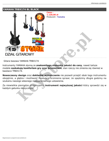 Informacje o produkcie YAMAHA TRBX174 BL BLACK Cena : 1.120,00 zł Gitara basowa YAMAHA TRBX174 or e. pl Producent : Yamaha St Instrumenty YAMAHA słynną ze znakomitego stosunku jakości do ceny, nawet tańsze modele zaskakują komfortem gry oraz brzmieniem, stan rzeczy nie zmienia się również w basówce TRBX174. ey Nowoczesny design oraz dokładne wykończenie nie pozwoli przejść obok tego instrumentu obojętnie, a głębia i możliwość modulacji brzmienia sprawi, że spędzimy długie godziny na szukaniu naszego własnego niepowtarzalnego ustawienia. K Za niewielkie pieniądze otrzymujemy instrument najwyższej jakości który sprawdzi się w każdym gatunku muzycznym. Wygenerowano w programie www.oscGold.com or e. pl St ey K K ey St or e. pl Informacje o produkcie Wygenerowano w programie www.oscGold.com Specyfikacja: ● ● ● ● ● or e. pl ● St ● ey ● Gryf - klon Mocowanie gryfu - przykręcany Podstrunnica - palisander Liczba progów - 24 Menzura - 34" Przetworniki - single-coil/single-coil (s/s) Rodzaj elektroniki - pasywna Ilość strun - 4 Wykończenie wysoki połysk K ●