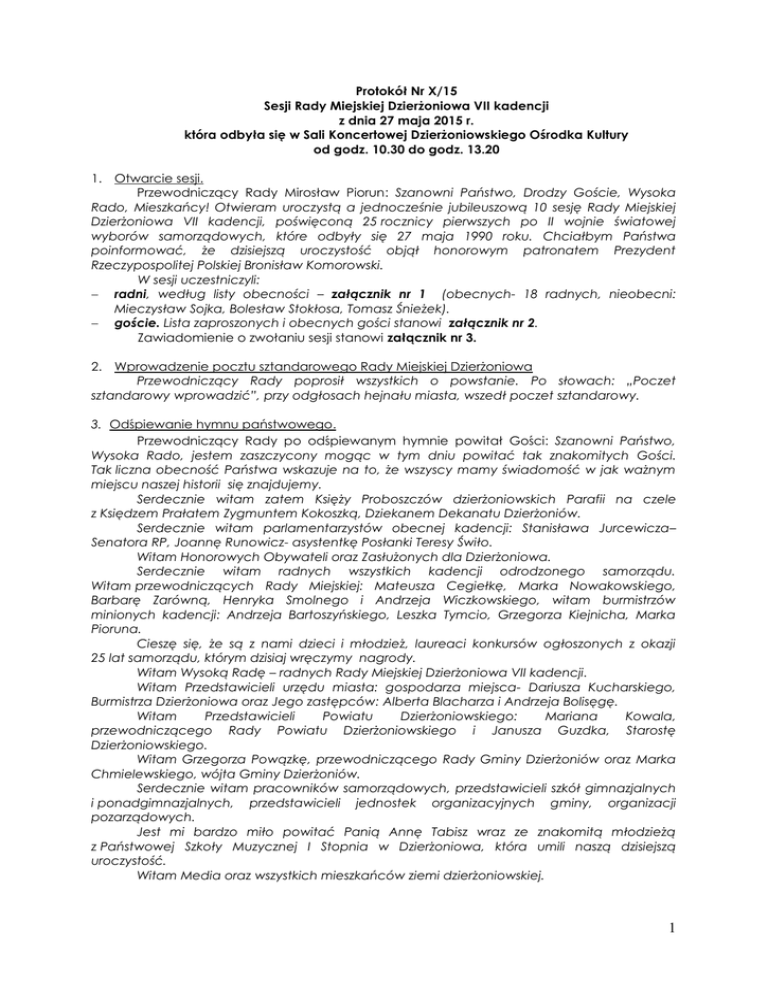 Protokół Nr X/15 Sesji Rady Miejskiej Dzierżoniowa VII kadencji z dnia 27 maja 2015 r. która odbyła się w Sali Koncertowej Dzierżoniowskiego Ośrodka Kultury od godz. 10.30 do godz. 13.20 1. Otwarcie sesji. Przewodniczący Rady Mirosław Piorun: Szanowni Państwo, Drodzy Goście, Wysoka Rado, Mieszkańcy! Otwieram uroczystą a jednocześnie jubileuszową 10 sesję Rady Miejskiej Dzierżoniowa VII kadencji, poświęconą 25 rocznicy pierwszych po II wojnie światowej wyborów samorządowych, które odbyły się 27 maja 1990 roku. Chciałbym Państwa poinformować, że dzisiejszą uroczystość objął honorowym patronatem Prezydent Rzeczypospolitej Polskiej Bronisław Komorowski. W sesji uczestniczyli: radni, według listy obecności – załącznik nr 1 (obecnych- 18 radnych, nieobecni: Mieczysław Sojka, Bolesław Stokłosa, Tomasz Śnieżek). goście. Lista zaproszonych i obecnych gości stanowi załącznik nr 2. Zawiadomienie o zwołaniu sesji stanowi załącznik nr 3. 2. Wprowadzenie pocztu sztandarowego Rady Miejskiej Dzierżoniowa Przewodniczący Rady poprosił wszystkich o powstanie. Po słowach: „Poczet sztandarowy wprowadzić”, przy odgłosach hejnału miasta, wszedł poczet sztandarowy. 3. Odśpiewanie hymnu państwowego. Przewodniczący Rady po odśpiewanym hymnie powitał Gości: Szanowni Państwo, Wysoka Rado, jestem zaszczycony mogąc w tym dniu powitać tak znakomitych Gości. Tak liczna obecność Państwa wskazuje na to, że wszyscy mamy świadomość w jak ważnym miejscu naszej historii się znajdujemy. Serdecznie witam zatem Księży Proboszczów dzierżoniowskich Parafii na czele z Księdzem Prałatem Zygmuntem Kokoszką, Dziekanem Dekanatu Dzierżoniów. Serdecznie witam parlamentarzystów obecnej kadencji: Stanisława Jurcewicza– Senatora RP, Joannę Runowicz- asystentkę Posłanki Teresy Świło. Witam Honorowych Obywateli oraz Zasłużonych dla Dzierżoniowa. Serdecznie witam radnych wszystkich kadencji odrodzonego samorządu. Witam przewodniczących Rady Miejskiej: Mateusza Cegiełkę, Marka Nowakowskiego, Barbarę Zarówną, Henryka Smolnego i Andrzeja Wiczkowskiego, witam burmistrzów minionych kadencji: Andrzeja Bartoszyńskiego, Leszka Tymcio, Grzegorza Kiejnicha, Marka Pioruna. Cieszę się, że są z nami dzieci i młodzież, laureaci konkursów ogłoszonych z okazji 25 lat samorządu, którym dzisiaj wręczymy nagrody. Witam Wysoką Radę – radnych Rady Miejskiej Dzierżoniowa VII kadencji. Witam Przedstawicieli urzędu miasta: gospodarza miejsca- Dariusza Kucharskiego, Burmistrza Dzierżoniowa oraz Jego zastępców: Alberta Blacharza i Andrzeja Bolisęgę. Witam Przedstawicieli Powiatu Dzierżoniowskiego: Mariana Kowala, przewodniczącego Rady Powiatu Dzierżoniowskiego i Janusza Guzdka, Starostę Dzierżoniowskiego. Witam Grzegorza Powązkę, przewodniczącego Rady Gminy Dzierżoniów oraz Marka Chmielewskiego, wójta Gminy Dzierżoniów. Serdecznie witam pracowników samorządowych, przedstawicieli szkół gimnazjalnych i ponadgimnazjalnych, przedstawicieli jednostek organizacyjnych gminy, organizacji pozarządowych. Jest mi bardzo miło powitać Panią Annę Tabisz wraz ze znakomitą młodzieżą z Państwowej Szkoły Muzycznej I Stopnia w Dzierżoniowa, która umili naszą dzisiejszą uroczystość. Witam Media oraz wszystkich mieszkańców ziemi dzierżoniowskiej. 1 4. Występ artystyczny w wykonaniu uczniów Państwowej Szkoły Muzycznej I stopnia w Dzierżoniowie. Przewodniczący Rady Mirosław Piorun zaprasił młodzież Państwowej Szkoły Muzycznej I stopnia w Dzierżoniowie do przedstawienia specjalnie przygotowanego programu na dzisiejszą okazję. Wystąpił chór oraz soliści (flet boczny i wiolonczela), przedstawiający utwory muzyczne. Po zakończeniu programu przewodniczący obrad podziękował młodzieży na występ. 5. Słowo wstępne Mirosława Pioruna, przewodniczącego Rady Miejskiej Dzierżoniowa. Przewodniczący Rady Mirosław Piorun wygłosił słowo wstępne: Wysoka Rado, Dostojne Duchowieństwo, Panie Senatorze, Posłanki, Panie Burmistrzu, Szanowni Goście, Panie i Panowie Samorządowcy! Zacznę nietypowo: 4 czerwca 1989 roku skończył się w Polsce komunizm”– te słowa wypowiedziane przez Joannę Szczepkowską stały się symbolem zmian, jakie nastąpiły w Polsce po wyborach parlamentarnych w czerwcu 1989 roku. Parafrazując tamto zdanie, my możemy powiedzieć, że dla samorządu komunizm skończył się 8 marca 1990 roku, kiedy Sejm kontraktowy uchwalił ustawę o samorządzie terytorialnym, konsekwencją czego były pierwsze demokratyczne wybory do rad gmin, przeprowadzone 27 maja 1990 roku. Ten dzień to nasz symbol. Symbol o wielkim znaczeniu, bo reforma samorządowa była najważniejszą ustrojową i polityczną reformą w wolnej Polsce, a jednocześnie, nie waham się użyć tego słowanajbardziej udaną. Szanowni Państwo, celem dzisiejszej uroczystości jest przede wszystkim przypomnienie naszej historii, przypomnienie ludzi wprowadzających naszą samorządność, przypomnienie tych, którzy tworzyli samorząd terytorialny także tu w Dzierżoniowie. Powinniśmy bowiem pamiętać, że początki samorządu to najbardziej ideowy okres chyba w każdej gminie w Polsce. Pozwólcie Państwo, że przypomnę w pierwszej kolejności tych samorządowców, których nie ma już wśród nas [w czasie wymieniania nazwisk na ekranie wyświetlano zdjęcia nw. osób]: 1) prof. Jerzy Regulski (1924 – 2015)- polski ekonomista, współtwórca reformy samorządowej z 1990 roku, doradca społeczny Prezydenta RP ds. samorządu, ekspert z zakresu samorządu terytorialnego, senator I kadencji, Kawaler Orderu Orła Białego, 2) prof. Michał Kulesza (1948 – 2013)- prawnik, specjalista z zakresu administracji, współtwórca reformy samorządowej z 1990 roku, doradca prezydenta ds. samorządu, 3) Elżbieta Krak – Choromańska- radna II kadencji Rady Miejskiej Dzierżoniowa, pracowała w komisji Zdrowia i Opieki Spo