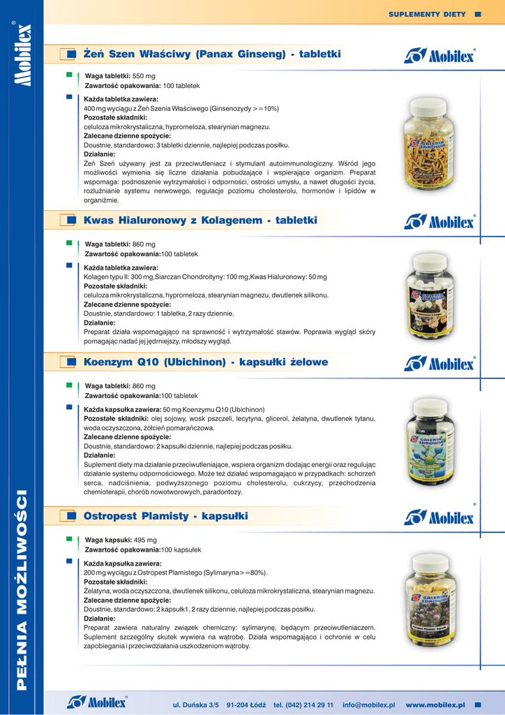 SUPLEMENTY DIETY Żeń Szen Właściwy (Panax Ginseng) - tabletki Waga tabletki: 550 mg Zawartość opakowania: 100 tabletek Każda tabletka zawiera: 400 mg wyciągu z Żeń Szenia Właściwego (Ginsenozydy >=10%) Pozostałe składniki: celuloza mikrokrystaliczna, hypromeloza, stearynian magnezu. Zalecane dzienne spożycie: Doustnie, standardowo: 3 tabletki dziennie, najlepiej podczas posiłku. Działanie: Żeń Szeń używany jest za przeciwutleniacz i stymulant autoimmunologiczny. Wśród jego możliwości wymienia się liczne działania pobudzające i wspierające organizm. Preparat wspomaga: podnoszenie wytrzymałości i odporności, ostrości umysłu, a nawet długości życia, rozluźnianie systemu nerwowego, regulacje poziomu cholesterolu, hormonów i lipidów w organiźmie. Kwas Hialuronowy z Kolagenem - tabletki Waga tabletki: 860 mg Zawartość opakowania:100 tabletek Każda tabletka zawiera: Kolagen typu II: 300 mg,Siarczan Chondroityny: 100 mg,Kwas Hialuronowy: 50 mg Pozostałe składniki: celuloza mikrokrystaliczna, hypromeloza, stearynian magnezu, dwutlenek silikonu. Zalecane dzienne spożycie: Doustnie, standardowo: 1 tabletka, 2 razy dziennie. Działanie: Preparat działa wspomagająco na sprawność i wytrzymałość stawów. Poprawia wygląd skóry pomagając nadać jej jędrniejszy, młodszy wygląd. Koenzym Q10 (Ubichinon) - kapsułki żelowe PEŁNIA MOŻLIWOŚCI Waga tabletki: 860 mg Zawartość opakowania:100 tabletek Każda kapsułka zawiera: 50 mg Koenzymu Q10 (Ubichinon) Pozostałe składniki: olej sojowy, wosk pszczeli, lecytyna, glicerol, żelatyna, dwutlenek tytanu, woda oczyszczona, żółcień pomarańczowa. Zalecane dzienne spożycie: Doustnie, standardowo: 2 kapsułki dziennie, najlepiej podczas posiłku. Działanie: Suplement diety ma działanie przeciwutleniające, wspiera organizm dodając energii oraz regulując działanie systemu odpornościowego. Może też działać wspomagająco w przypadkach: schorzeń serca, nadciśnienia, podwyższonego poziomu cholesterolu, cukrzycy, przechodzenia chemioterapii, chorób nowotworowych, paradontozy. Ostropest Plamisty - kapsułki Waga kapsuki: 495 mg Zawartość opakowania:100 kapsułek Każda kapsułka zawiera: 200 mg wyciągu z Ostropest Plamistego (Sylimaryna>=80%). Pozostałe składniki: Żelatyna, woda oczyszczona, dwutlenek silikonu, celuloza mikrokrystaliczna, stearynian magnezu. Zalecane dzienne spożycie: Doustnie, standardowo: 2 kapsułk1, 2 razy dziennie, najlepiej podczas posiłku. Działanie: Preparat zawiera naturalny związek chemiczny: sylimarynę, będącym przeciwutleniaczem. Suplement szczególny skutek wywiera na wątrobę. Działa wspomagająco i ochronie w celu zapobiegania i przeciwdziałania uszkodzeniom wątroby. ul. Duńska 3/5 91-204 Łódź tel. (042) 214 29 11 [email protected] www.mobilex.pl
