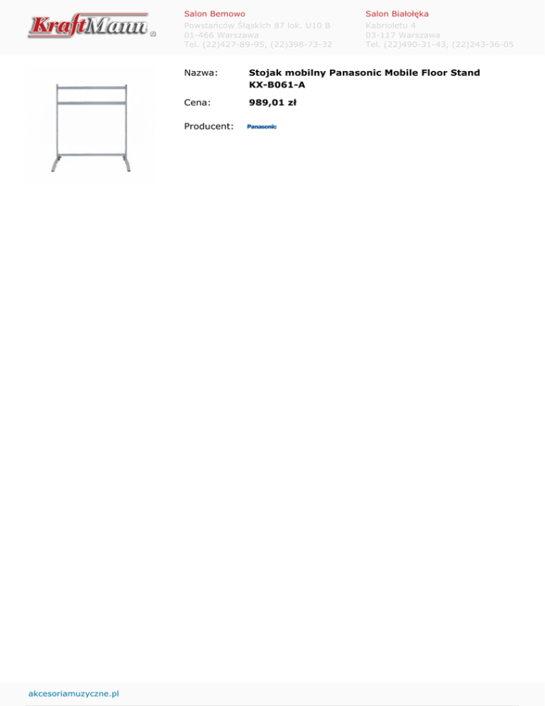 Salon Bemowo Salon Białołęka Powstańców Śląskich 87 lok. U10 B 01-466 Warszawa Tel. (22)427-89-95, (22)398-73-32 Kabrioletu 4 03-117 Warszawa Tel. (22)490-31-43, (22)243-36-05 Nazwa: Stojak mobilny Panasonic Mobile Floor Stand KX-B061-A Cena: 989,01 zł Producent: akcesoriamuzyczne.pl