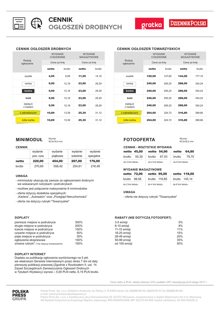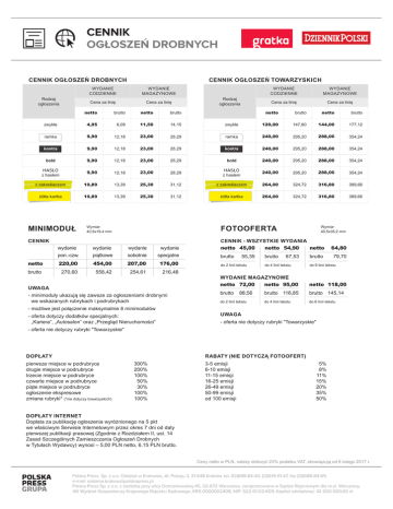 CENNIK OGŁOSZEŃ DROBNYCH CENNIK OGŁOSZEŃ DROBNYCH Rodzaj ogłoszenia CENNIK OGŁOSZEŃ TOWARZYSKICH WYDANIE CODZIENNE WYDANIE MAGAZYNOWE Cena za linię Cena za linię netto brutto netto brutto zwykłe 4,95 6,09 11,50 14,15 ramka 9,90 12,18 23,00 kontra 9,90 12,18 bold 9,90 HASŁO z hasłem Rodzaj ogłoszenia WYDANIE CODZIENNE WYDANIE MAGAZYNOWE Cena za linię Cena za linię netto brutto netto brutto zwykłe 120,00 147,60 144,00 177,12 28,29 ramka 240,00 295,20 288,00 354,24 23,00 28,29 kontra 240,00 295,20 288,00 354,24 12,18 23,00 28,29 bold 240,00 295,20 288,00 354,24 9,90 12,18 23,00 28,29 HASŁO z hasłem 240,00 295,20 288,00 354,24 z zakreślaczem 10,89 13,39 25,30 31,12 z zakreślaczem 264,00 324,72 316,80 389,66 żółta kartka 10,89 13,39 25,30 31,12 żółta kartka 264,00 324,72 316,80 389,66 MINIMODUŁ CENNIK wydanie pon.-czw. FOTOOFERTA Wymiar 40,5x19,4 mm wydanie piątkowe wydanie sobotnie wydanie specjalne netto220,00454,00207,00176,00 brutto 270,60558,42254,61216,48 UWAGA -m inimoduły ukazują się zawsze za ogłoszeniami drobnymi we wskazanych rubrykach i podrubrykach -m ożliwe jest połączenie maksymalnie 8 minimodułów -o ferta dotyczy dodatków specjalnych: „Kariera”, „Autosalon” oraz „Przegląd Nieruchomości” Wymiar 40,5x35,2 mm CENNIK - WSZYSTKIE WYDANIA netto45,00 netto54,90 netto 64,80 brutto55,35 brutto67,53 brutto 79,70 do 2 linii tekstu do 4 linii tekstu do 6 linii tekstu WYDANIE MAGAZYNOWE netto 72,00 netto95,00 netto118,00 brutto 88,56 brutto116,85 brutto145,14 do 2 linii tekstu do 4 linii tekstu do 6 linii tekstu UWAGA - oferta nie dotyczy rubryki "Towarzyskie" - oferta nie dotyczy rubryki "Towarzyskie" DOPŁATY RABATY (NIE DOTYCZĄ FOTOOFERT) pierwsze miejsce w podrubryce drugie miejsce w podrubryce trzecie miejsce w podrubryce czwarte miejsce w podrubryce piąte miejsce w podrubryce ogłoszenie ekspresowe zmiana rubryki* (*nie dotyczy towarzyskich) 300% 200% 100% 50% 30% 100% 100% 3-5 emisji 6-10 emisji 11-15 emisji 16-25 emisji 26-49 emisji 50-99 emisji od 100 emisji 5% 8% 11% 15% 20% 35% 50% DOPŁATY INTERNET Dopłata za publikację ogłoszenia wyróżnionego na 5 pkt we właściwym Serwisie Internetowym przez okres 7 dni od daty pierwszej publikacji prasowej (Zgodnie z Rozdziałem II, ust. 14 Zasad Szczególnych Zamieszczania Ogłoszeń Drobnych w Tytułach Wydawcy) wynosi – 5,00 PLN netto, 6,15 PLN brutto. Ceny netto w PLN, należy doliczyć 23% podatku VAT, obowiązują od 6 lutego 2017 r. Polska Press Sp. z o.o. Oddział w Krakowie, Al. Pokoju 3, 31-548 Kraków, tel. (12)688-84-40, (12)619-91-47, fax (12)688-84-69, e-mail: [email protected] Polska Press Sp. z o.o. z siedzibą przy ulicy Domaniewskiej 45, 02-672 Warszawa, zarejestrowana w Sądzie Rejonowym dla m.st. Warszawy, XIII Wydział Gospodarczy Krajowego Rejestru Sądowego, KRS 0000002408, NIP: 522-01-03-609, Kapitał zakładowy: 42 000 000,00 zł.