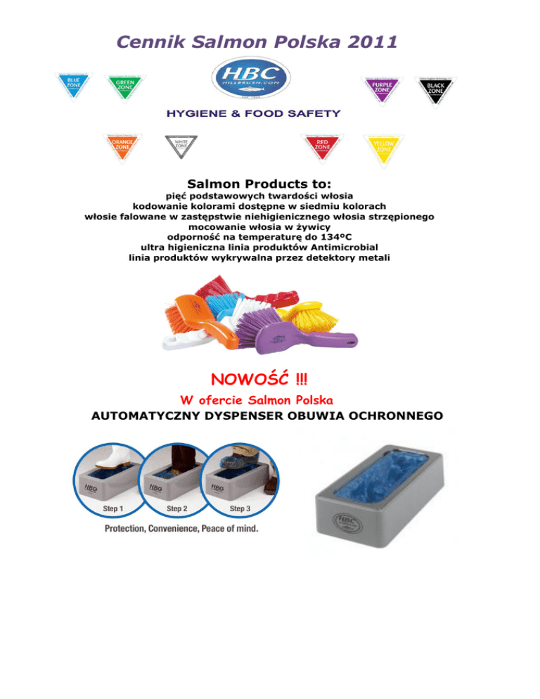 Cennik Salmon Polska 2011 Salmon Products to: pięć podstawowych twardości włosia kodowanie kolorami dostępne w siedmiu kolorach włosie falowane w zastępstwie niehigienicznego włosia strzępionego mocowanie włosia w żywicy odporność na temperaturę do 134ºC ultra higieniczna linia produktów Antimicrobial linia produktów wykrywalna przez detektory metali NOWOŚĆ !!! W ofercie Salmon Polska AUTOMATYCZNY DYSPENSER OBUWIA OCHRONNEGO ULTIMATE HYGIENE LINIA ANTI – MICROBIAL Super higieniczna linia produktów, zawiera w swojej strukturze drobne cząstki srebra – efekt antybakteryjny, włosie tylko mocowane w żywicy. Lp. Indeks 1 AMNA4 2 AMD4 3 AMST5 4 AMB861 NOWOŚĆ! 5 AMD77PR NOWOŚĆ! 6 AMB928 7 8 9 Nazwa / Przeznaczenie SZCZOTECZKA RĘCZNA 120mm Mała szczotka z twardym włosiem idealnie nadająca się do czyszczenia rąk i paznokci. Szczotka zapobiega rozmnażaniu się bakterii. Ilustracja Produktu Ilość szt. Strona w w opak. kat. Cena netto w pln. 12 26,40 SZCZOTKA Z RĄCZKĄ Szczotka ręczna z twardym włosiem. Odpowiednia do usuwania odpornego brudu z gładkich maszyn i stołów oraz czyszczenia wiader. 6 47,70 SZCZOTKA RĘCZNA 209cm Profesjonalna szczotka ręczna z twardym włosiem do wielu rożnych zadań czyszczących. 6 42,00 ZMIOTKA RĘCZNA 317mm Zmiotka z miękkim, bardzo gęstym falowanym włosiem, które zatrzymuje na dłużej preparat myjący Idealnie nadaje się do wymiatania bardzo drobnych cząstek. 6 32,50 SZCZOTKA Z PRZEPŁYWEM DO CYSTERN I ZBIORNIKÓW Szczotka ze średnio twardym włosiem oraz przepływem wody specjalnie zaprojektowana do czyszczenia cystern i zbiorników . SZCZOTKA NA STYL 230mm Szczotka podłogowa z bardzo twardym włosiem . Szczotka jest idealna do szorowania bardzo zabrudzonych powierzchni a rozmiar szczotki pozwala na czyszczenie trudno dostępnych miejsc. 90,00 12 65,40 4 AMB770 SZCZOTKA NA STYL 300mm Szczotka na styl do szorowania z twardym włosiem. Idealna do szorowania trudnych zabrudzeń. 4 101,75 AMB849 SZCZOTKA NA STYL 300mm Szczotka na styl z miękkim falowanym włosiem. Idealna do zamiatania oraz mycia ścian . 4 102,50 AMB758 SZCZOTKA NA STYL 300mm Szczotka na styl ze średnio twardym, falowanym włosiem do zamiatania głównie suchych powierzchni. Włókna szczotki są osadzone i zabezpieczone w żywicy. Szczotka zawiera drobinki srebra co zapobiega powstawaniu bakterii. 4 99,00 10 11 12 13 14 15 AMB809 SZCZOTKA NA STYL 457mm Szczotka na styl podłogowa ze średnio twardym falowanym włosiem do mycia i zamiatania dużych powierzchni. Włókna szczotki są osadzone i zabezpieczone w żywicy. Szczotka zawiera drobinki srebra co zapobiega powstawaniu bakterii 4 145,50 AMB896 SZCZOTKA NA STYL 457mm Szczotka na styl podłogowa z miękkim falowanym włosiem do zamiatania oraz mycia dużych powierzchni. Włókna szczotki są osadzone i zabezpieczone w żywicy. Szczotka zawiera drobinki srebra co zapobiega powstawaniu bakterii. 4 145,50 AMPLH3 STYL 1400mm Styl z tworzywa sztucznego – polipropylenu. Posiada wygodny uchwyt i zaokrągloną końcówkę przeznaczoną do zawieszania. Zawiera drobinki srebra co zapobiega powstawaniu bakterii. 10 66,70 AMPSC1 SKROBACZKA RĘCZNA Skrobaczka ręczna do usuwania odpornego brudu ze stołów np w kuchniach i piekarniach. Ponadto może być używana do usuwania przypalonych potraw oraz czyszczenia przenośników taśmowych. Dodatkowo drobinki srebra, które zawiera skrobaczka zmniejszają rozmnażanie się bakterii. 10 15,00 AMPSC2 SKROBACZKA RĘCZNA Skrobaczka ręczna do usuwania odpornego brudu ze stołów np w kuchniach i piekarniach. Ponadto może być używana do usuwania przypalonych potraw czyszczenia przenośników taśmowych. Dodatkowo drobinki srebra które zawiera skrobaczka zmniejszają rozmnażanie się bakterii. 10 17,00 5 27,45 AMSCOOP2 CZERPAK RĘCZNY Dobry, solidny ręczny czerpak z ostrą krawędzią. Uniwersalny, o wszechstronnym zastosowaniu może służyć do nabierania różnego rodzaju przetworów. Zawiera drobinki srebra co zapobiega powstawaniu bakterii 16 17 18 AMSCOOP4 CZERPAK RĘCZNY Dobry, solidny ręczny czerpak z ostrą krawędzią. Uniwersalny, o wszechstronnym zastosowaniu może służyć do nabierania różnego rodzaju większych przetworów, owoców, warzyw itp. Zawiera drobinki srebra co zapobiega powstawaniu bakterii. 5 40,80 AMDP3 SZUFELKA Dzięki temu, że jest to szufelka zamknięta, doskonale zbiera nawet większą ilość śmieci, dokładnie przylega do zamiatanej powierzchni i znakomicie wygląda. Zawiera drobinki srebra co zapobiega powstawaniu bakterii. 6 25,50 AMPLSB60 ZBIERAK NA STYL 600mm Zbierak na styl, nadaje się do zgarniania dużych ilości brudu/śmieci z powierzchni gładkich i mokrych. Zawiera drobinki srebra co zapobiega powstawaniu bakterii. 6 88,46 LINIA PRODUKTÓW WYKRYWALNYCH PRZEZ DETEKTORY METALI 19 20 21 22 23 PSC1MD PSC2MD SCOOP2MD SCOOP4MD PSH13MD SKROBACZKA Skrobaczka ręczna wykonana z tworzywa sztucznego z domieszką cząstek metali żelaznych i nieżelaznych,przeznaczona do usuwania opornego brudu z różnych powierzchni. - wymiary:205 x 76 10 8,80 SKROBACZKA Skrobaczka ręczna wykonana z tworzywa sztucznego z domieszką cząstek metali żelaznych i nieżelaznych,przeznaczona do usuwania opornego brudu z różnych powierzchni. - wymiary:250 x 110 10 12,80 CZERPAK Czerpak ręczny wykonany z tworzywa sztucznego z domieszką cząstek metali żelaznych i nieżelaznych o ostrych krawędziach. Idealny do nabierania różnego rodzaju produktów, uniwersalny, wymiary: 240x60x110x145 5 15,20 CZERPAK Czerpak ręczny wykonany z tworzywa sztucznego z domieszką cząstek metali żelaznych i nieżelaznych o ostrych krawędziach. Idealny do nabierania różnego rodzaju produktów, uniwersalny, wymiary: 380x90x170x260 5 29,80 SZUFLA 120x32x26mm Szufla wykonana z tworzywa sztucznego z domieszką cząstek metali żelaznych i nieżelaznych z uchwytem,długa rękojeść, Użyteczna przy przeładunku produktów i surowców spożywczych. 2