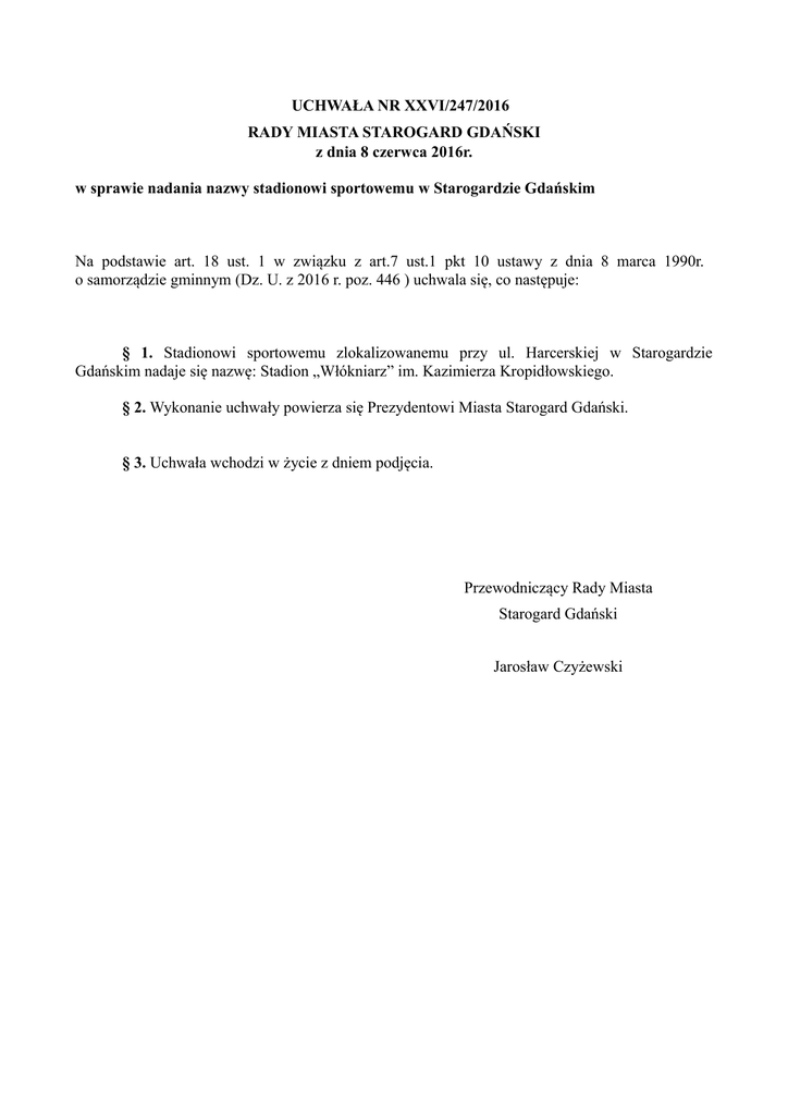 UCHWAŁA NR XXVI/247/2016 RADY MIASTA STAROGARD GDAŃSKI z dnia 8 czerwca 2016r. w sprawie nadania nazwy stadionowi sportowemu w Starogardzie Gdańskim Na podstawie art. 18 ust. 1 w związku z art.7 ust.1 pkt 10 ustawy z dnia 8 marca 1990r. o samorządzie gminnym (Dz. U. z 2016 r. poz. 446 ) uchwala się, co następuje: § 1. Stadionowi sportowemu zlokalizowanemu przy ul. Harcerskiej w Starogardzie Gdańskim nadaje się nazwę: Stadion „Włókniarz” im. Kazimierza Kropidłowskiego. § 2. Wykonanie uchwały powierza się Prezydentowi Miasta Starogard Gdański. § 3. Uchwała wchodzi w życie z dniem podjęcia. Przewodniczący Rady Miasta Starogard Gdański Jarosław Czyżewski Uzasadnienie Z wnioskiem o nadanie imienia Kazimierza Kropidłowskiego stadionowi sportowemu przy ul. Harcerskiej w Starogardzie Gdańskim wystąpili radni Rady Miasta Starogard Gdański. W nawiązaniu do praktyki nadawania ważnym obiektom sportowym imienia wybitnych sportowców, postanawia się uczcić pamięć Kazimierza Kropidłowskiego i w ten sposób uhonorować osobę tak zasłużoną dla rozwoju sportu w Starogardzie Gdańskim. Kropidłowski Kazimierz urodził się 16.08.1931 roku w Starogardzie. Najlepszy polski skoczek w dal w plebiscycie z okazji 70-lecia PZLA. W latach 50-tych (rekord życiowy 7 m 82 cm), kiedy reprezentował już barwy gdańskiej „Spójni” dwa razy był mistrzem Polski: w 1957 roku i 1959. Przez wiele lat był rekordzistą Polski, a rekord odebrał mu dopiero sam Józef Szmidt w 1963 roku (7,84 m). Dwukrotnie brał udział na Igrzyskach Olimpijskich. W Melbourne w 1956 r. awansował do ścisłego finału, gdzie wynikiem 7,30 m zajął wysokie 6 miejsce. Cztery lata później w Rzymie nie udało mu się powtórzyć tego sukcesu. Największy życiowy sukces osiągnął jednak w 1958 roku w Sztokholmie na Mistrzostwach Europy, zdobywając srebrny medal i tytuł wicemistrza naszego kontynentu. W tabelach najlepszych na świecie w 1959 roku sklasyfikowany był na 5 miejscu. Wraz z innym skoczkiem Henrykiem Grabowskim z Czeladzi tworzyli niezapomniany duet skoczków w dal w „polskim wunderteamie”. Przygodę ze sportem zaczynał w starogardzkim SKS – ie jako 14 – letni piłkarz – trampkarz i junior. Siedemnastolatka z gromady chłopaków uwijających się za „balą” na stadionie przy ul. Sportowej w Starogardzie wyciągnął trener LA Kazimierz Domański. Tylko kilka lat reprezentował miejscowy SKS. Jako junior uzyskiwał np. na 100 m (11,2 s) i 176 cm w skoku wzwyż. W roku 1951 ustanawia z wynikiem 6,17 m nowy rekord Starogardu. Kończy SP nr 3 w Starogardzie i Publiczną Szkołę Średnią Zawodową przy ul. Warszawskiej. Wrodzona szybkość i skoczność powodowały, że chciały go mieć najlepsze kluby na Wybrzeżu. Przedtem odsłużyć musiał wojsko. W Szczecinie na mistrzostwach dywizji skacze 6,20 i przenoszą go szybko do Bydgoszczy, gdzie reprezentuje Zawiszę. Jest m. in. mistrzem Polski Wojska Polskiego ( 7,15 m w skoku w dal). W 1954 roku trafia do Spójni Gdańsk, w barwach której wystąpił na pierwszych igrzyskach. W tym samym roku zdobywa swój pierwszy tytuł mistrza Polski (halowego w Poznaniu) z wynikiem 6,85 m. Jesienią 1955 roku powołany zostaje do kadry Polski, przygotowującej się do Igrzysk Olimpijskich w Melbourne. W roku 1956 bije swój pierwszy rekord Polski (7,57 m). Poprawia go podczas meczu Polska – Jugosławia (7,67 m). Na Igrzyskach Olimpijskich w Melbourne przez kilka kolejek jest na drugim miejscu (7,29 m). Ostatecznie wynikiem 7,30 zajmuje wysokie szóste miejsce. Kolejne poważne zawody to Mistrzostwa Europy w 1958 roku w Sztokholmie. Z wynikiem 7,67 zajmuje na nich drugie miejsce. W 1960 roku skacze w Gdańsku pierwszy i jedyny raz w życiu dokładnie 8 m, ale wyniku tego nie zaliczono jako oficjalnego. W Grudziądzu w 1962 roku skacze 14,50 m w trójskoku i biegnie 10,6 s na 100 m. Pięć lat później wraca do Starogardu i kończy bogatą w sukcesy karierę. Krótko zajmuje się szkoleniem młodzieży w SKS (gdzie ćwiczył m. in. K. Deyna). Na zasłużoną emeryturę przeszedł w roku 1992 (był wieloletnim pracownikiem m. in. Polmosu, Famos-u, Zakładów Zbożowych i „Polpharmy”). Zmarł 20 grudnia 1998 roku. Podjęcie uchwały w sprawie nadania nazwy Stadionowi Sportowemu w Starogardzie Gdańskim „Stadion im. Kazimierza Kropidłowskiego” jest wyrazem szacunku a także kultywowaniem tradycji sportowych przez władze Gminy oraz jej mieszkańców. W związku z powyższym podjęcie uchwały jest zasadne. Opracowano na podstawie: M. Gutjar, Encyklopedia Sportowców Kociewia powiat starogardzki i okolice, Starogard Gdański 2002, s. 166.