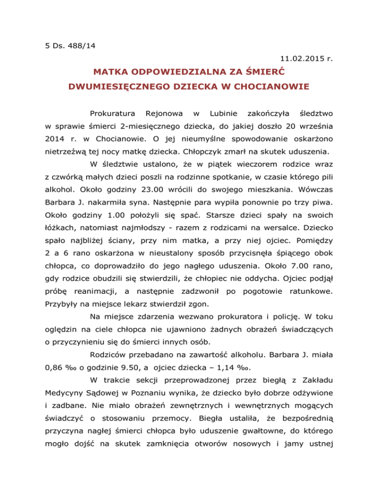 5 Ds. 488/14 11.02.2015 r. MATKA ODPOWIEDZIALNA ZA ŚMIERĆ DWUMIESIĘCZNEGO DZIECKA W CHOCIANOWIE Prokuratura Rejonowa w Lubinie zakończyła śledztwo w sprawie śmierci 2-miesięcznego dziecka, do jakiej doszło 20 września 2014 r. w Chocianowie. O jej nieumyślne spowodowanie oskarżono nietrzeźwą tej nocy matkę dziecka. Chłopczyk zmarł na skutek uduszenia. W śledztwie ustalono, że w piątek wieczorem rodzice wraz z czwórką małych dzieci poszli na rodzinne spotkanie, w czasie którego pili alkohol. Około godziny 23.00 wrócili do swojego mieszkania. Wówczas Barbara J. nakarmiła syna. Następnie para wypiła ponownie po trzy piwa. Około godziny 1.00 położyli się spać. Starsze dzieci spały na swoich łóżkach, natomiast najmłodszy - razem z rodzicami na wersalce. Dziecko spało najbliżej ściany, przy nim matka, a przy niej ojciec. Pomiędzy 2 a 6 rano oskarżona w nieustalony sposób przycisnęła śpiącego obok chłopca, co doprowadziło do jego nagłego uduszenia. Około 7.00 rano, gdy rodzice obudzili się stwierdzili, że chłopiec nie oddycha. Ojciec podjął próbę reanimacji, a następnie zadzwonił po pogotowie ratunkowe. Przybyły na miejsce lekarz stwierdził zgon. Na miejsce zdarzenia wezwano prokuratora i policję. W toku oględzin na ciele chłopca nie ujawniono żadnych obrażeń świadczących o przyczynieniu się do śmierci innych osób. Rodziców przebadano na zawartość alkoholu. Barbara J. miała 0,86 ‰ o godzinie 9.50, a ojciec dziecka – 1,14 ‰. W trakcie sekcji przeprowadzonej przez biegłą z Zakładu Medycyny Sądowej w Poznaniu wynika, że dziecko było dobrze odżywione i zadbane. Nie miało obrażeń zewnętrznych i wewnętrznych mogących świadczyć o stosowaniu przemocy. Biegła ustaliła, że bezpośrednią przyczyna nagłej śmierci chłopca było uduszenie gwałtowne, do którego mogło dojść na skutek zamknięcia otworów nosowych i jamy ustnej 2 materiałem miękkim (np. poduszką), bądź na skutek unieruchomienia narządów klatki piersiowej częścią ciała leżącego obok rodzica. Jako czas zgonu wskazała okres pomiędzy godziną 02:00 a 06:00 w dniu 20.09.2014 r. W śledztwie uzyskano też opinię biegłego z zakresu badań retrospektywnych. Wynika z niej, że w godzinach od 2:00 do 6:00 w organizmie Barbary J. mógł znajdować się alkohol w przedziale od około 1,5 do 2,1 ‰. W oparciu o zgromadzony materiał dowodowy prokurator ocenił, iż z uwagi na stan nietrzeźwości to Barbara J. jako matka, na której ciążył szczególny obowiązek opieki nad dzieckiem, naraziła syna na bezpośrednie niebezpieczeństwo utraty życia albo ciężkiego uszczerbku na zdrowiu oraz nieumyślnie doprowadziła do jego śmierci. Kobiecie przedstawiono zarzuty. Ww. przesłuchana w charakterze podejrzanej przyznała się do popełnienia zarzucanego jej czynu i złożyła wyjaśnienia. Za nieumyślne spowodowanie śmierci Barbarze J. grozi kara od 3 miesięcy do 5 lat pozbawienia wolności. Z oskarżoną, która bardzo żałowała tego co się stało uzgodniono dobrowolne poddanie się karze. Prokurator ocenił, że cele postępowania zostaną osiągnięte bez przeprowadzenia rozprawy. Ustalona kara to 2 lata pozbawienia wolności z warunkowym zawieszeniem jej wykonania na maksymalny okres, a zatem 5 lat próby, oddanie w tym okresie pod dozór kuratora sądowego, a także zobowiązanie do podjęcia leczenia odwykowego. Sprawę rozpozna Sąd Rejonowy w Lubinie. Przed sądem rodzinnym toczy się obecnie postępowanie o pozbawienie rodziców w placówce wychowawczej władzy rodzicielskiej. Dzieci przebywają