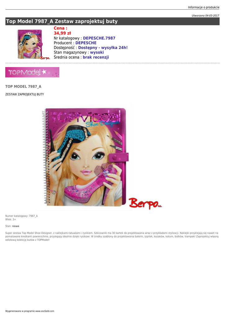 Informacje o produkcie Utworzono 04-03-2017 Top Model 7987_A Zestaw zaprojektuj buty Cena : 34,99 zł Nr katalogowy : DEPESCHE.7987 Producent : DEPESCHE Dostępność : Dostępny - wysyłka 24h! Stan magazynowy : wysoki Średnia ocena : brak recenzji TOP MODEL 7987_A ZESTAW ZAPROJEKTUJ BUTY Numer katalogowy: 7987_A Wiek: 3+ Stan: nowe Super zestaw Top Model Shoe Designer, z naklejkami-tatuażami i rysikiem. Szkicownik ma 30 kartek do projektowania wraz z przykładami stylizacji. Naklejki przyklejają się nawet na pomalowane kredkami powierzchnie, przylegają idealnie dzięki rysikowi. W środku szablony do projektowania balerin, szpilek, kozaków, koturn, botków, trampek! Zaprojektuj własną odlotową kolekcję butów z TOPModel! Wygenerowano w programie www.oscGold.com Dostępność w salonach: Ilość sztuk: Sklep - Złotniki: 8 Sklep - zlikwidowany: 0 Sklep - Szczepankowo: 1 Dostępne opcje Top Model 7987_A Zestaw zaprojektuj buty » Wiek: 3 - 4 lat, 5 - 7 lat, 8 - 11 lat, 12 lat i więcej.