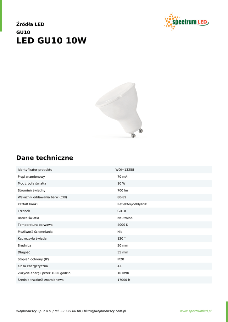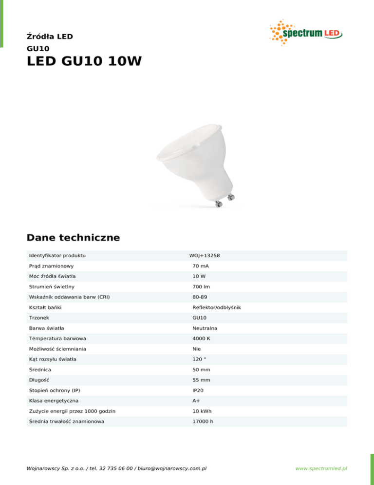 Źródła LED GU10 LED GU10 10W Dane techniczne Identyfikator produktu WOJ+13258 Prąd znamionowy 70 mA Moc źródła światła 10 W Strumień świetlny 700 lm Wskaźnik oddawania barw (CRI) 80-89 Kształt bańki Reflektor/odbłyśnik Trzonek GU10 Barwa światła Neutralna Temperatura barwowa 4000 K Możliwość ściemniania Nie Kąt rozsyłu światła 120 ° Średnica 50 mm Długość 55 mm Stopień ochrony (IP) IP20 Klasa energetyczna A+ Zużycie energii przez 1000 godzin 10 kWh Średnia trwałość znamionowa 17000 h Wojnarowscy Sp. z o.o. / tel. 32 735 06 00 / [email protected] www.spectrumled.pl Źródła LED GU10 LED GU10 10W Pozostałe zdjęcia: Wojnarowscy Sp. z o.o. / tel. 32 735 06 00 / [email protected] Powered by TCPDF (www.tcpdf.org) www.spectrumled.pl