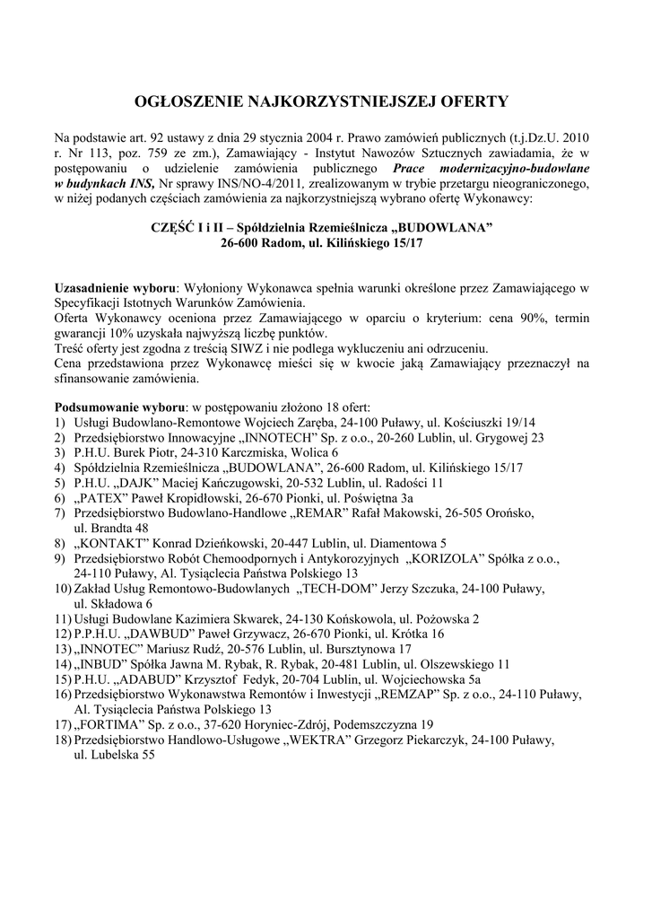 OGŁOSZENIE NAJKORZYSTNIEJSZEJ OFERTY Na podstawie art. 92 ustawy z dnia 29 stycznia 2004 r. Prawo zamówień publicznych (t.j.Dz.U. 2010 r. Nr 113, poz. 759 ze zm.), Zamawiający - Instytut Nawozów Sztucznych zawiadamia, że w postępowaniu o udzielenie zamówienia publicznego Prace modernizacyjno-budowlane w budynkach INS, Nr sprawy INS/NO-4/2011, zrealizowanym w trybie przetargu nieograniczonego, w niżej podanych częściach zamówienia za najkorzystniejszą wybrano ofertę Wykonawcy: CZĘŚĆ I i II – Spółdzielnia Rzemieślnicza „BUDOWLANA” 26-600 Radom, ul. Kilińskiego 15/17 Uzasadnienie wyboru: Wyłoniony Wykonawca spełnia warunki określone przez Zamawiającego w Specyfikacji Istotnych Warunków Zamówienia. Oferta Wykonawcy oceniona przez Zamawiającego w oparciu o kryterium: cena 90%, termin gwarancji 10% uzyskała najwyższą liczbę punktów. Treść oferty jest zgodna z treścią SIWZ i nie podlega wykluczeniu ani odrzuceniu. Cena przedstawiona przez Wykonawcę mieści się w kwocie jaką Zamawiający przeznaczył na sfinansowanie zamówienia. Podsumowanie wyboru: w postępowaniu złożono 18 ofert: 1) Usługi Budowlano-Remontowe Wojciech Zaręba, 24-100 Puławy, ul. Kościuszki 19/14 2) Przedsiębiorstwo Innowacyjne „INNOTECH” Sp. z o.o., 20-260 Lublin, ul. Grygowej 23 3) P.H.U. Burek Piotr, 24-310 Karczmiska, Wolica 6 4) Spółdzielnia Rzemieślnicza „BUDOWLANA”, 26-600 Radom, ul. Kilińskiego 15/17 5) P.H.U. „DAJK” Maciej Kańczugowski, 20-532 Lublin, ul. Radości 11 6) „PATEX” Paweł Kropidłowski, 26-670 Pionki, ul. Poświętna 3a 7) Przedsiębiorstwo Budowlano-Handlowe „REMAR” Rafał Makowski, 26-505 Orońsko, ul. Brandta 48 8) „KONTAKT” Konrad Dzieńkowski, 20-447 Lublin, ul. Diamentowa 5 9) Przedsiębiorstwo Robót Chemoodpornych i Antykorozyjnych „KORIZOLA” Spółka z o.o., 24-110 Puławy, Al. Tysiąclecia Państwa Polskiego 13 10) Zakład Usług Remontowo-Budowlanych „TECH-DOM” Jerzy Szczuka, 24-100 Puławy, ul. Składowa 6 11) Usługi Budowlane Kazimiera Skwarek, 24-130 Końskowola, ul. Pożowska 2 12) P.P.H.U. „DAWBUD” Paweł Grzywacz, 26-670 Pionki, ul. Krótka 16 13) „INNOTEC” Mariusz Rudź, 20-576 Lublin, ul. Bursztynowa 17 14) „INBUD” Spółka Jawna M. Rybak, R. Rybak, 20-481 Lublin, ul. Olszewskiego 11 15) P.H.U. „ADABUD” Krzysztof Fedyk, 20-704 Lublin, ul. Wojciechowska 5a 16) Przedsiębiorstwo Wykonawstwa Remontów i Inwestycji „REMZAP” Sp. z o.o., 24-110 Puławy, Al. Tysiąclecia Państwa Polskiego 13 17) „FORTIMA” Sp. z o.o., 37-620 Horyniec-Zdrój, Podemszczyzna 19 18) Przedsiębiorstwo Handlowo-Usługowe „WEKTRA” Grzegorz Piekarczyk, 24-100 Puławy, ul. Lubelska 55 Porównanie oceny złożonych ofert: Nr oferty 1 2 3 4 5 6 7 8 9 10 11 12 13 14 15 16 17 18 Oznaczenie Wykonawcy Usługi Budowlano-Remontowe Wojciech Zaręba 24-100 Puławy, ul. Kościuszki 19/14 Przedsiębiorstwo Innowacyjne „INNOTECH” Sp. z o.o. 20-260 Lublin, ul. Grygowej 23 P.H.U. Burek Piotr 24-310 Karczmiska, Wolica 6 Spółdzielnia Rzemieślnicza „BUDOWLANA” 26-600 Radom, ul. Kilińskiego 15/17 P.H.U. „DAJK” Maciej Kańczugowski, 20-532 Lublin, ul. Radości 11 „PATEX” Paweł Kropidłowski 26-670 Pionki, ul. Poświętna 3a Przedsiębiorstwo Budowlano- Handlowe „REMAR” Rafał Makowski 26-505 Orońsko, ul. Brandta 48 „KONTAKT” Konrad Dzieńkowski 20-447 Lublin, ul. Diamentowa 5 „KORIZOLA” Spółka z o.o. 24-110 Puławy, Al. Tysiąclecia Państwa Polskiego 13 „TECH-DOM” Jerzy Szczuka 24-100 Puławy, ul. Składowa 6 Usługi Budowlane Kazimiera Skwarek 24-130 Końskowola, ul. Pożowska 2 P.P.H.U. „DAWBUD” Paweł Grzywacz 26-670 Pionki, ul. Krótka 16 „INNOTEC” Mariusz Rudź 20-576 Lublin, ul. Bursztynowa 17 „INBUD” Spółka Jawna M. Rybak, R. Rybak 20-481 Lublin, ul. Olszewskiego 11 P.H.U. „ADABUD” Krzysztof Fedyk 20-704 Lublin, ul. Wojciechowska 5a „REMZAP” Sp. z o.o. 24-110 Puławy, Al. Tysiąclecia Państwa Polskiego 13 „FORTIMA” Sp. z o.o. 37-620 Horyniec-Zdrój Podemszczyzna 19 „WEKTRA” Grzegorz Piekarczyk 24-100 Puławy, ul. Lubelska 55 CZĘŚĆ I CZĘŚĆ II Ilość punktów w kryterium cena gwarancja OGÓŁEM 90% 10% Ilość punktów w kryterium cena gwarancja OGÓŁEM 90% 10% - - - 76,68 4,29 80,97 63,81 2,86 66,67 61,74 2,86 64,60 83,06 4,29 87,35 - - - 88,47 8,57 97,04 84,87 8,57 93,44 65,70 4,29 69,99 63,54 4,29 67,83 90,00 4,29 94,29 - - - 28,98 5,71 34,69 64,80 5,71 70,51 79,65 7,14 86,79 76,05 7,14 83,19 - - - 38,52 4,29 42,81 66,96 10,00 76,96 68,22 10,00 78,22 70,88 4,29 75,17 60,78 0,35 61,13 - - - 90,00 2,86 92,86 - - - - - - 74,61 4,29 78,90 69,12 4,29 73,41 61,20 7,14 68,34 64,08 7,14 71,22 70,38 7,14 77,52 56,52 7,14 63,66 74,43 7,14 81,57 - - - 65,34 4,29 69,63 51,01 4,29 55,30 Zgodnie z art. 92 ust. 1 pkt. 4) Zamawiający informuje, że umowa w sprawie zamówienia publicznego może być zawarta w terminie 5 dni od dnia przesłania zawiadomienia o wyborze najkorzystniejszej oferty. Środki ochrony prawnej: Od niniejszej decyzji przysługują środki ochrony prawnej określone w ustawie z dnia 29 stycznia 2004 r. Prawo zamówień publicznych (t.j.Dz.U. 2010 r. Nr 113, poz. 759 ze zm.), z późn. zm.) dział VI „Środki ochrony prawnej”. Otrzymują wszyscy uczestnicy postępowania. Puławy, 02.02.2011 r.