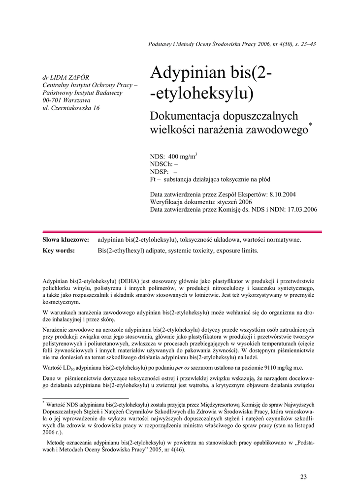 Podstawy i Metody Oceny Środowiska Pracy 2006, nr 4(50), s. 23–43 dr LIDIA ZAPÓR Centralny Instytut Ochrony Pracy – Państwowy Instytut Badawczy 00-701 Warszawa ul. Czerniakowska 16 Adypinian bis(2-etyloheksylu) Dokumentacja dopuszczalnych wielkości narażenia zawodowego* NDS: 400 mg/m3 NDSCh: – NDSP: – Ft – substancja działająca toksycznie na płód Data zatwierdzenia przez Zespół Ekspertów: 8.10.2004 Weryfikacja dokumentu: styczeń 2006 Data zatwierdzenia przez Komisję ds. NDS i NDN: 17.03.2006 Słowa kluczowe: adypinian bis(2-etyloheksylu), toksyczność układowa, wartości normatywne. Key words: Bis(2-ethylhexyl) adipate, systemic toxicity, exposure limits. Adypinian bis(2-etyloheksylu) (DEHA) jest stosowany głównie jako plastyfikator w produkcji i przetwórstwie polichlorku winylu, polistyrenu i innych polimerów, w produkcji nitrocelulozy i kauczuku syntetycznego, a także jako rozpuszczalnik i składnik smarów stosowanych w lotnictwie. Jest też wykorzystywany w przemyśle kosmetycznym. W warunkach narażenia zawodowego adypinian bis(2-etyloheksylu) może wchłaniać się do organizmu na drodze inhalacyjnej i przez skórę. Narażenie zawodowe na aerozole adypinianu bis(2-etyloheksylu) dotyczy przede wszystkim osób zatrudnionych przy produkcji związku oraz jego stosowania, głównie jako plastyfikatora w produkcji i przetwórstwie tworzyw polistyrenowych i poliuretanowych, zwłaszcza w procesach przebiegających w wysokich temperaturach (cięcie folii żywnościowych i innych materiałów używanych do pakowania żywności). W dostępnym piśmiennictwie nie ma doniesień na temat szkodliwego działania adypinianu bis(2-etyloheksylu) na ludzi. Wartość LD50 adypinianu bis(2-etyloheksylu) po podaniu per os szczurom ustalono na poziomie 9110 mg/kg m.c. Dane w piśmiennictwie dotyczące toksyczności ostrej i przewlekłej związku wskazują, że narządem docelowego działania adypinianu bis(2-etyloheksylu) u zwierząt jest wątroba, a krytycznym objawem działania związku * Wartość NDS adypinianu bis(2-etyloheksylu) została przyjęta przez Międzyresortową Komisję do spraw Najwyższych Dopuszczalnych Stężeń i Natężeń Czynników Szkodliwych dla Zdrowia w Środowisku Pracy, która wnioskowała o jej wprowadzenie do wykazu wartości najwyższych dopuszczalnych stężeń i natężeń czynników szkodliwych dla zdrowia w środowisku pracy w rozporządzeniu ministra właściwego do spraw pracy (stan na listopad 2006 r.). Metodę oznaczania adypinianu bis(2-etyloheksylu) w powietrzu na stanowiskach pracy opublikowano w „Podstawach i Metodach Oceny Środowiska Pracy” 2005, nr 4(46). 23 jest rozrost (proliferacja) peroksysomów w hepatocytach. Adypinian bis(2-etyloheksylu) nie wykazywał działania genotoksycznego w wielu układach eksperymentalnych, powodował występowanie pierwotnych raków wątroby u myszy, nie powodował jednak wzrostu częstości występowania zmian nowotworowych u szczurów. W 2000 r. eksperci IARC na podstawie istniejących danych toksykologicznych, biorąc pod uwagę przypuszczalny mechanizm działania adypinianu bis(2-etyloheksylu), zaliczyli związek do grupy 3., argumentując to brakiem wystarczających dowodów rakotwórczego działania związku u ludzi i zwierząt doświadczalnych. Nowotwory wykryte u zwierząt doświadczalnych (myszy) powstają na drodze niegenotoksycznego mechanizmu i są następstwem proliferacji peroksysomów w wątrobie i wzrostu zawartości aktywnych form tlenu w hepatocytach. Zdaniem ekspertów IARC wyniki badań dotyczących molekularnych podstaw proliferacji peroksysomów wskazują, że ludzkie hepatocyty mogą być oporne na indukcję proliferacji peroksysomów odpowiadającą za powstawanie procesu nowotworowego u gryzoni. W badaniach na szczurach adypinian bis(2-etyloheksylu) wykazywał działanie embriotoksyczne, fetotoksyczne i teratogenne. Nie obserwowano działania gonadotoksycznego oraz wpływu związku na rozrodczość zwierząt. Za podstawę wartości NDS adypinianu bis(2-etyloheksylu) przyjęto wyniki dwuletnich badań na szczurach przeprowadzonych przez NTP, w których nie stwierdzono u zwierząt wzrostu częstości występowania nowotworów, a za największą dawkę, po której nie obserwowano szkodliwego działania związku (NOAEL) uznano wartość 700 mg/kg m.c./dzień. Dawkę tę przeliczono na równoważne dla człowieka stężenie związku w powietrzu, a następnie podzielono przez sumaryczny współczynnik niepewności i wyznaczono wartość NDS na poziomie 400 mg/m3. Nie ma podstaw do ustalenia wartości najwyższego dopuszczalnego stężenia chwilowego (NDSCh) adypinianu bis(2-etyloheksylu). Nie ma też podstaw do ustalania wartości dopuszczalnego stężenia w materiale biologicznym (DSB) adypinianu bis(2-etyloheksylu). Wyniki badań na zwierzętach upoważniają do zaliczenia adypinianu bis(2-etyloheksylu) do związków mających działanie fetotoksyczne i teratogenne, dlatego proponuje się oznakowanie związku literami „Ft” oznaczającymi substancję działającą toksycznie na płód. CHARAKTERYSTYKA SUBSTANCJI, ZASTOSOWANIE, NARAŻENIE ZAWODOWE Ogólna charakterystyka Ogólna charakterystyka adypinianu bis(2-etyloheksylu), (CESARS 2003; Genium’s 1999; IARC 2000; Sax 2000): – wzór sumaryczny C22H42O4 – wzór strukturalny O C2H5 C –– O –– CH2 –– CH –– (CH2)3 –– CH3 (CH2)4 C –– O –– CH2 –– CH –– (CH2)3 –– CH3 C2H5 – nazwa chemiczna (IUPAC) adipic acid bis(2-ethylhexyl)ester; bis(2-ethylhexyl)adipate – numer CAS 103-23-1 – nazwa chemiczna CAS hexanedioic acid; bis(2-ethylhexyl)ester – numer RTECS AU9700000 – numer WE 203-090-1 24 – synonimy: – wybrane nazwy handlowe: adypinian 2-dietyloheksylu, adypinian dioktylu, adypinian oktylu, bis(etyloheksylo)ester, ester dioktylu, BEHA i DEHA Adimoll DO, Adipol 2EH, ADO, ADO (lubricating oil), Arlamol DOA, Bisoflex DOA, Crodamol DOA, Diacizer DOA, Eastman DOA Plasticiz