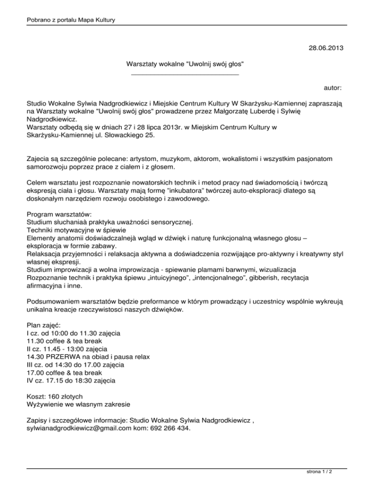 Pobrano z portalu Mapa Kultury 28.06.2013 Warsztaty wokalne "Uwolnij swój głos" ____________________________ autor: Studio Wokalne Sylwia Nadgrodkiewicz i Miejskie Centrum Kultury W Skarżysku-Kamiennej zapraszają na Warsztaty wokalne "Uwolnij swój głos" prowadzene przez Małgorzatę Luberdę i Sylwię Nadgrodkiewicz. Warsztaty odbędą się w dniach 27 i 28 lipca 2013r. w Miejskim Centrum Kultury w Skarżysku-Kamiennej ul. Słowackiego 25. Zajecia są szczególnie polecane: artystom, muzykom, aktorom, wokalistomi i wszystkim pasjonatom samorozwoju poprzez prace z ciałem i z głosem. Celem warsztatu jest rozpoznanie nowatorskich technik i metod pracy nad świadomością i twórczą ekspresją ciała i głosu. Warsztaty mają formę ”inkubatora” twórczej auto-eksploracji dlatego są doskonałym narzędziem rozwoju osobistego i zawodowego. Program warsztatów: Studium słuchaniaà praktyka uważności sensorycznej. Techniki motywacyjne w śpiewie Elementy anatomii doświadczalnejà wgląd w dźwięk i naturę funkcjonalną własnego głosu – eksploracja w formie zabawy. Relaksacja przyjemności i relaksacja aktywna a doświadczenia rozwijające pro-aktywny i kreatywny styl własnej ekspresji. Studium improwizacji a wolna improwizacja - spiewanie plamami barwnymi, wizualizacja Rozpoznanie technik i praktyka śpiewu „intuicyjnego”, „intencjonalnego”, gibberish, recytacja afirmacyjna i inne. Podsumowaniem warsztatów będzie preformance w którym prowadzący i uczestnicy wspólnie wykreują unikalna kreacje rzeczywistosci naszych dźwięków. Plan zajęć: I cz. od 10:00 do 11.30 zajęcia 11.30 coffee & tea break II cz. 11.45 - 13:00 zajęcia 14.30 PRZERWA na obiad i pausa relax III cz. od 14:30 do 17.00 zajęcia 17.00 coffee & tea break IV cz. 17.15 do 18:30 zajęcia Koszt: 160 złotych Wyżywienie we własnym zakresie Zapisy i szczegółowe informacje: Studio Wokalne Sylwia Nadgrodkiewicz , [email protected] kom: 692 266 434. strona 1 / 2 Pobrano z portalu Mapa Kultury Polecamy przynieść ze sobą: wygody strój, karimatę, mały koc lub ręcznik. Trenerki: Malgorzata Luberda - badaczka alternatywnych metod i technik pracy z głosem. Vocal Coach, performer i wokalistka. Twórczyni Laboratoria Alternatywnych Form Pracy z głosem, technik ekspresyjnych i relaksacyjnych w Wenecji (Mestre). W swojej pracy łączy wiedzę z zakresu psychologii głosu i komunikacji z wiedzą o naturze funkcjonalnej i ekspresyjnej ciała i głosu ludzkiego. Pasjonuje ją wielowymiarowy aspekt pracy z głosem i ciałem. Jej warszaty charakteryzują się kreatywnym i wielodyscyplinarnym podejściem, oferując unikatowe doświadczenia i instrumentalne, praktyczne rezultaty. Sylwia Nadgrodkiewicz - wokalistka, nauczycielka śpiewu, animatorka kultury, doktor nauk humanistycznych. Odtwórczyni roli królowej Marysieńki w Śpiewogrze Świętokrzyskiej skomponowanej przez Bronisława Opałko. Obecnie współpracuje z Laboratorium Alternatywnych Form Pracy z Głosem Małgorzaty Luberdy (uczennicy Olgi Szwajgier) oraz takimi projektami jak Włodzimierz Kinior Kiniorski Flap Style, Natural Beat Band oraz Big Queens, Sylvia&Jarek Duo, Piotr Szkil Quartet. Organizatorka warsztatów gospel. Autorka książki Seyla Benhabib - feminizm i polityka. Współtwórczyni projektu Wieża Bab L - współpraca z Galerią Białą w Lublinie. strona 2 / 2