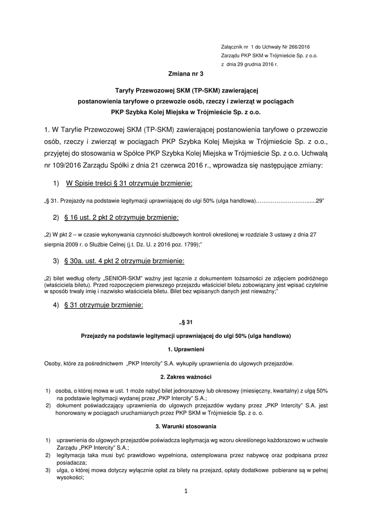 Załącznik nr 1 do Uchwały Nr 266/2016 Zarządu PKP SKM w Trójmieście Sp. z o.o. z dnia 29 grudnia 2016 r. Zmiana nr 3 Taryfy Przewozowej SKM (TP-SKM) zawierającej postanowienia taryfowe o przewozie osób, rzeczy i zwierząt w pociągach PKP Szybka Kolej Miejska w Trójmieście Sp. z o.o. 1. W Taryfie Przewozowej SKM (TP-SKM) zawierającej postanowienia taryfowe o przewozie osób, rzeczy i zwierząt w pociągach PKP Szybka Kolej Miejska w Trójmieście Sp. z o.o., przyjętej do stosowania w Spółce PKP Szybka Kolej Miejska w Trójmieście Sp. z o.o. Uchwałą nr 109/2016 Zarządu Spółki z dnia 21 czerwca 2016 r., wprowadza się następujące zmiany: 1) W Spisie treści § 31 otrzymuje brzmienie: „§ 31. Przejazdy na podstawie legitymacji uprawniającej do ulgi 50% (ulga handlowa)………………………......29” 2) § 16 ust. 2 pkt 2 otrzymuje brzmienie: „2) W pkt 2 – w czasie wykonywania czynności służbowych kontroli określonej w rozdziale 3 ustawy z dnia 27 sierpnia 2009 r. o Służbie Celnej (j.t. Dz. U. z 2016 poz. 1799);” 3) § 30a. ust. 4 pkt 2 otrzymuje brzmienie: „2) bilet według oferty „SENIOR-SKM” ważny jest łącznie z dokumentem tożsamości ze zdjęciem podróżnego (właściciela biletu). Przed rozpoczęciem pierwszego przejazdu właściciel biletu zobowiązany jest wpisać czytelnie w sposób trwały imię i nazwisko właściciela biletu. Bilet bez wpisanych danych jest nieważny;” 4) § 31 otrzymuje brzmienie: „§ 31 Przejazdy na podstawie legitymacji uprawniającej do ulgi 50% (ulga handlowa) 1. Uprawnieni Osoby, które za pośrednictwem „PKP Intercity” S.A. wykupiły uprawnienia do ulgowych przejazdów. 2. Zakres ważności 1) osoba, o której mowa w ust. 1 może nabyć bilet jednorazowy lub okresowy (miesięczny, kwartalny) z ulgą 50% na podstawie legitymacji wydanej przez „PKP Intercity” S.A.; 2) dokument poświadczający uprawnienia do ulgowych przejazdów wydany przez „PKP Intercity” S.A. jest honorowany w pociągach uruchamianych przez PKP SKM w Trójmieście Sp. z o. o. 3. Warunki stosowania 1) 2) 3) uprawnienia do ulgowych przejazdów poświadcza legitymacja wg wzoru określonego każdorazowo w uchwale Zarządu „PKP Intercity” S.A.; legitymacja taka musi być prawidłowo wypełniona, ostemplowana przez nabywcę oraz podpisana przez posiadacza; ulga, o której mowa dotyczy wyłącznie opłat za bilety na przejazd, opłaty dodatkowe pobierane są w pełnej wysokości; 1 4) jeżeli podróżny oświadczy, że posiada uprawnienie do ulgowego przejazdu, ale nie okaże w pociągu ważnej legitymacji, wówczas zwrot (umorzenie) zapłaconych w pociągu (wykazanych w wezwaniu do zapłaty) opłat taryfowych i opłaty dodatkowej za przejazd bez ważnego biletu, ustalonej na podstawie Rozporządzenia MI z dnia 20.01.2005 r. – po potrąceniu (uiszczeniu) opłaty manipulacyjnej – może uzyskać w drodze reklamacji, na warunkach określonych w Regulaminie SKM. Wysokość opłaty manipulacyjnej określona jest w Cenniku usług. 4. Zmiana umowy przewozu 1) przejazd poza stację przeznaczenia wskazaną na bilecie na podstawie legitymacji „PKP Intercity” S.A dozwolony jest na zasadach określonych w postanowieniach § 8; przejście do pociągu innego przewoźnika na podstawie legitymacji wydanej przez PKP Intercity S.A. jest dozwolone na zasadach obowiązujących w pociągach „PKP Intercity” S.A.” 2) 5) § 34 ust. 4 pkt 2 otrzymuje brzmienie: „2) Bilet Miejski odcinkowy imienny miesięczny ważny jest łącznie z dokumentem tożsamości ze zdjęciem właściciela. Przed rozpoczęciem pierwszego przejazdu właściciel biletu zobowiązany jest wpisać czytelnie w sposób trwały imię i nazwisko właściciela biletu. Bilet bez wpisanych danych jest nieważny;” 6) § 35 ust. 4 pkt 2 otrzymuje brzmienie: „2) Bilet Trójmiejski odcinkowy imienny miesięczny ważny jest łącznie z dokumentem tożsamości ze zdjęciem właściciela. Przed rozpoczęciem pierwszego przejazdu właściciel biletu zobowiązany jest wpisać czytelnie w sposób trwały imię i nazwisko właściciela biletu. Bilet bez wpisanych danych jest nieważny;” 7) § 40 ust. 7 otrzymuje brzmienie: „7. Przed rozpoczęciem pierwszego przejazdu właściciel biletu zobowiązany jest wpisać czytelnie w sposób trwały imię i nazwisko właściciela biletu. Bilet bez wpisanych danych i bez dokumentu ze zdjęciem jest nieważny.” 8) § 43 ust. 3 pkt 3 otrzymuje brzmienie: „3) właściciel Promocyjnego Biletu Miesięcznego „Tandemowego” jest zobowiązany przed rozpoczęciem pierwszego przejazdu wpisać czytelnie w sposób trwały imię i nazwisko właściciela biletu. Bilet bez wpisanych danych i bez dokumentu ze zdjęciem jest nieważny.” 9) § 44 ust. 3 pkt 3 otrzymuje brzmienie: „3) bilet sieciowy ważny jest łącznie z dokumentem tożsamości ze zdjęciem właściciela. Przed rozpoczęciem pierwszego przejazdu właściciel biletu zobowiązany jest wpisać czytelnie w sposób trwały imię i nazwisko właściciela biletu. Bilet bez wpisanych danych jest nieważny;” 2. Zmiany obowiązują od dnia 1 stycznia 2017 r. 2