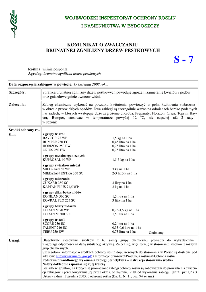 WOJEWÓDZKI INSPEKTORAT OCHRONY ROŚLIN I NASIENNICTWA W BYDGOSZCZY KOMUNIKAT O ZWALCZANIU BRUNATNEJ ZGNILIZNY DRZEW PESTKOWYCH S-7 Roślina: wiśnia pospolita Agrofag: brunatna zgnilizna drzew pestkowych Data rozpoczęcia zabiegów w powiecie: 19 kwietnia 2008 roku. Szczegóły: Sprawca brunatnej zgnilizny drzew pestkowych powoduje zgorzel i zamieranie kwiatów i pędów oraz gniazdowe gnicie owoców wiśni. Zalecenia: Zabieg chemiczny wykonać na początku kwitnienia, powtórzyć w pełni kwitnienia zwłaszcza w okresie przewlekłych opadów. Dwa zabiegi są szczególnie ważne na odmianach bardzo podatnych i w sadach, w których występuje duże zagrożenie chorobą. Preparaty: Horizon, Orius, Topsin, Baycor, Bumper, stosować w temperaturze powyżej 12 0C, nie częściej niż 2 razy w sezonie. Środki ochrony roz grupy triazoli ślin: Uwagi: BAYCOR 25 WP BUMPER 250 EC HORIZON 250 EW ORIUS 250 EW 1,5 kg na 1 ha 0,45 litra na 1 ha 0,75 litra na 1 ha 0,75 litra na 1 ha z grupy metaloorganicznych KUPROSAL 60 WP 1,5-3 kg na 1 ha z grupy związków miedzi MIEDZIAN 50 WP MIEDZIAN EXTRA 350 SC 3 kg na 1 ha 2-3 litrów na 1 ha z grupy mieszanin CUKARB 350 SC KAPTAN PLUS 71,5 WP 3 litry na 1 ha 2 kg na 1 ha z grupy dikarboksymidów RONILAN 500 SC ROVRAL FLO 255 SC 1,5 litra na 1 ha 3 litry na 1 ha z grupy benzymidazoli TOPSIN M 70 WP TOPSIN M 500 SC 0,75-1,5 kg na 1 ha 1,5 litra na 1 ha z grupy triazoli SCORE 250 EC TALENT 240 EC TEBU 250 EW 0,2 litra na 1 ha 0,35-0,6 litra na 1 ha 0,75 litra na 1 ha Oodmiany Długotrwałe stosowanie środków z tej samej grupy chemicznej prowadzi do wykształcenia u agrofaga odporności na daną substancję aktywną. Zaleca się, więc rotację w stosowaniu środków z różnych grup chemicznych. Szczegółowe informacje o środkach ochrony roślin dopuszczonych do stosowania w Polsce są dostępne pod adresem: http://www.minrol.gov.pl/ >Informacje branżowe>Produkcja roślinna>Ochrona roślin Podstawą prawidłowego wykonania zabiegu jest etykieta – instrukcja stosowania środka. Należy dokładnie zapoznać się z jej treścią. Posiadacze gruntów, na których są prowadzone zabiegi ochrony roślin są zobowiązani do prowadzenia ewidencji zabiegów i przechowywania jej przez okres, co najmniej 2 lat od wykonania zabiegu. [art.71 pkt.1,2 i 3 Ustawy z dnia 18 grudnia 2003. o ochronie roślin (Dz. U. Nr 11, poz, 94 ze zm.) * ODMIANY wiśni i czereśni różnią się znacznie podatnością na chorobę. Wśród wiśni najbardziej podatna jest „Northstar”. O zagrożeniu chorobą można wnioskować na podstawie występowania choroby w danym sadzie oraz panujących warunków atmosferycznych. Zwalczanie choroby obejmuje jeden zabieg w początkowej fazie kwitnienia (biały pąk-skala BBCH 60), lub dwa zabiegi – w okresie białego pąka i pełni kwitnienia (skala BBCH 65). Wycinanie porażonych pędów ogranicza źródło zakażenia.