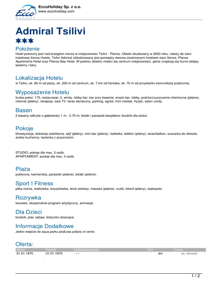 EccoHoliday Sp. z o.o. www.eccoholiday.com Admiral Tsilivi Położenie Hotel położony jest nad brzegiem morza w miejscowości Tsilivi - Planos. Obiekt zbudowany w 2000 roku, należy do sieci hotelowej Xenos Hotels. Tsilivi Admiral zlokalizowany jest pomiędzy dwoma siostrzanymi hotelami sieci Xenos: Planos Apartments Hotel oraz Planos Bay Hotel. W pobliżu obiektu mieści się centrum miejscowości, gdzie znajdują się liczne sklepy, tawerny i bary. Lokalizacja Hotelu w Tsilivi, ok. 80 m od plaży, ok. 200 m od centrum, ok. 7 km od lotniska, ok. 70 m od przystanku komunikacji publicznej. Wyposażenie Hotelu liczba pokoi: 170, restauracje: 2, windy, lobby bar, bar przy basenie, snack bar, lobby, pralnia/czyszczenie chemiczne (płatne), internet (płatny), recepcja, sala TV, taras słoneczny, parking, ogród, mini market, fryzjer, salon urody. Basen 2 baseny odkryte o głębokości 1 m - 2.70 m; leżaki i parasole bezpłatne; brodzik dla dzieci. Pokoje klimatyzacja, telewizja satelitarna, sejf (płatny), mini bar (płatny), lodówka, telefon (płatny), taras/balkon, suszarka do włosów, aneks kuchenny, łazienka z prysznicem. STUDIO: pokoje dla max. 3 osób. APARTAMENT: pookje dla max. 4 osób. Plaża publiczna, kamienista, parasole (płatne), leżaki (płatne). Sport I Fitness piłka nożna, siatkówka, koszykówka, tenis stołowy, masaże (płatne), rzutki, bilard (płatny), waterpolo. Rozrywka karaoke, okazjonalnie program artystyczny, animacje. Dla Dzieci brodzik, plac zabaw, łóżeczko dziecięce. Informacje Dodatkowe Jedno wejscie do aqua parku podczas pobytu w cenie. Oferta: Wylot 01.01.1970 Powrót 01.01.1970 Zakwaterowanie -- Dni dni Cena os. dorosła 1/2 EccoHoliday Sp. z o.o. www.eccoholiday.com godz. godz. () 2/2 Powered by TCPDF (www.tcpdf.org)