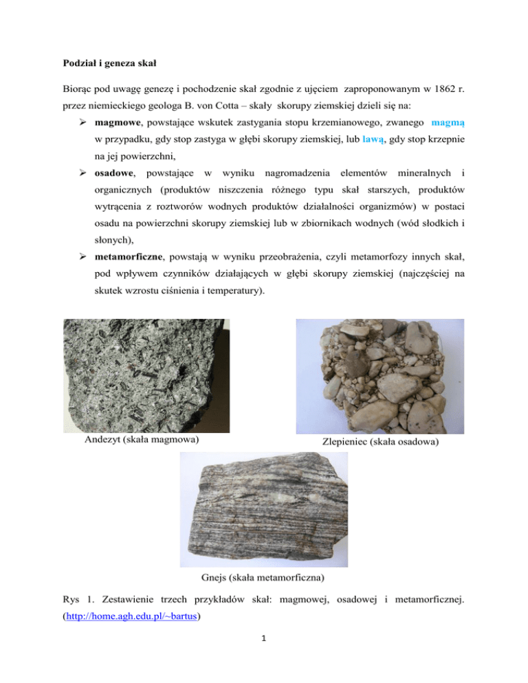 Podział i geneza skał Biorąc pod uwagę genezę i pochodzenie skał zgodnie z ujęciem zaproponowanym w 1862 r. przez niemieckiego geologa B. von Cotta – skały skorupy ziemskiej dzieli się na: magmowe, powstające wskutek zastygania stopu krzemianowego, zwanego magmą w przypadku, gdy stop zastyga w głębi skorupy ziemskiej, lub lawą, gdy stop krzepnie na jej powierzchni, osadowe, powstające w wyniku nagromadzenia elementów mineralnych i organicznych (produktów niszczenia różnego typu skał starszych, produktów wytrącenia z roztworów wodnych produktów działalności organizmów) w postaci osadu na powierzchni skorupy ziemskiej lub w zbiornikach wodnych (wód słodkich i słonych), metamorficzne, powstają w wyniku przeobrażenia, czyli metamorfozy innych skał, pod wpływem czynników działających w głębi skorupy ziemskiej (najczęściej na skutek wzrostu ciśnienia i temperatury). Andezyt (skała magmowa) Zlepieniec (skała osadowa) Gnejs (skała metamorficzna) Rys 1. Zestawienie trzech przykładów skał: magmowej, osadowej i metamorficznej. (http://home.agh.edu.pl/~bartus) 1 Powyższy podział, pomimo rozwoju nauki i technicznych możliwości badania skał i minerałów, w dalszym ciągu dobrze klasyfikuje większość skał występujących w obrębie skorupy ziemskiej. Istnieje także duża grupa skał, które ze względu na swoją genezę, są trudne do przyporządkowania do konkretnej grupy. Tego typu skały często nazywa się przejściowymi, używając dodatkowych określeń, pomiędzy jakimi grupami następuje przejście, np. tuf charakteryzuje się pochodzeniem magmowo-osadowym. Rys. 2. Tuf filipowicki – przykład skały osadowej, klastycznej, piroklastycznej, przez część geologów zaliczana do skał magmowych pochodzenia wylewnego. Skała powstaje w wyniku procesów wulkanicznych jako produkt erupcji wulkanicznej, natomiast dalszy proces formowania się sedymentacyjnym, skały stąd następuje jej w basenie przejściowy charakter: magmowo-osadowy (http://muzeum.pgi.gov.pl) Podobnie granica pomiędzy poszczególnymi typami skał bardzo często jest niewyraźna, co niekiedy prowadzi do tworzenia innych klasyfikacji i podziałów przez różne grupy geologów. Masy skalne, tworzące naszą planetę, podlegają migracji na skutek różnych procesów geologicznych. Procesy takie jak np. ruchy górotwórcze i lądotwórcze, plutonizm i wulkanizm przemieszczają masy skalne w różnym stanie z głębszych części skorupy w wyższe; na powierzchni erozja przy współudziale wietrzenia, krążenia wód, ruchów masowych oraz zdolności transportowych wody, wiatru i fal morskich przenosi rozdrobnione masy skalne z wyższych części w niższe obszary, gdzie w pewnych strefach, mogą znowu dostać się w znaczne głębokości (Książkiewicz M. 1979). Dlatego w wyniku przemieszczania skał zmieniają się oddziaływujące na nie warunki ciśnienia i temperatury – podstawowe czynniki skałotwórcze, co prowadzi do powstawania jednych skał kosztem innych. Proces ten tworzy zamknięty cykl, który nie ma początku ani końca. Nie zawsze przebiega także według określonych na schemacie prawidłowości. Oto uproszczony przykład zmiany cyklu: skała metamorficzna (gnejs) na skutek ruchów wznoszących (np. izostazji) zostaje wydźwignięta na powierzchnię ziemi, gdzie w wyniku erozji i wietrzenia powstaje z niej skała osadowa (piaskowiec). 2 Rys. 3. Uproszczony schemat krążenia mas skalnych w przyrodzie (Książkiewicz M. 1979). Rys. 4. Główne typy genetyczne skał i ich wzajemne powiązanie (cykl skalny) (http://home.agh.edu.pl/~szydlak) 3