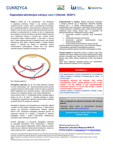 CUKRZYCA CUKRZYCA Diagnostyka 52/2011) Diagnostykalaboratoryjna laboratoryjnacukrzycy cukrzycyczęść częśćIIII(Odcinek (odcinek /2011) Peptyd C składa się z 36 aminokwasów i jest wbudowany w cząsteczkę proinsuliny. Peptyd C jest wycinany podczas uwalniania insuliny z trzustki i razem z nią dostaje się do krwiobiegu. Ilość wydzielanego peptydu C odpowiada ilości wydzielanej insuliny. Peptyd C słuŜy do oceny czynności wydzielniczej komórek β trzustki, poniewaŜ w przeciwieństwie do insuliny nie jest on degradowany przez wątrobę i utrzymuje się dłuŜej w organizmie. Badanie wykonuje się w diagnostyce cukrzycy: w cukrzycy typu I rezerwy insuliny sukcesywnie maleją i stęŜenie peptydu C jest niskie, w cukrzycy typu II tkanki wykazują oporność na działanie insuliny, więc trzustka produkuje jej coraz więcej i stęŜenie peptydu C wzrasta. Badanie peptydu C wykonuje się równieŜ w hipoglikemii, guzach nowotworowych wytwarzających insulinę oraz przy doborze schematu leczenia u pacjentów chorujących na cukrzycę. Autoprzeciwciała w cukrzycy. Badania przeciwciał związanych z cukrzycą wykonuje się w diagnostyce róŜnicowej pomiędzy cukrzycą typu I o etiologii autoimmunizacyjnej, a cukrzycą spowodowaną innymi przyczynami. Stwierdzenie takich przeciwciał u osoby zdrowej lub u rodzeństwa osoby z cukrzycą moŜe oznaczać zwiększone ryzyko rozwoju cukrzycy typu I w przyszłości. Do przeciwciał pomocnych w diagnostyce cukrzycy naleŜą: • przeciwciała przeciwko komórkom wysp trzustkowych (ICA), • przeciwciała przeciwko insulinie (IAA), • przeciwciała przeciwko dekarboksylazie kwasu glutaminowego (GADA), • przeciwciała przeciwko fosfatazom tyrozyny (IA-2A). Autoprzeciwciała nie powodują cukrzycy, ale ich obecność świadczy o nieprawidłowej odpowiedzi immunologicznej organizmu, skierowanej przeciwko własnym komórkom wytwarzającym insulinę. Cukrzyca ciąŜowa to rozpoznanie cukrzycy u kobiety w ciąŜy, która uprzednio była zdrowa. Wstępne oznaczenie stęŜenia glukozy naleŜy wykonać na początku ciąŜy. JeŜeli wynik jest prawidłowy to w 24-28 tygodniu ciąŜy naleŜy wykonać przesiewowy doustny test tolerancji glukozy. JeŜeli wynik wstępnego oznaczenia glukozy jest nieprawidłowy naleŜy niezwłocznie wykonać DTTG z 75g glukozy. . ZAPAMIĘTAJ ! Ryc.1 Budowa peptydu C Hemoglobina glikowana tak jak inne białka glikowane powstaje w wyniku reakcji glikacji, czyli nieenzymatycznego łączenia glukozy z grupami aminowymi róŜnych białek. Proces ten dotyczy wszystkich białek znajdujących się w środowisku glukozy, a jego intensywność wzrasta wraz ze stęŜeniem glukozy oraz czasem oddziaływania. Zmiana poziomu HbA1c o 1%odpowiada zmianie średniego stęŜenia glukozy we krwi o 30 mg/dl. U zdrowego człowieka w związku z fizjologicznym poposiłkowym wahaniem wartości glikemii stwierdza się zwykle HbA1c<6% wartości Hb całkowitej. Hemoglobina glikowana jest retrospektywnym wskaźnikiem glikemii i pozwala na ocenę stopnia wyrównania cukrzycy. O dobrej kontroli cukrzycy (jej wyrównaniu metabolicznym) świadczy stęŜenie HbA1c< 6,5%. Oznaczenia hemoglobiny glikowanej powinno się wykonywać rutynowo co 3 miesiące. U pacjentów ze stabilnym przebiegiem choroby i dobrym wyrównaniem metabolicznym oznaczenia moŜna wykonywać co pół roku. Czynniki wpływające na oznaczenie hemoglobiny glikowanej to: przewlekła niewydolność nerek, niedokrwistość z niedoboru Ŝelaza, wysokie stęŜenie trójglicerydów, alkohol. Mogą one zawyŜyć wartość wyniku. Natomiast niedokrwistość hemolityczna, utrata krwi, ciąŜa, przetoczenia krwi, mogą zaniŜyć wartość wyniku. Przy diagnozowaniu cukrzycy podwyŜszone lub prawidłowe stęŜenie peptydu C wskazuje na cukrzycę typu II, niskie - na cukrzycę typu I. Hemoglobina glikowana jest badaniem, które pozwala retrospektywnie ocenić poziom glukozy we krwi w ciągu ostatnich 120 dni. Badanie to jest odzwierciedleniem wyrównania cukrzycy a co za tym idzie koreluje z ryzykiem rozwoju powikłań cukrzycowych. Cukrzyca ciąŜowa, to cukrzyca rozpoznana u kobiety w ciąŜy, która uprzednio była zdrowa. PYTANIE KONKURSOWE (do artykułu 51/2011) Jakie są wskazania do wykonania doustnego testu tolerancji glukozy? Odpowiedzi naleŜy udzielić za pośrednictwem formularza dostępnego na stronie: www.invicta.pl/konkurs Zwycięzcą konkursu z odcinka 50/2011 została Pani Maria Kujawa Materiał przygotowany przez: Eksperckie Laboratoria Medyczne INVICTA Odcinek dostępny na www.pzpoz.pl oraz www.invicta.pl Opracowanie: mgr Izabela Kotulska diagnosta laboratoryjny, Z-ca Kierownika Laboratoriów Medycznych Invicta, mgr Iwona Malinowska, specjalista laboratoryjnej diagnostyki medycznej. Konsultacja: mgr BoŜena Maj, diagnosta laboratoryjny, specjalista analityki klinicznej, Kierownik Laboratoriów Medycznych Invicta. Materiał przygotowany na podstawie: Diagnostyka Laboratoryjna z elementami biochemii klinicznej. A. Dębińska-Kieć, J.W. Naskalski.Wyd III, Elsevier Urban & Partner, Wrocław 2010. 250 Badań laboratoryjnych. ReneCaquet, Wyd. Lekarskie PZWL Warszawa 2007.