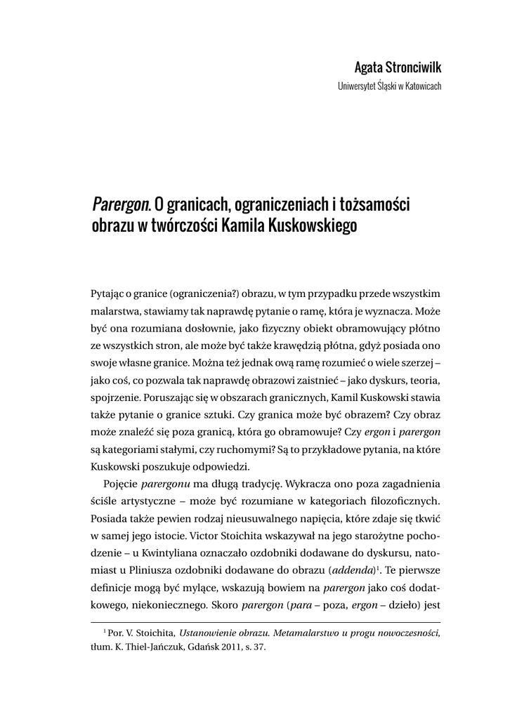 199 Agata Stronciwilk Uniwersytet Śląski w Katowicach Parergon. O granicach, ograniczeniach i tożsamości obrazu w twórczości Kamila Kuskowskiego Pytając o granice (ograniczenia?) obrazu, w tym przypadku przede wszystkim malarstwa, stawiamy tak naprawdę pytanie o ramę, która je wyznacza. Może być ona rozumiana dosłownie, jako fizyczny obiekt obramowujący płótno ze wszystkich stron, ale może być także krawędzią płótna, gdyż posiada ono swoje własne granice. Można też jednak ową ramę rozumieć o wiele szerzej – jako coś, co pozwala tak naprawdę obrazowi zaistnieć – jako dyskurs, teoria, spojrzenie. Poruszając się w obszarach granicznych, Kamil Kuskowski stawia także pytanie o granice sztuki. Czy granica może być obrazem? Czy obraz może znaleźć się poza granicą, która go obramowuje? Czy ergon i parergon są kategoriami stałymi, czy ruchomymi? Są to przykładowe pytania, na które Kuskowski poszukuje odpowiedzi. Pojęcie parergonu ma długą tradycję. Wykracza ono poza zagadnienia ściśle artystyczne – może być rozumiane w kategoriach filozoficznych. Posiada także pewien rodzaj nieusuwalnego napięcia, które zdaje się tkwić w samej jego istocie. Victor Stoichita wskazywał na jego starożytne pochodzenie – u Kwintyliana oznaczało ozdobniki dodawane do dyskursu, natomiast u Pliniusza ozdobniki dodawane do obrazu (addenda)1. Te pierwsze definicje mogą być mylące, wskazują bowiem na parergon jako coś dodatkowego, niekoniecznego. Skoro parergon (para – poza, ergon – dzieło) jest Por. V. Stoichita, Ustanowienie obrazu. Metamalarstwo u progu nowoczesności, tłum. K. Thiel-Jańczuk, Gdańsk 2011, s. 37. 1 200 Agata Stronciwilk „poza” dziełem, ergo może ono istnieć bez niego. „Ozdobnik” sugeruje rozłam pomiędzy treścią a formą, można go bowiem usunąć bez szkody dla tej pierwszej. Relacja pomiędzy parergonem a ergonem jest jednak bardziej złożona. Stoichita wskazuje na fakt, że pojęcie parergonu zostało przejęte przez XVII wieczną teorię sztuki, a Franciscus Junius określał w ten sposób martwą naturę. Ta ostatnia – określana przez Pliniusza jako „ropografia”, minoris pictura, a potem jako „ryparografia” (przedstawienie przedmiotów bezwartościowych) – długo nie była uznawana jako autonomiczny temat malarstwa. W obrazie Pokłon Trzech Króli Mistrza Marii Burgundzkiej martwa natura pełni funkcję obramienia, otaczającego właściwe przedstawienie. Niejednokrotnie zdarzało się także, iż była umieszczana na odwrociu właściwego przedstawienia. Jak zauważa Stoichita, trudno jest określić moment, w którym parergon opanowuje całą przestrzeń przedstawienia, jest to raczej proces, niż możliwy do wyodrębnienia moment2. Martwa natura już w swych początkach ma potencjał wypowiedzi meta-malarskiej – koncentruje się bowiem nie tylko na tym „co”, lecz „jak” zostaje przedstawione. Co więcej, w swych początkach także tematyzuje parergon, chociażby za pomocą malowanej ramy, niszy, okna. Tym samym komplikuje tropy, nawarstwia wątpliwości – czy malowana rama przynależy do przedstawienia, czy wyznacza jego granice? Tym samym zbliżamy się do samego sedna ambiwalencji parergonu, jako nie tylko tego co „obramowuje”, wyznacza granice, ale także jako tego, co warunkuje istnienie przedstawienia. Centrum warunkowane jest przez peryferia, które jako zewnętrzne wobec niego, jednocześnie sprawiają, że może zaistnieć „jako” centrum. Prefiks para- posiada wiele subtelności, o których pisał Joseph Hillis Miller: Para jest prefiksem przeciwstawnym, wyznaczającym zarazem bliskość i dystans, podobieństwo i różnicę, wewnętrzność i zewnętrzność […], rzecz umieszczoną jednocześnie przed i poza granicą, progiem lub marginesem, mającą równy status, a jednak podrzędną, poboczną, podporządkowaną, jak gość gospodarzowi, jak niewolnik swemu panu. Rzecz jako para nie tylko znajduje się po obu stronach granicy dzielącej wewnętrzność od zewnętrzności: sama 2 Por. tamże, s. 40. Parergon. O granicach, ograniczeniach i tożsamości obrazu... 201 również jest granicą, ekranem uczynionym z nieprzemakalnej membrany pomiędzy wnętrzem i tym, co na zewnątrz. Dokonuje ich pomieszania, pozwalając wkroczyć zewnętrzności i wyjść wewnętrzności, dzieli je i łączy3. Przytoczony cytat dobrze oddaje nieuchwytność i niejasność parergonu – który określa granice, jednocześnie sam będąc granicą. Parergon nie może być rozumiany jedynie jako to, co „poza dziełem”, jest bowiem nieodłącznie z nim związany. Co więcej, być może jako granica, to właśnie on pozwala obrazowi zaistnieć. Być może bardziej trafnym określeniem byłoby „pomiędzy dziełem”, jednak taka konstrukcja zawsze zakłada drugi człon – pomiędzy dziełem a czym? Możemy spojrzeć na ramę jako parergon – oddziela ona przedstawienie od tego, co nim nie jest. Jak pisze Stoichita „określa [rama – dop. A.S.] to, co się znajduje w jej obrębie jako świat znaczący w stosunku do świata poza ramą, będącego po prostu światem przeżywanym”4. Do którego ze światów przynależy więc rama? Odpowiedź na to pytanie nie jest oczywista – „do obu światów albo do żadnego. Rama nie stanowi jeszcze obrazu, ale nie jest też zwykłym przedmiotem należącym do otaczającej przestrzeni. Istnieje, lecz swą rację bytu zyskuje poprzez odniesienie do wyobrażenia. Nie należąc do idealnego świata wyobrażenia, czyni go jednak możliwym”5. Rama, w najszerszym rozumieniu (także jako teoria), pozwala zobaczyć obraz „jako” obraz. Rama jako wyodrębnienie z rzeczywistości warunkuje dzieło sztuki6. Problematyka „ramowania” jako oddzielania sztuki od rzeczywistości, powraca w twórczości Kamila Kuskowskiego. Ramowanie dotyczy nie tylko wyznaczania granic przestrzennych obrazu, ale także granic teoretycznych, definiowania czy