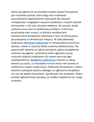 Gdzie się ogłosić by na przykład znaleźć pracę? Oczywiście jest mnóstwo portali, które dają nam możliwość wyszukiwania odpowiednich stanowisk dla naszych umiejętności i względem naszych oczekiwań. Czasami jednak korzystanie z nich jest niestety odpłatne. W sytuacji, kiedy szukamy pracy jest to dodatkowy problem. Z pomocą przychodzą nam strony, na których możliwe jest zamieszczenie bezpłatnie informacji o tym, że danej pracy poszukujemy w określonym miejscu. W zdecydowanej większości darmowe ogłoszenia to niesamowicie pomocna sprawa, nawet w sytuacji kiedy szukamy właśnie pracy. Na pewno jeśli właśnie na takich portalach, gdzie nieodpłatnie możemy się ogłosić, umieścimy wiele ogłoszeń, pracę znacznie szybciej znajdziemy niż nawet sami się tego spodziewaliśmy. Bezpłatne ogłoszenia również w takiej kwestii są czymś, co niezwykle mocno może nam pomóc w znalezieniu nawet nowej pracy. Polecamy korzystanie z takich właśnie rozwiązań właśnie dlatego, że ogłoszenie bezpłatne nic nas nie będzie kosztować. Spróbować nie zaszkodzi. Dobre portale ogłoszeniowe sprawią, że szybko znajdziemy to, czego szukamy.